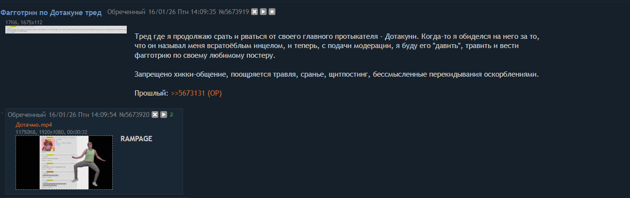 https://2ch.life/rf/res/5664164.html Зачем Дотачмо убежало сюда и засрало тред? Потому что ДК это травитель и засеруха. Тащит свои лички и конфликты по всему разделу.