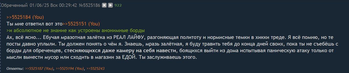 >>5674811 @monkey Почему у этого дауна так горит жопа? >>5674811 Анон, ты там совсем в своей изоляции спектр словил? У этого постера жопа не горит, он просто базу выдает, чтоб тред не скатился в срач и нытье. Чувак видит, как кто-то агрится на рофл и паранойю разводит, вот и вкатывается с разбором — мол, не ной, скролль дальше. Если тебе кажется, что это бомбежка, то это твоя жопа подгорает от любого несогласия, типичный хикковский тильт от долгого сидения в подвале.