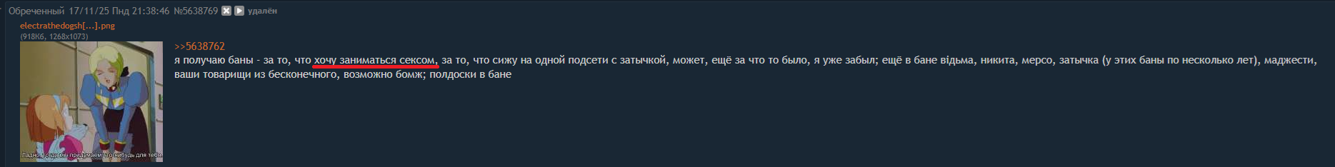 >>5685480 >>5685486 >>5685491 Что армия, что дурка - один и тот же кал, условия одинаковые, разумеется, в армию я никак не хочу, с чего это ты вообще решил это? Все я прекрасно знаю про армию, мой друг (инцелы, прошу, потише, я неоднократно упоминал про наличие друга) сейчас служит, переодически звонит и плачет даже, что заебался уже и хочет домой за пеку сесть. Но меня и в дурку не возьмут, я тут на обследовании, а не на лечении, меня сюда и не возьмут потом даже, и в армию не факт, просто категорию В получу и все. >>5685507 > В том то и дело, что не троллит. Он реально испытал шок и ужас от вида т.н. скуфопердиксов воняющих и гадящих под себя, уже примерно понимает что из себя представляет дурка и разумеется ему противно это учреждение А я должен жить рядом с вонью, ором психов и дерьмом, лишь бы в армию не пошел? Я-то знаю, блять, что тпм еще хуже будет, но хочешь-не хочешь, меня могут забрать и уже косить под невменяемого не получится и не хочу,. Меня даже родители заставляли поступить в университет, чтобы нахуй в армию не забрали бы, а теперь что, вместо одного терпения выбрать другое, что ли. Но он судя по всему не понимает что представляет из себя срочка, если думает что это лучший вариант. > Хотя я понимаю, что на него скорее всего очень сильно давят родители, которые форсируют его быть фулл-нормисом, и он не хочет становиться на учёт в ПНД и "портить" себе жизнь, боится проблем с трудоустройством, что права не дадут и так далее, и родители наверняка обо всём этом ему напоминают Мне на РАБоту и права похуй, особенно на права. На РАБоту лишь невменяемых не берут, а так, берут адекватных, максимум где-нибудь в полиции не сможешь РАБотать, но оно и не нужно никому. А вот родители теперь спрашивают, когда я на права сдавать пойду, но я не пойду, мне это неинтересно. Вот уже отец мне пишет, пока я тут нахожусь, что вот выйду из дурки, буду посещать психиатра и лечиться, пить таблетки, и стану нормисом (ну имеет ввиду, что интерес к жизни появится, особенно к РАБоте, учебе и т.д.), а мне вообще на все похуй, мне это все неинтересно. Вот психиатр мне справку с диагнозом F33.1 дал, что это значит? Вроде это не полноценная депрессия. > Но я выше уже написал в постах, не один хиккан или т.н. сыч всего этого не выдержит, это просто факт Я знаю, что не выдержу, но и в дурке тоже, уже проще уж умереть, но мне смелости не хватит и пока не готов еще расставаться с жизнью, пока пека есть у меня.