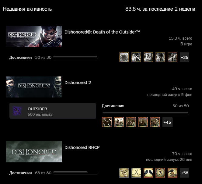 >>5685796 >Или вот в первом Dishonored у меня всего 78% ачивок, но по факту я игру прошёл на истинные 100%. Хз, я смотрю на эту шкалу ачивок и ощущаю дискомфорт, ощущение того что я не прошел игру на 100%.