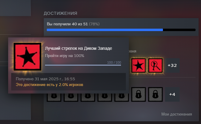 >>5685787 Сто процентов не равно 100% ачивок. Во многих играх в 100% ачивок не входит каждый возможный коллектибл, или например прохождение каждого возможного квеста/доп миссии и много чего ещё в них не входит. Можно выбить 100% ачивок, при этом попробовав лишь 50-60% контента игры, поэтому ачивки это вообще не показатель. Я прохожу на именно истинные 100%: собираю всё что можно собрать, пылесошу весь возможный контент, а ачивки - опционально. Кроме того, есть игры вообще без ачивок, которые я также прохожу на истинные 100%, например первые Divinity. И в принципе у меня много старых игр на 100% пройдено в которых нет ачивок в принципе. Или вот в Dishonored 2 например нет ачивки на сбор всех коллектиблов, на сбор всех рун, а я тщательно собирал по гайду весь лут ради истинных 100%. Или вот в первом Dishonored у меня всего 78% ачивок, но по факту я игру прошёл на истинные 100%.