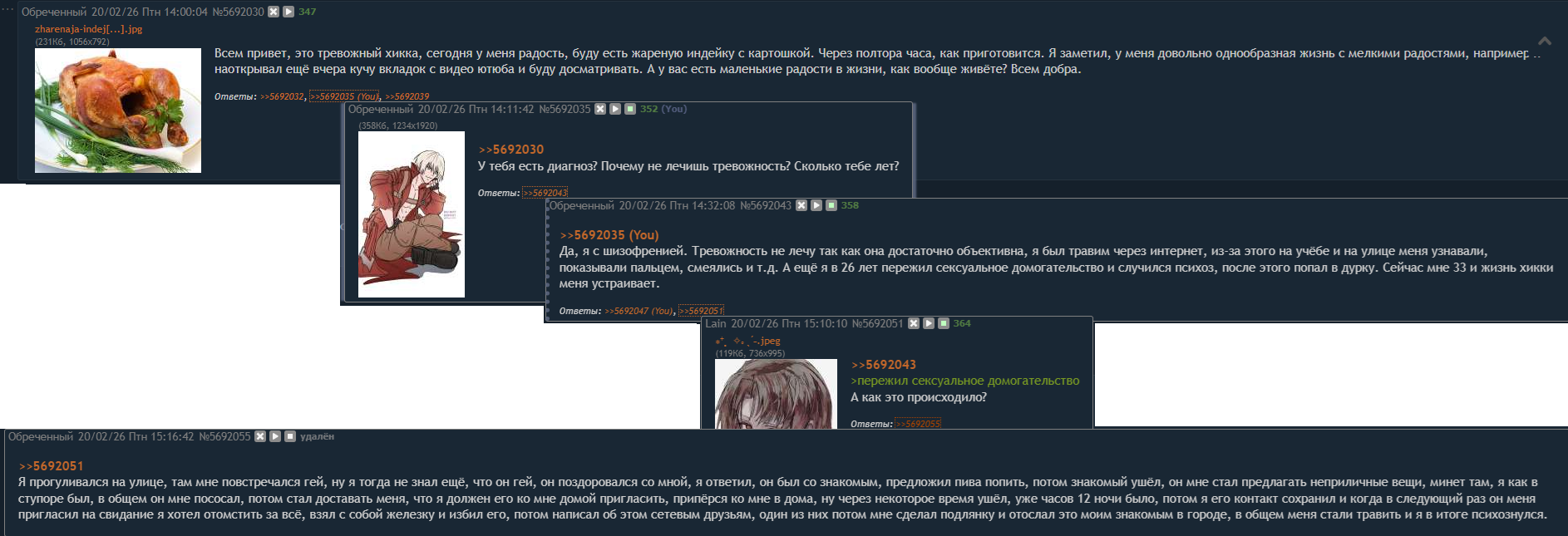 >>5692035 Да, я с шизофренией. Тревожность не лечу так как она достаточно объективна, я был травим через интернет, из-за этого на учёбе и на улице меня узнавали, показывали пальцем, смеялись и т.д. А ещё я в 26 лет пережил сексуальное домогательство и случился психоз, после этого попал в дурку. Сейчас мне 33 и жизнь хикки меня устраивает.