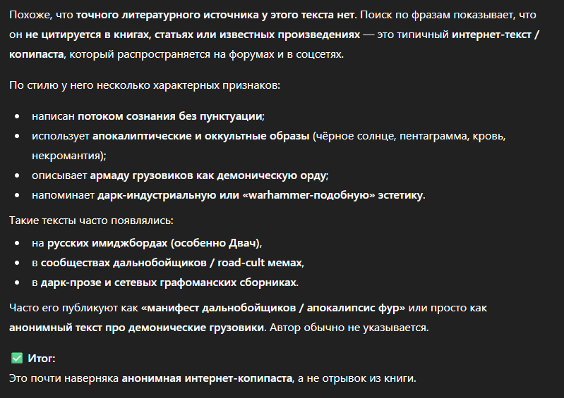 армады стальных чудовищ грузовиков-демоном вздымающие свои кабины к небу морды этих адских псов плоть их гусениц и колёс перетекает мутирует пульсирует чёрной некромантической кровью высосанной из глубин земли из скважин уходящих прямо в бездну разрывают этот мир своими стальными челюстями пентаграмм выжжена на небесной тверди в огненном круге чёрного солнца освещающего свой путь для армии псов-каннибалов и каждый отрезок асфальта полит кровью тех кто пытался остановить неминуемое стал частью дорожного гниющего полотна грохочут тысячи тонн стали разрывая воздух в клочья их кости стали частью машин их черепа украсили кабины их кровь смешалась с топливом и горела оставляя огненный след величия питайте асфальт кровью братья и сёстры сквозь ночь сквозь время сквозь саму смерть не замечая преград