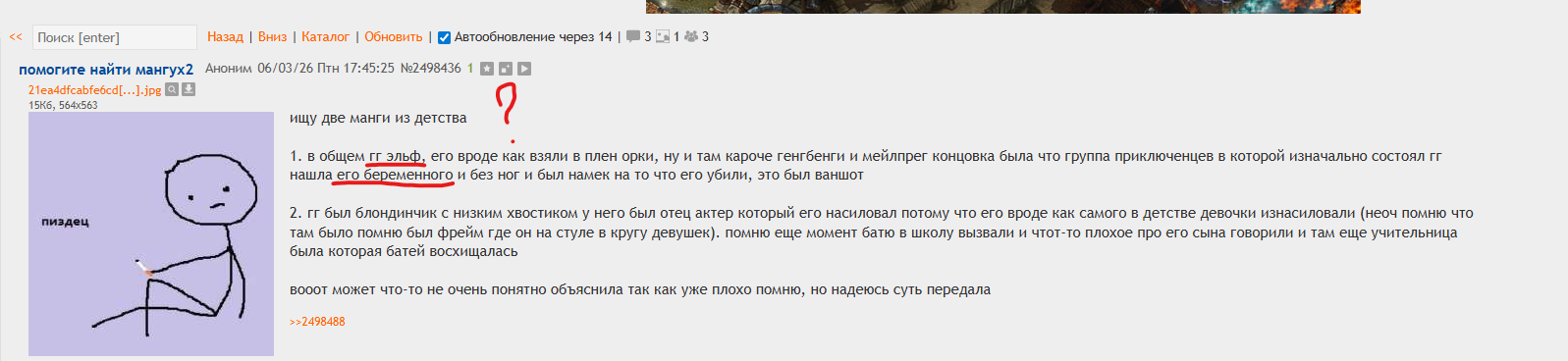 >>5697833 >там не надо сидеть, заходишь в каталог Ну дык заходить в каталог практически тоже самое что сидеть ридонли и выискивать норм треды - странная и иррациональная затея, как в выгребной яме искать драгоценности - не факт что найдешь золотое кольцо, но гарантированно пропитаешься нечистотами. Да даже в "норм" тредах с шебмками все равно будут сидеть быдло-нормисы и постить свои норми-быдло-вебмки. Но в принципе если психика позволяет, то норм, дело твое конечно. Но я лично триггерюсь от отвращения к быдло-нормисам и уже давно отказался идеи "просто зайди и посмотреть какие там треды" - только настроение портить и провоцировать у самого себя приступ радикальной мизантропии.