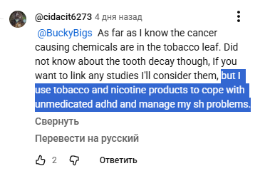 Ну вот, еще один пишет что ему никотин от СДВГ и сэлфхарма помогает. Оказывается, помимо всего прочего СДВГ это понижение мотивации и трудности с началом деятельности. Возможно то, что я принимаю за дефект воли, на самом деле является следствием тяжелого СДВГ. По крайней мере гиперфокус от СДВГ у меня уже давно проявляется. Эх, реально такими темпами вернусь к курению...