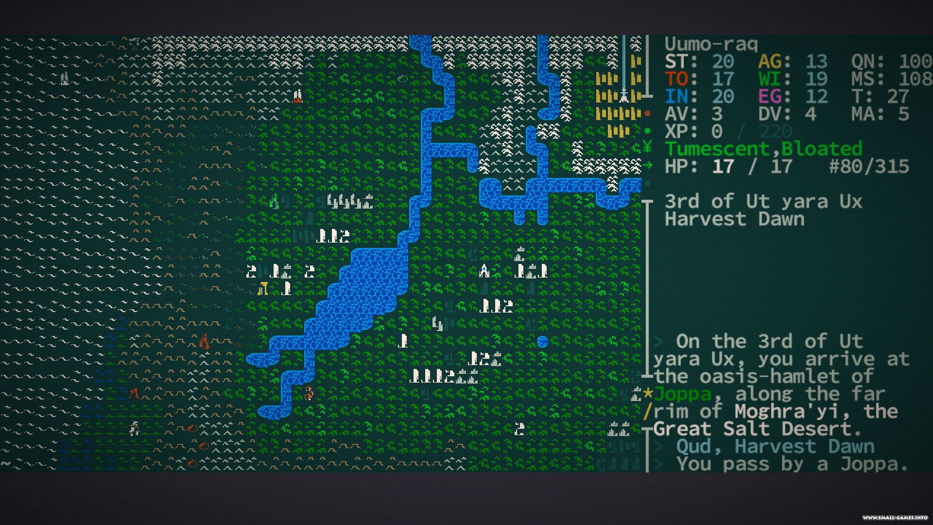 Роганы, свершилось! Тот самый Caves of Qud ожил. Я даже и не знаю пока, что изменилось. Но, как минимум, прикрутили вполне себе интересную графику. Хотя там и оригинальная на редкость приятной была. И стоит заметить, что и старая версия была вполне годной и играбельной. А к тому же ещё и очень атмосферной. Так что сейчас, вероятно, всё стало только лучше. На всякий случай вброшу список особеннотей для незнакомых с этой годнотой: >• Anything and everything. Caves of Qud is a deeply simulated, biologically diverse, richly cultured world. • Assemble your character from over 70 mutations and defects and 24 castes and kits—outfit yourself with wings, two heads, quills, four arms, flaming hands, or the power to clone yourself—it's all the character diversity you could want. • Explore procedurally-generated regions with some familiar locations—each world is nearly 1 million maps large. • Dig through everything—don't like the wall blocking your way? Dig through it with a pickaxe, or eat through it with your corrosive gas mutation, or melt it to lava. Yes, every wall has a melting point. • Hack the limbs off monsters—every monster and NPC is as fully simulated as the player. That means they have levels, skills, equipment, faction allegiances, and body parts. So if you have a mutation that lets you, say, psionically dominate a spider, you can traipse through the world as a spider, laying webs and eating things. • Pursue allegiances with over 60 factions—apes, crabs, robots, and highly entropic beings—just to name a few. • Follow the plot to Barathrum the Old, a sentient cave bear who leads a sect of tinkers intent on restoring technological splendor to Qud. • Learn the lore—there's a story in every nook, from legendary items with storied pasts to in-game history books written by plant historians. • Die—Caves of Qud is brutally difficult and deaths are permanent. Don't worry, though—you can always roll a new character.
