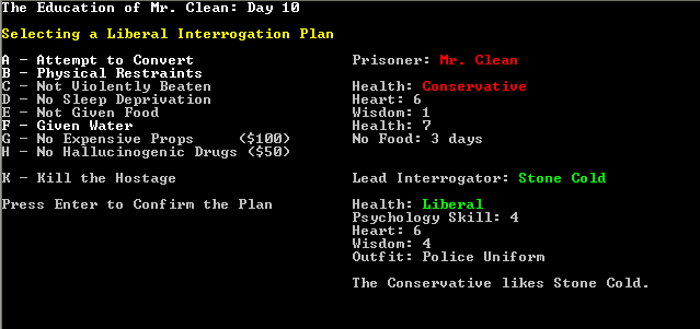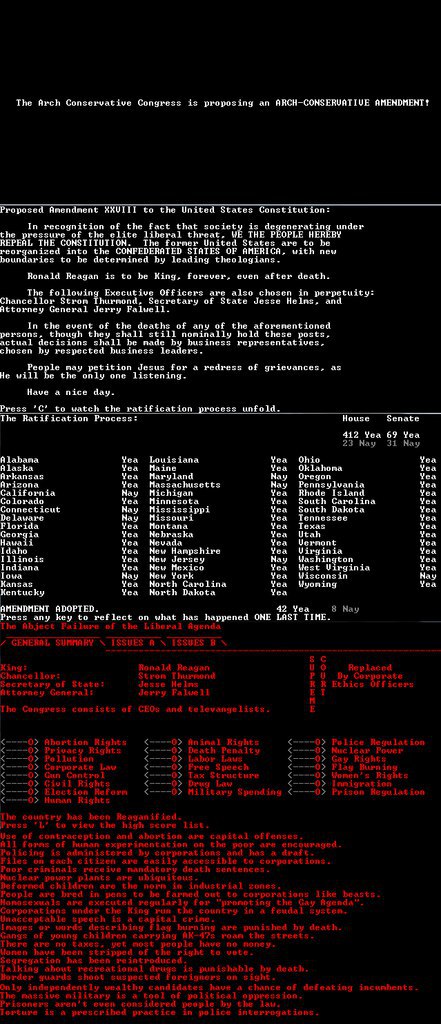 Liberal Crime Squad — сатирический текстовый современный стратегический политический рогалик с открытым кодом, тупым набором шаблонов и ASCII графикой. Вы играете за основателя террористической группировки левого крыла, преданного делу спасения Соединенных Штатов от падения в пучину Консервативного Безумия, с помощью печатания газет, волонтерской деятельности, исполнения протестной музыки, обольщения, граффити, хакерства, похищения, убийств, пыток, промывания мозгов и других традиционных и нетрадиционных активных активностей.