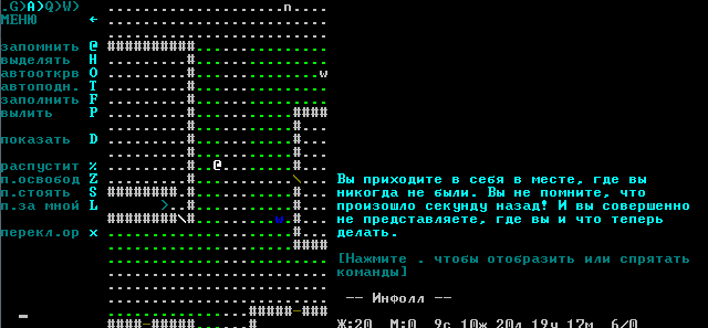 Тактические советы: 1) Предметы нужно как можно быстрее опознавать. Найденной палочкой надо сразу стрелять (только не в стену, а чтобы было свободное пространство. Стреляйте, пока не кончатся заряды. Текущее число зарядом видно не будет, но вы хотя бы узнаете, какого она уровня. Кольца одеваете и ходите некоторое время -- кольцо опознаётся. Будьте внимательны, оно может быть проклято -- на этот риск приходится идти. Свитки все относительно безопасны, только проверьте, что у вас есть то, что вы хотите "прокачивать", если свиток окажется свитком "прокачки" (Scroll of Upgrade) и что вам есть что опознавать, если это окажется свиток идентификации (Scroll of Identify). Вот с зельями сложнее всего. Есть три опасных зелья -- зелье жидкого огня (Potion of Liduid Flame), зелье токсичного газа (Potion of Toxic Gas) и зелье парализующего газа (Potion of Paralytic Gas). Для борьбы с первым, нужно стоять на клетке с водой. Для борьбы со вторым ничего делать не надо, но лучше стоять поближе к деври, чтобы если это окажется он, выйти из комнаты (наружу газ не выходит). С последним бороться никак нельзя, единственное спасение -- пить то, что может оказаться парализующим газом, в первой комнате уровня, когда вы туда только спустились. Там никогда не бывает монстров, а все монстры на уровне на тот момент спят. Шатающиеся монстры ещё не сгенерированы. Таким образом, вероятность прихода "гостей" минимальна. 2) На уровнях бывают специальные комнаты. Если вход в комнату закрыт книжной полкой (1 клетка) или "досочной баррикадой", то где-то на уровне есть зелье жидкого огня (Potion of Liduid Flame) -- его надо кинуть в баррикаду. Если есть комната, где рыбы, то где-то на уровне есть зелье невидимости (Potion of Invisibility). Наконец, если есть комната с пустотой вместо пола или кучей ловушек (и все одинаковые), то где-то на уровне есть зелье левитации (Potion of Levitation). На практике это означает, что ни в коем случае нельзя пить незнакомые зелья, пока вы не осмотрели весь уровень! Если осмотрели и нашли одну такую комнату и у вас ещё не опознано соответствующее ей зелье, то подходите к комнате и пейте/бросайте незнакомые, пока не получите нужный эффект. Если комнаты две и ДВА неопознанных зелья, то тут как повезёт -- одна комната может остаться необокраденной. Тогда придётся на следующих уровнях искать аналогичное зелье (оно уже будет опознано), а потом возвращаться. 3) Что покупать и не покупать в магазинах? Не покупать: а) еду -- она менее питательна, чем обычная, зато денег потратите б) Анх (Ankh) -- по идее он дарует воскрешение, НО вы теряете весь инвентарь кроме того, что на вас было надето. Это очень, очень печально. Осмысленность Анха сомнительна. в) Оружие, доспехи -- вне магазина можно найти то же самое. Покупать: а) зелья лечения (Potion of Healing). б) балансировочный камень -- Weightstone. Во-первых, им можно улучшить оружие, если его применить, во-вторых, он сбрасывает деградацию, если вы играете с деградацией. в) зелья, свитки какие нужны. Но не про запас, а в случае необходимости. Если там есть неопознанные свитки/зелья, особенно больше одной штуки -- берите! Неопознанные -- дешевле. г) Сумки для семян, палочек и свитков (в каждом магазине по одной -- Seed Pouch, Scroll Holder, Wand Holster). Во-первых, вы экономите ячейки инвентаря. Во-вторых, сумка для свитков, к примеру, защищает их от огня. Ваш свиток прокачки больше не сгорит в жидком пламени! 4) Обязательно нужно разобраться с применением дверей. Е
