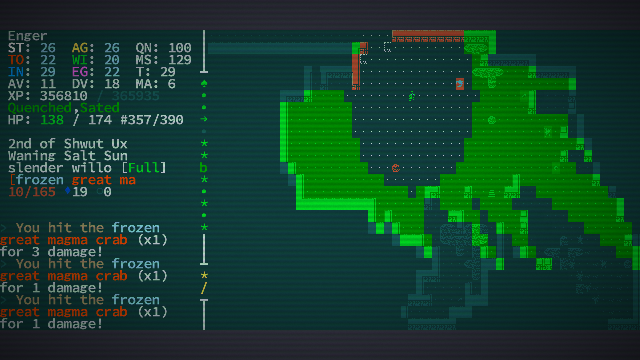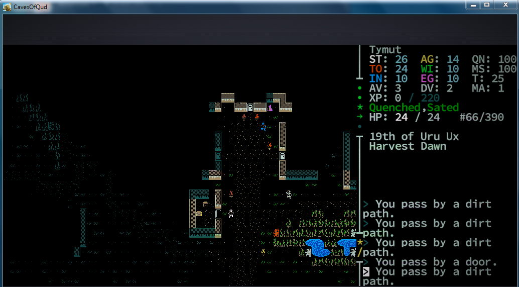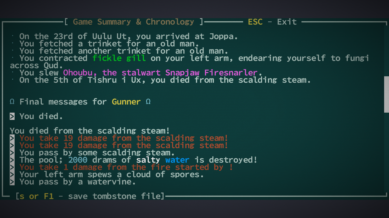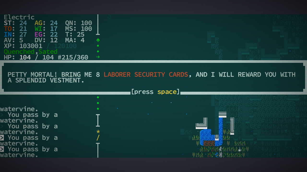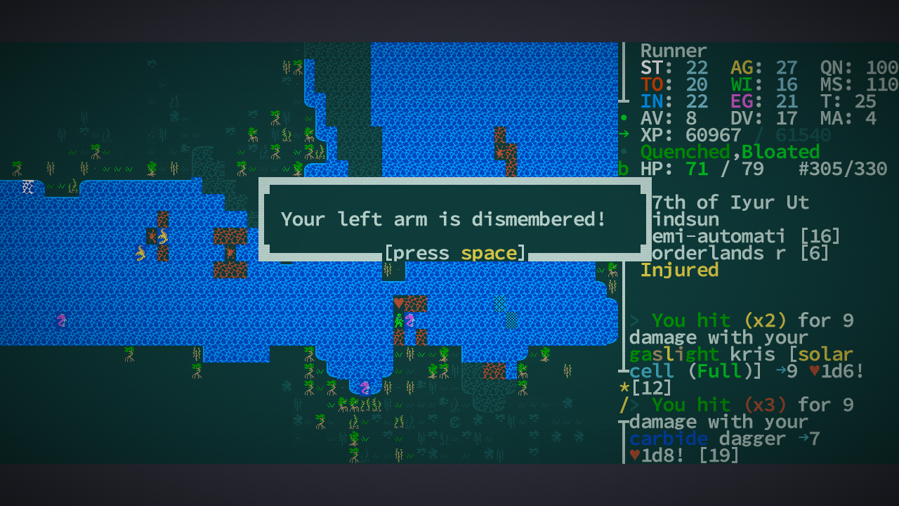 Роганы, свершилось! Тот самый Caves of Qud ожил. Я даже и не знаю пока, что изменилось. Но, как минимум, прикрутили вполне себе интересную графику. Хотя там и оригинальная на редкость приятной была. И стоит заметить, что и старая версия была вполне годной и играбельной. А к тому же ещё и очень атмосферной. Так что сейчас, вероятно, всё стало только лучше. На всякий случай вброшу список особеннотей для незнакомых с этой годнотой: >• Anything and everything. Caves of Qud is a deeply simulated, biologically diverse, richly cultured world. • Assemble your character from over 70 mutations and defects and 24 castes and kits—outfit yourself with wings, two heads, quills, four arms, flaming hands, or the power to clone yourself—it's all the character diversity you could want. • Explore procedurally-generated regions with some familiar locations—each world is nearly 1 million maps large. • Dig through everything—don't like the wall blocking your way? Dig through it with a pickaxe, or eat through it with your corrosive gas mutation, or melt it to lava. Yes, every wall has a melting point. • Hack the limbs off monsters—every monster and NPC is as fully simulated as the player. That means they have levels, skills, equipment, faction allegiances, and body parts. So if you have a mutation that lets you, say, psionically dominate a spider, you can traipse through the world as a spider, laying webs and eating things. • Pursue allegiances with over 60 factions—apes, crabs, robots, and highly entropic beings—just to name a few. • Follow the plot to Barathrum the Old, a sentient cave bear who leads a sect of tinkers intent on restoring technological splendor to Qud. • Learn the lore—there's a story in every nook, from legendary items with storied pasts to in-game history books written by plant historians. • Die—Caves of Qud is brutally difficult and deaths are permanent. Don't worry, though—you can always roll a new character.