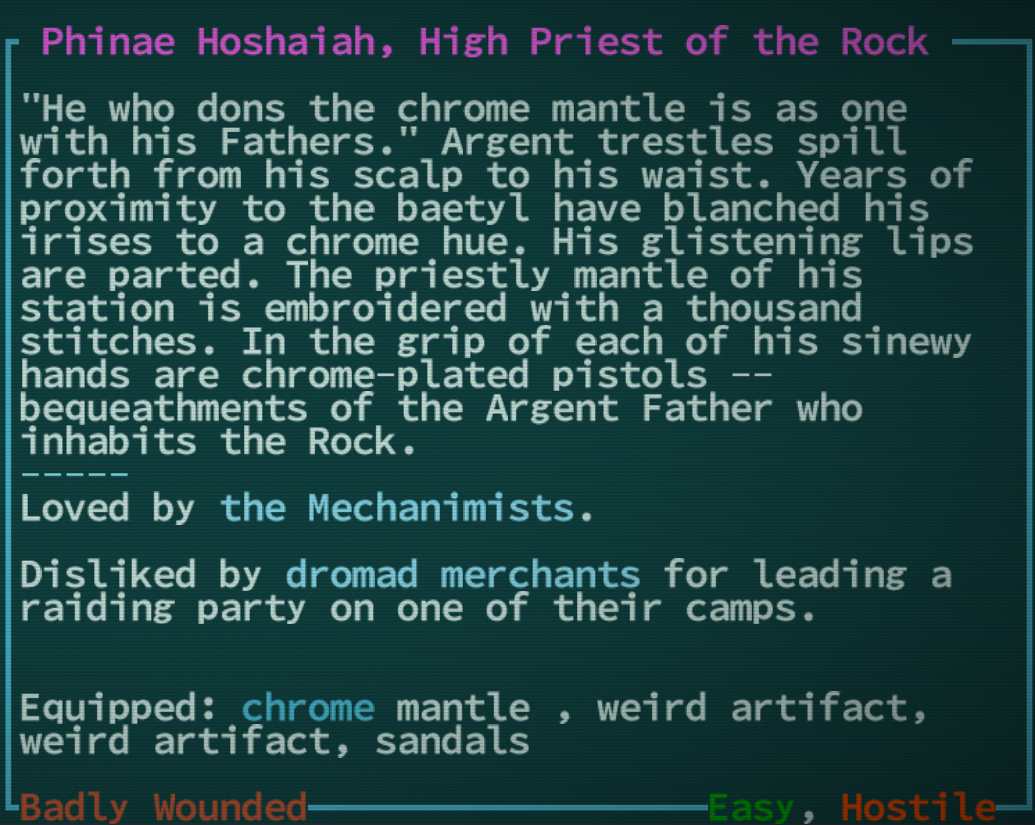 анон, поясни >• Anything and everything. Caves of Qud is a deeply simulated, biologically diverse, richly cultured world. вот это же по факту пиздёж, карта залочена, экраны генерируются по ходу игры, нихуя deeply simulated вообще в игре нет?