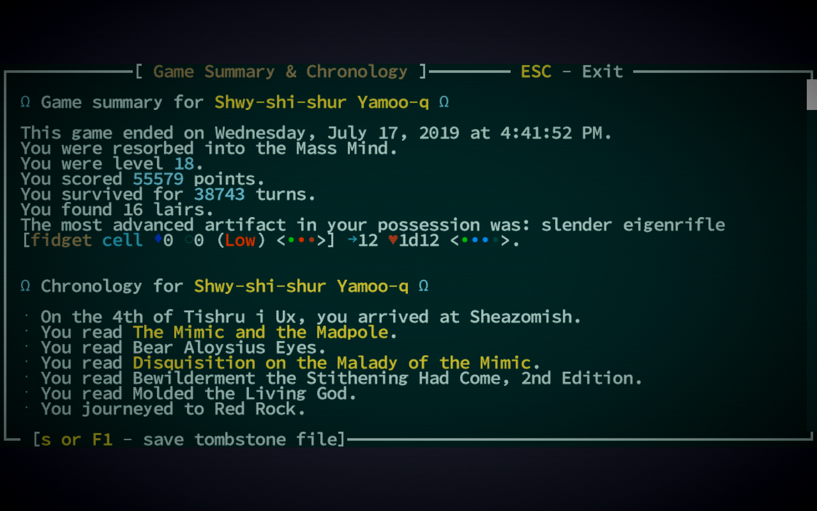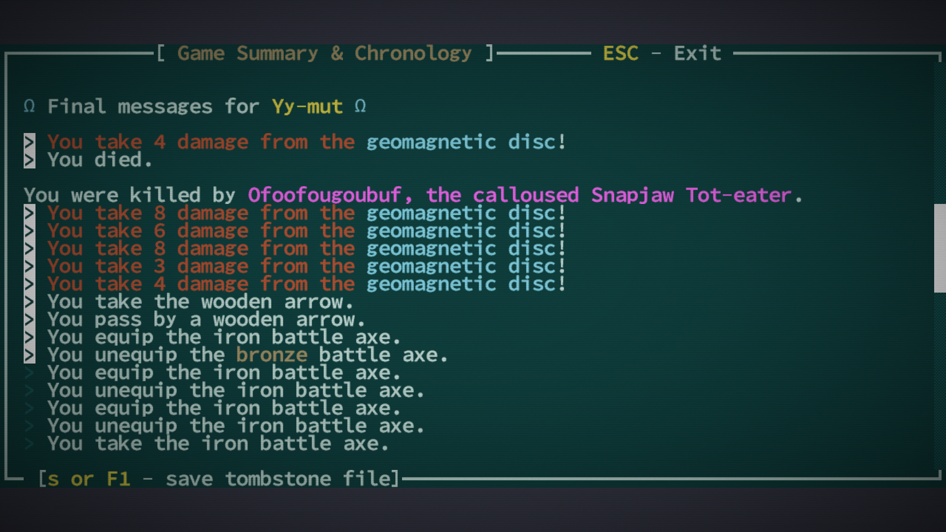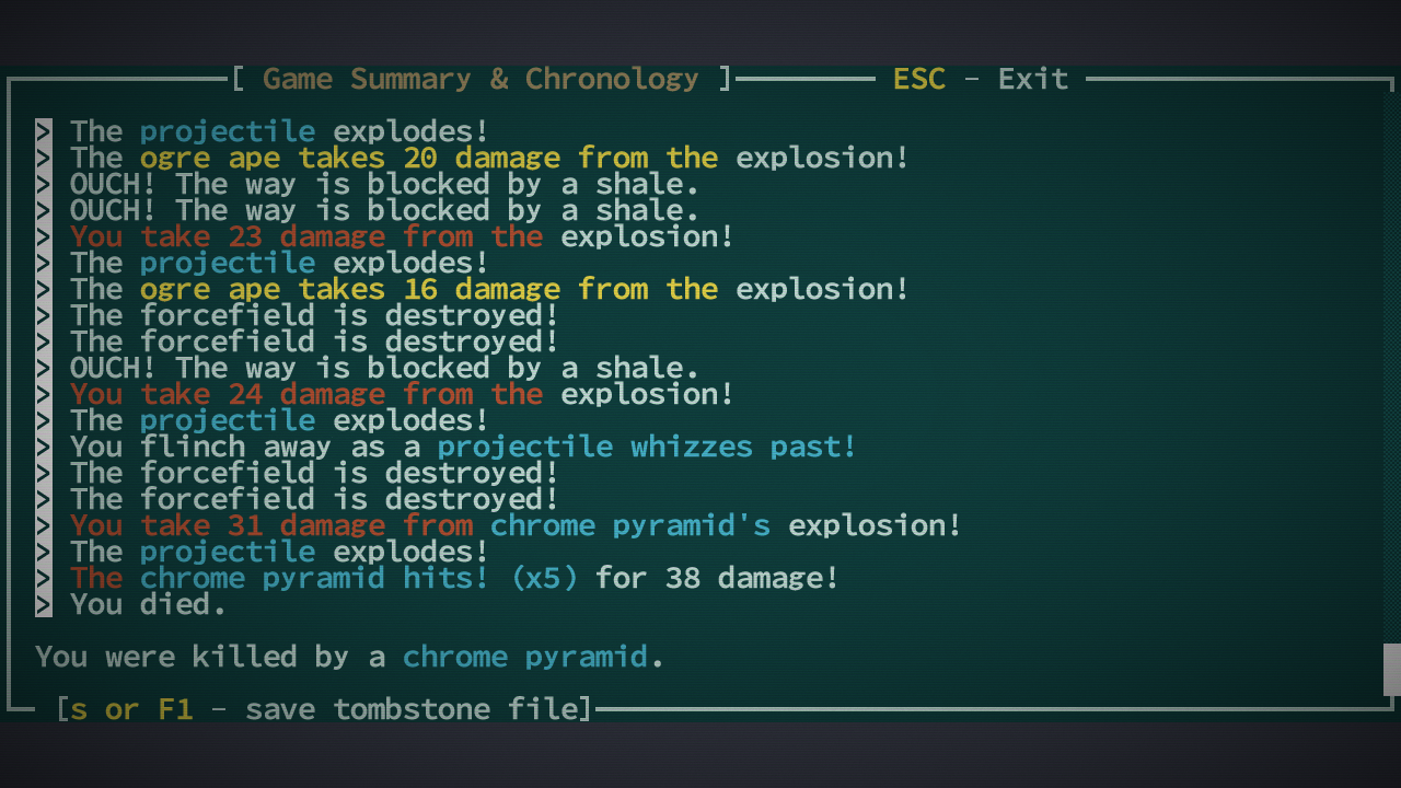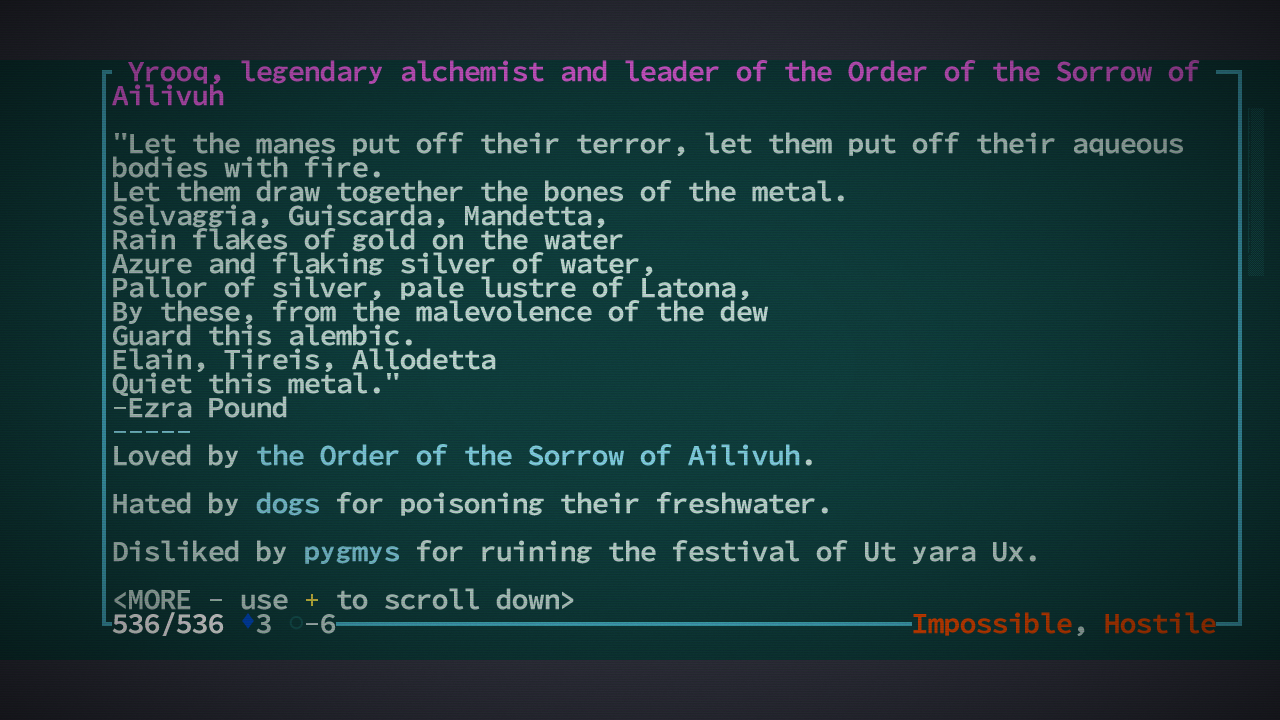 >>34637 Не вижу ничего плохого в том, чтобы читать вику по рогалику. Для меня это такое же удовольствие, как и собственно игра. Некоторые вещи ты за 10 лет в бочке даже не попробуешь ни разу, потому что не подозреваешь об их существовании. Вместе с тем нельзя прочитать абсолютно обо всех нюансах, так что дух приключений остается. И баттхерт от смертей.