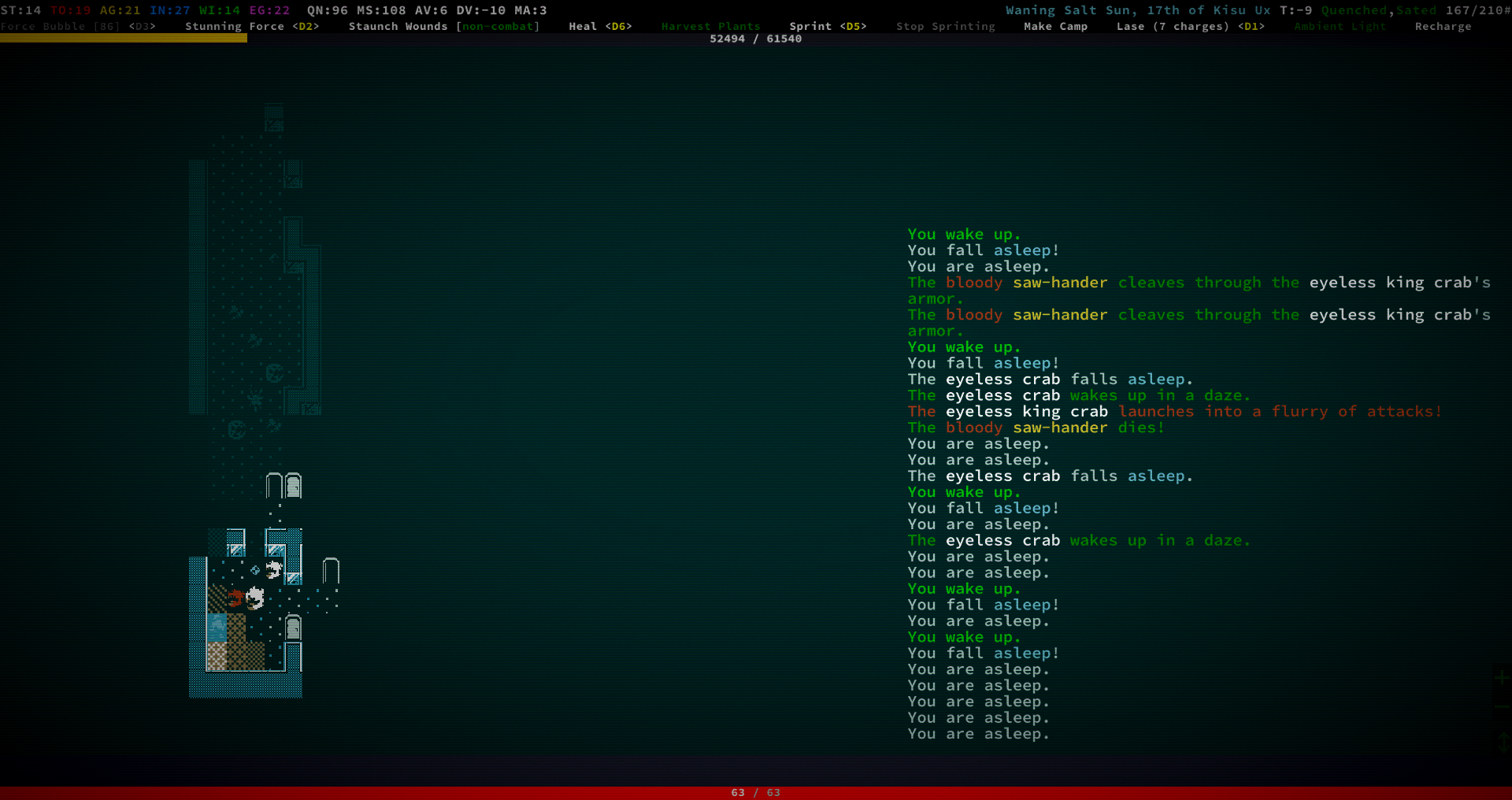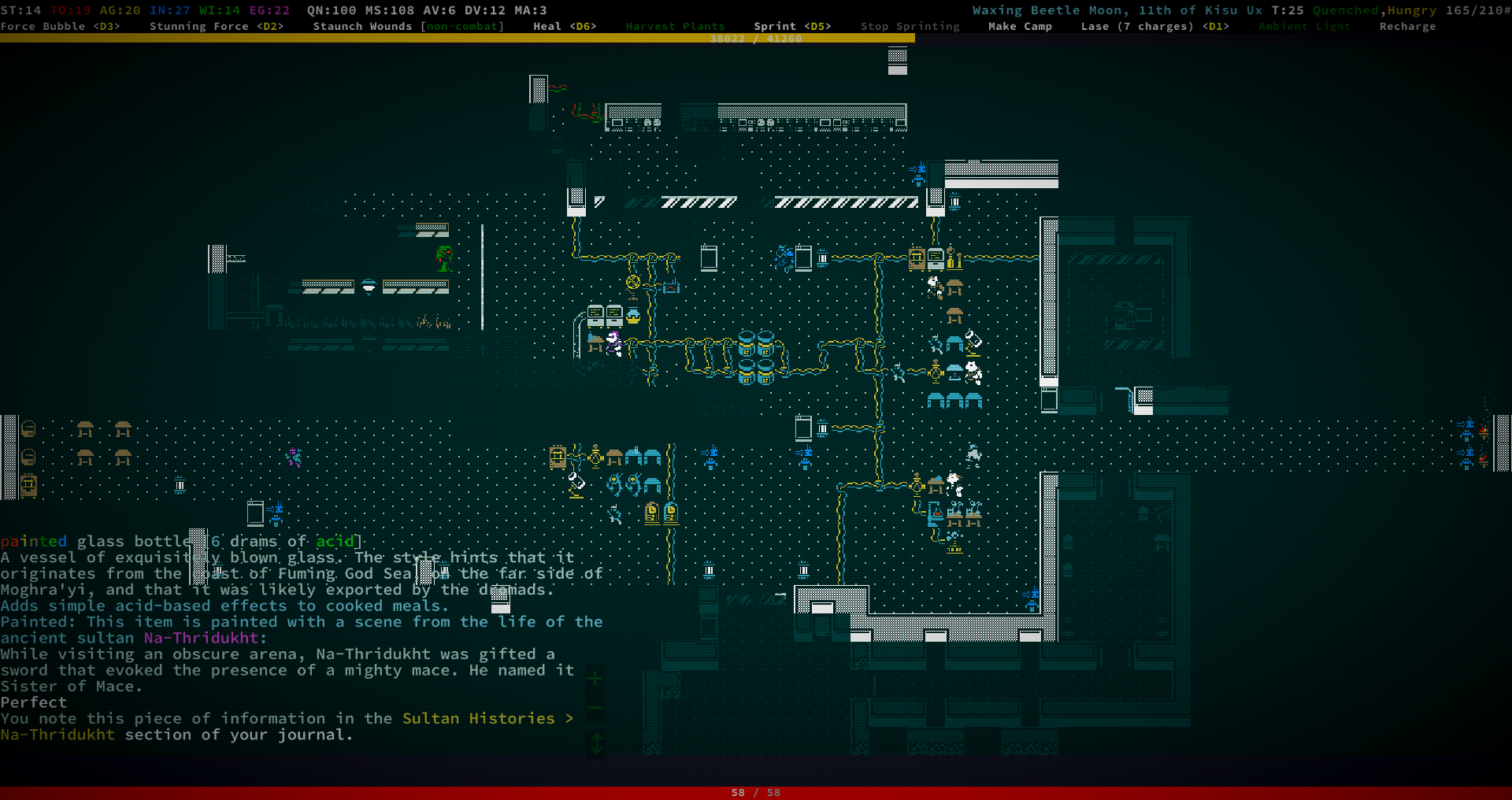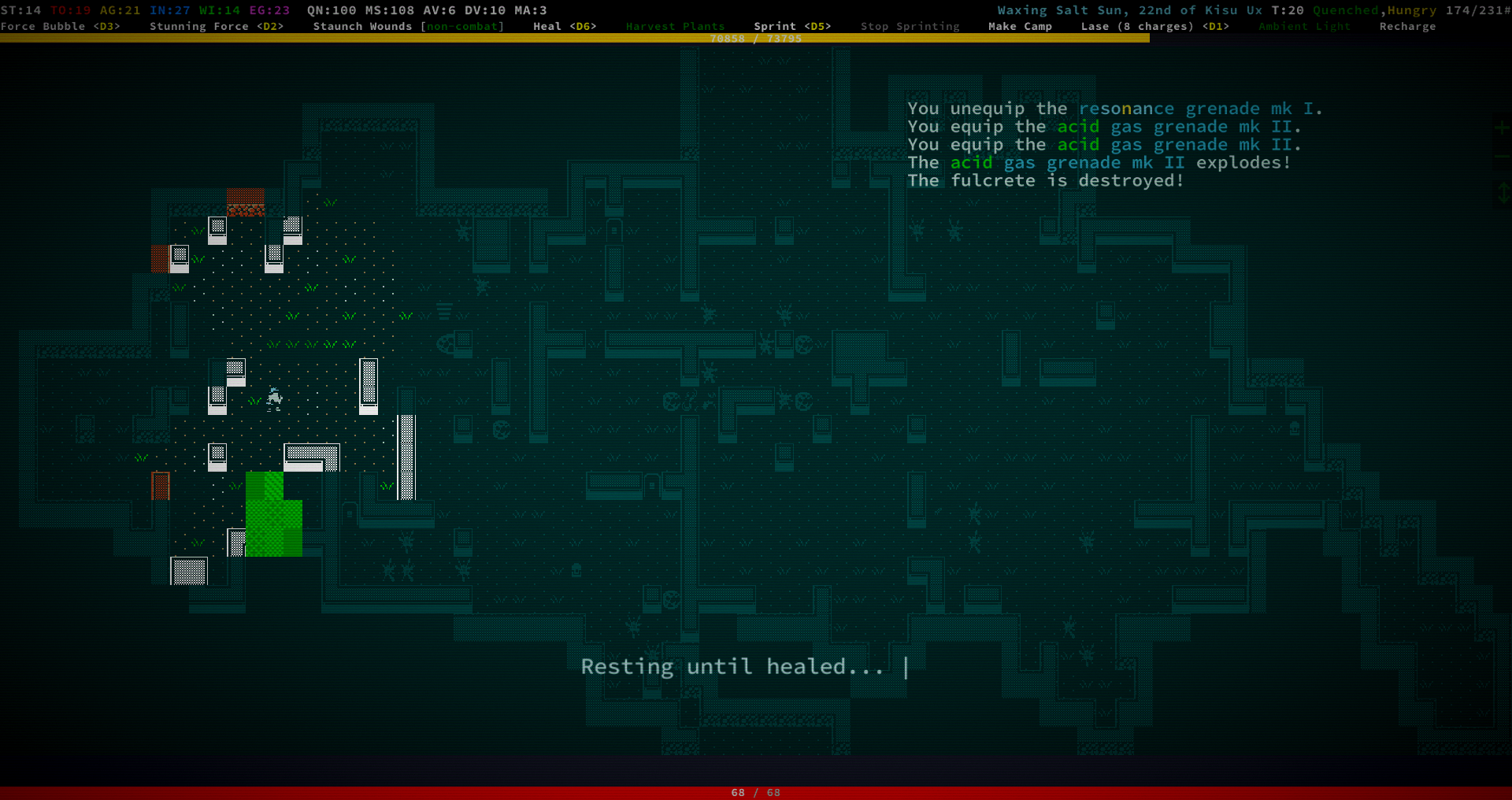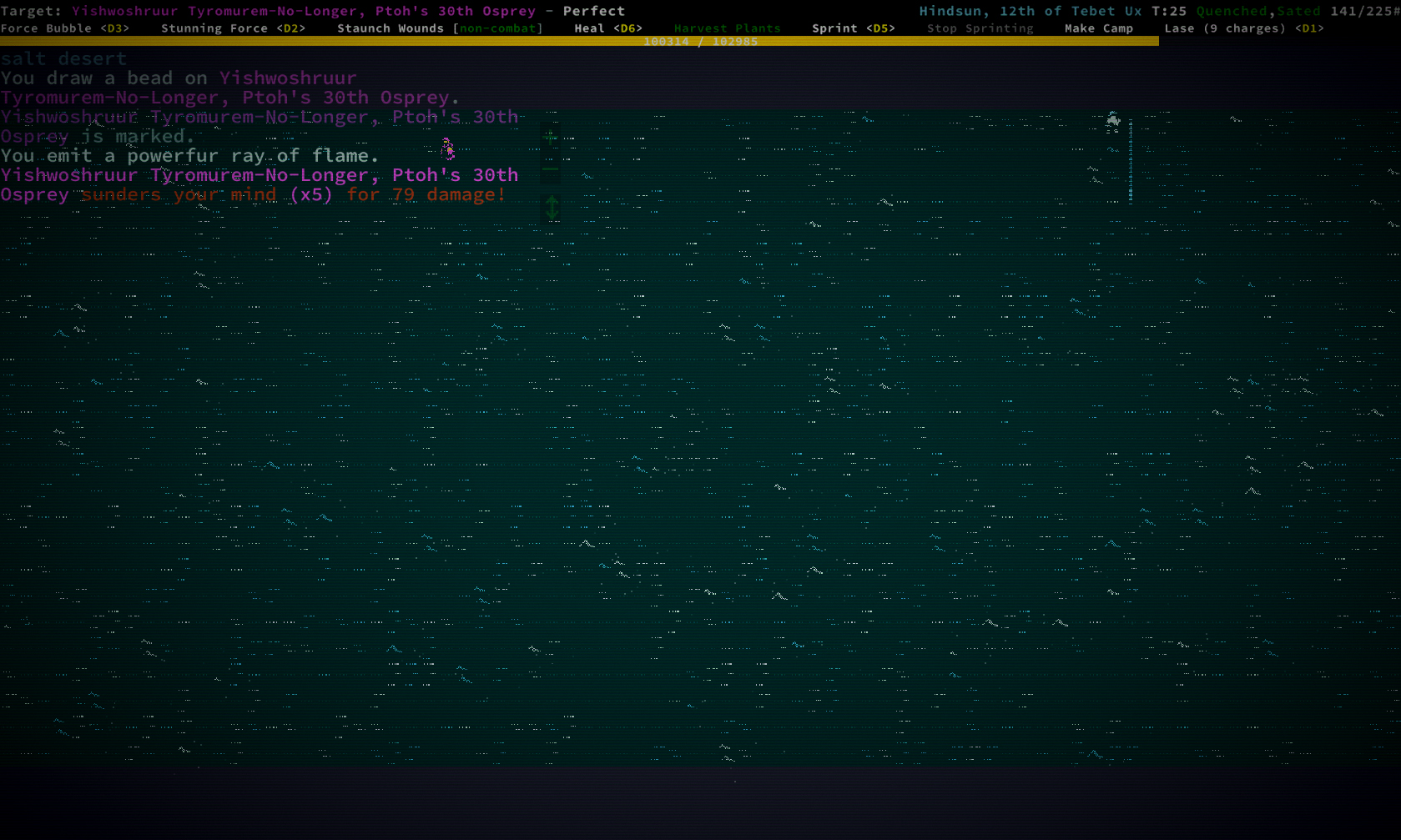 Закончив все квесты я решил углубится в пещеры, пошел в те, что спавнятся в городских руинах. Первые двадцать этажей всё было довольно стандартно, падает броня и оружие 5-6 тира, ядерные батарейки и другие тир 6 предметы, также обычно тут спавнятся Райноксы, но в этот раз обошлось. После 20 этажа начали падать тир 7-8 предметы, сначала нашел парочку антиматтер батареек, а потом и фазовую пушку с метастил оружием, начали спавнится Кракены, толстые черепахи и Магмовые крабы в больших количествах, первые два монстра всегда были нейтральны, поэтому проблем не вызывали, но я таки сагрил парочку эксперимента ради. Крякен легко расстреливается из фазовой пушки, в ближний бой лучше не лезть, у него пробивание что-то около 37, легко может перекусить на ~250 урона. Черепахи очень толстые и наносят сильный урон в ближнем бою, пробиваются с фазовой пушки, но слишком слабо, лучшая тактика против них — заморозить их замораживающим лучом и бросать в них резонансные гранаты, пока они не умрут, правда надо быть осторожным, гранаты часто наносят урон и игроку, МК3 могут запросто ёбнуть на 100 урона, также они игнорируют силовое поле, луч после пары выстрелов может заморозить пользователя, надо следить за температурой. С Магмовыми крабами всё несколько труднее, у них больше брони чем у черепах и кракенов, есть две клешни и флури, каждая клешня бьёт по ~70 урона, так что в ближний бой опять же лучше не лезть. Они почти не пробиваются фазовой пушкой, поэтому нужно использовать резонансные гранаты, причем даже они пробивают всего на ~50 урона, тактика как и с черепахами — заморозить лучом и кидать гранаты до победного, ещё можно использовать ВИБРИРУЮЩЕЕ ЛЕЗВИЕ так как у них не так много ХП, но тогда нужнр использовать блейз инжекторы и нужно следить за тем, чтобы краб не разморозился пока ты тыкаешь в него виброблейдом. На ~45 этаже впервые заспавнился импоссибл тир монстр — Хитросмотрщий Сталкер, брони больше чем у Магмового Краба, ХП почти как у черепах, имеет Бласт Кэннон, который работает по принципу мутации "Станнинг форс", наносит довольно слабый урон, но может застанить на пару ходов, эта пушка обходит силовое поле, поэтому лучше иметь скилл на резист к стану, иначе можно из состояния стана в принципе не выйти, впоследствии медленно умерев без возможности сделать что-либо. МК3 ЭМП гранаты выводят его из строя только на 3-4 хода, поэтому использовать их большого смысла нету и стоит сразу перейти к уже хорошо известной тактике с замораживающим лучом и резонансными гранатами, правда замораживаться он сразу не хочет, нужно 4-5 попаданий и опять же, надо следить за собственной температурой чтобы случайно не заморозить себя. Стоит отметить, что точность у Бласт Кэннон очень низкая, на дистанции в 6-7 клеток и с 18 дв он попадал по мне или около меня только один раз из трёх выстрелов, так что большой опасности он не представляет и от него всегда можно убежать. Собственно на этом спуск я и закончил, так как не хотел нарваться на хромированную пирамиду, да и на тот момент я уже нашел всё то, что мне было нужно. Проапгрейдив новую броню и оружие я устремился к последнему рандомному храму, но мне не повезло и он сгенерировался прямо на горах на которые нельзя забраться. Механические крылья также не позволили мне облететь горы и поэтому остался только один вариант — пробивать огромное 