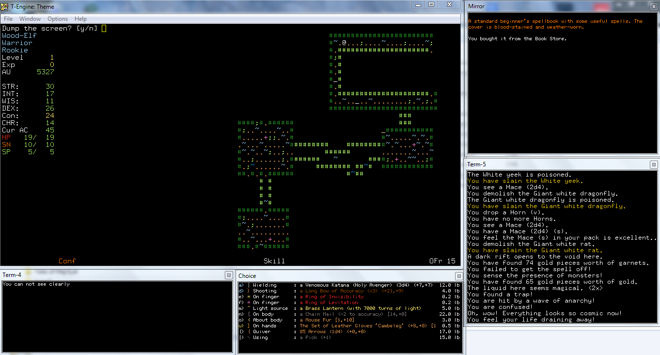 >>11228 Переключать табы на каждый чих? Может с тайловым ВМ и можно добиться аналогичного пикрелейтеду эффекта, но сдается мне это будет очень не просто. Иметь все нужное перед глазами это архиудобно. Лог чтобы не наяривать пробел каждый ход тыкая по [more], рекол чтобы сразу видеть кого чем бить, и, самое главное - список мобов. Возможность увидеть уника сразу как ты войдешь в комнату с толпой однотипных мобов буквально спасает жизни. Постоянно. (На пике этого нет, но это исключительно посченговские заморочки - у него панель со списком видимых мобов не работает, но в ванили все ок).