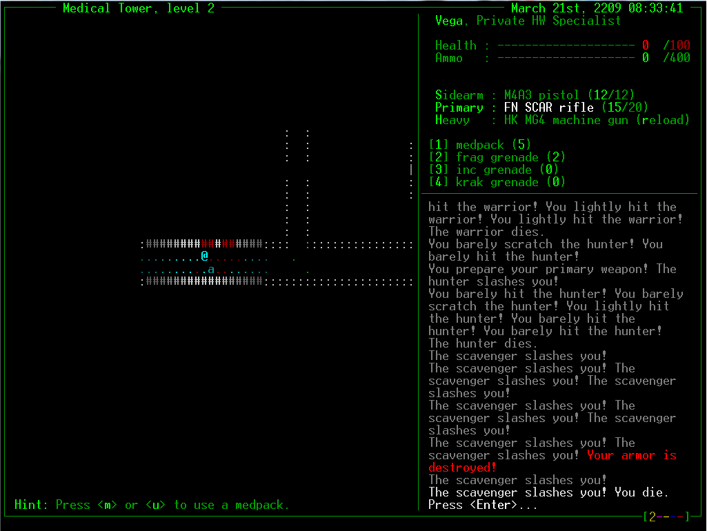 Я тут вспомнил (внезапно) в Angband звук еще есть. И кстати в новом ADOM. Но вот что делает рогалик по настоящему страшным? До жути? Чтобы потом до туалета бояться дойти в темноте.