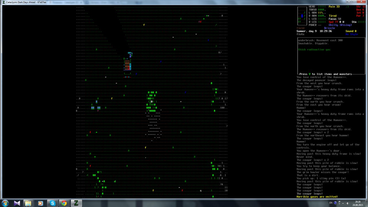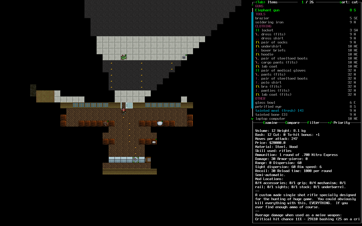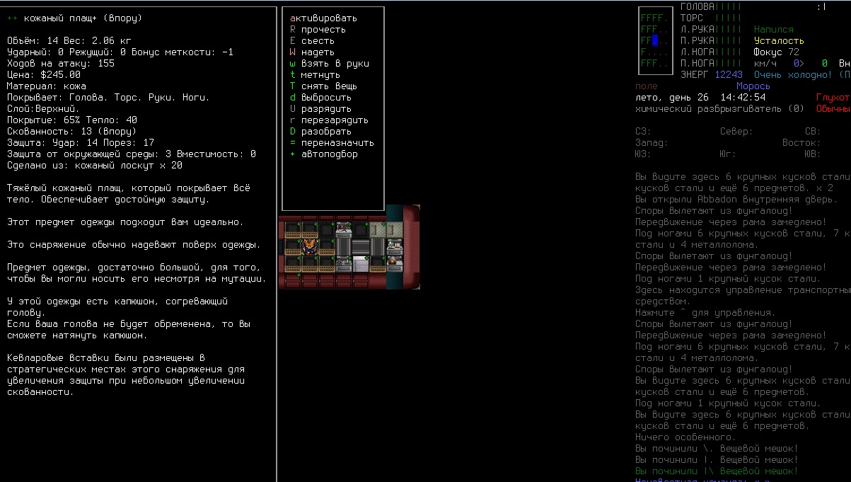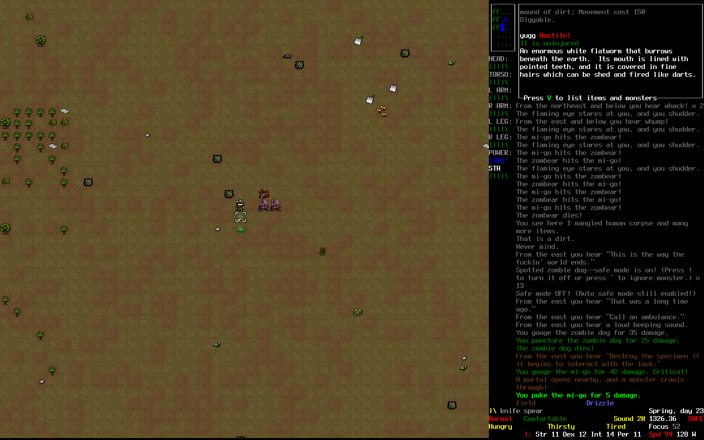 Сataclysm DDA -- это уникальный рогалик включающий в себя нестандартный сеттинг, полностью открытый мир, широкую систему крафта, строительства и конструирования автомобилей. Окапываемся ямами с точёными пиками в лесном домике, коллекционируем музыкальные инструменты в своём особняке, строим слизедвигатели, приручаем котиков, бреемся и стрижёмся. Отыгрываем фуррей, слизней, жрём странные ягоды, варим динамит из мыла, пытаемся убежать от предаторов. Теперь со вкусом фунгицидного газа, танков и необучаемости!