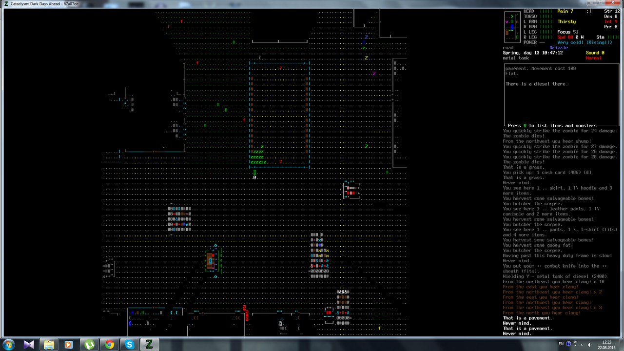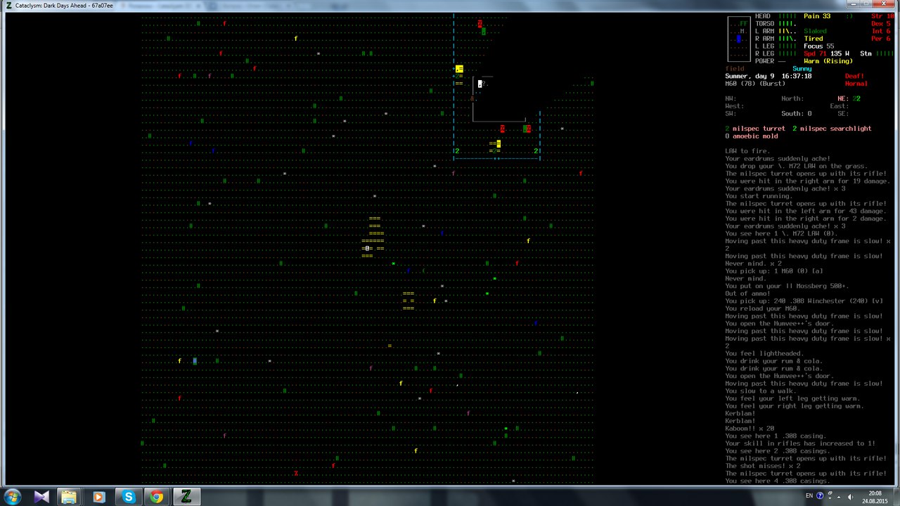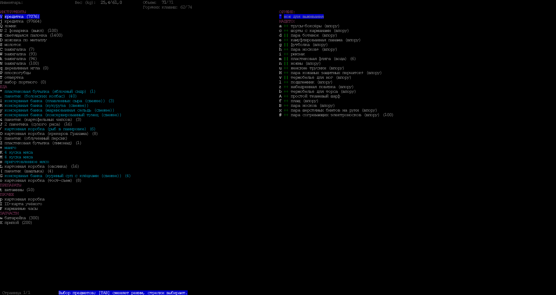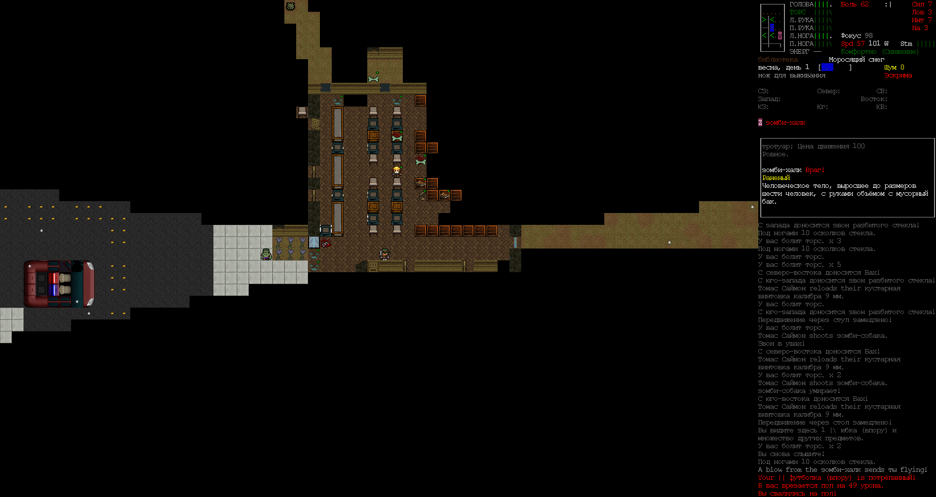 4 день как я залег в убежище. Полностью прочитал книгу о ближнем бое на ножах, поднял режущее оружие до тройки, шитье до еденички. Еды почти нет, пора выходить на дорогу и искать машину. Посколько я нихуя не умею и ньюфаг, а включен множитель монстров на двойке и орды, буду как советовал мудрый анон - идти на край карты. Заодно и гляну как она кончается ( карта).