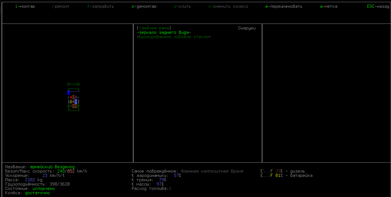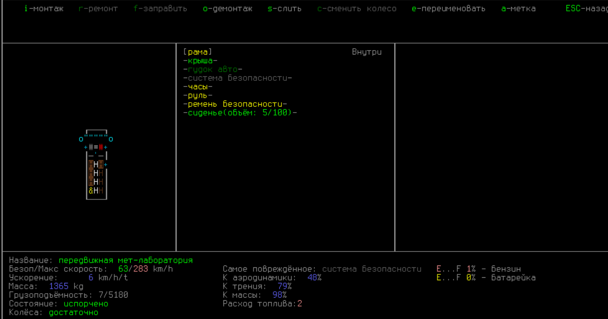 >>12312 Вот мой: убрал сиденья, поставил кровать, хим. лабу, холодильник, впереди вместо корзины сделал багажник, поставил солнечные батареи, 2 зеркала, убрал сзади двери и снял пулемёт.