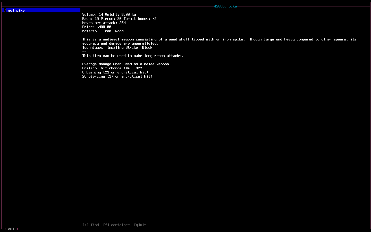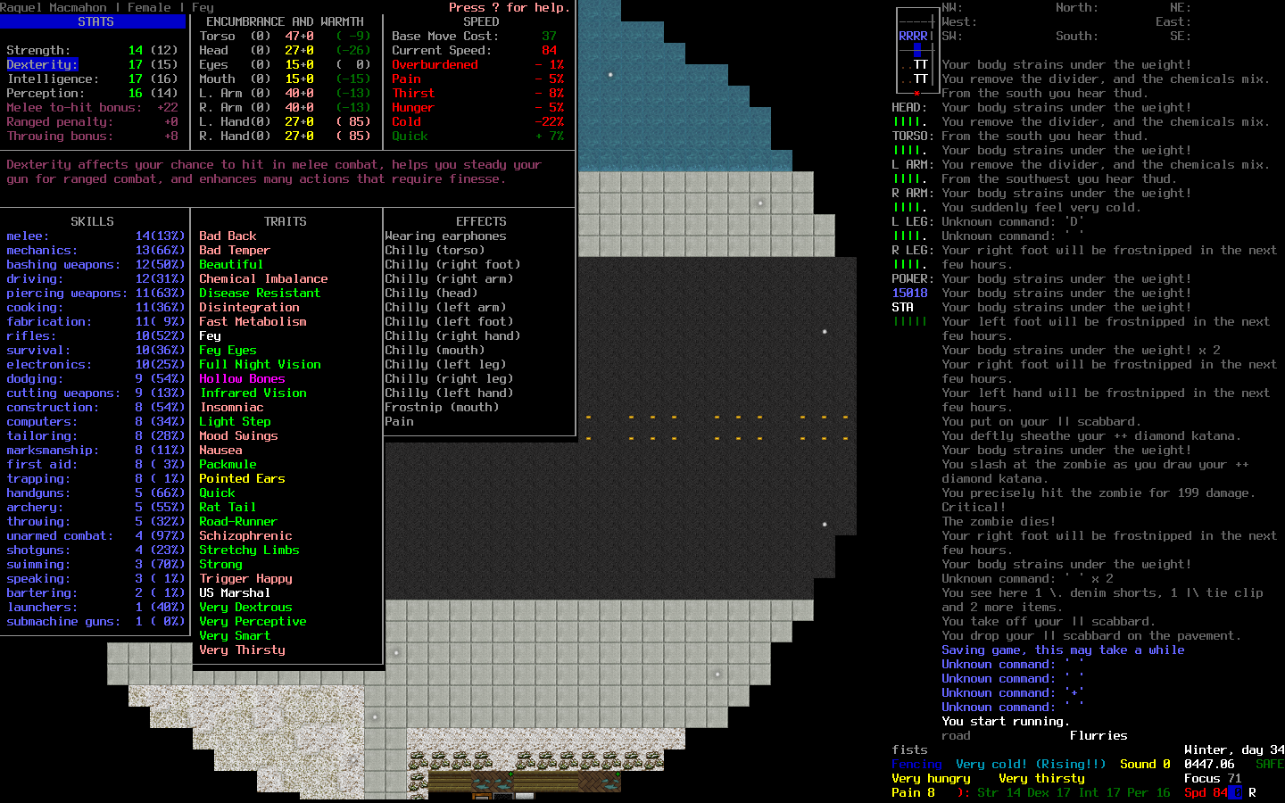 >>13028 >в обычном рогалике с минимальным перцепшеном и декс я критически разбил бы себе голову о первую же стену Сразу видно, что в рогалики, кроме катаклизма ты не играл. Из тех что считаются сейчас "классическими" нигде нет ничего подобного. >но, к счастью, кококлизм не рогалик и статы в нём не значат ничего кроме ролла Да и в катаклизм тоже не особо. http://www.wiki.cataclysmdda.com/index.php?title=Stats