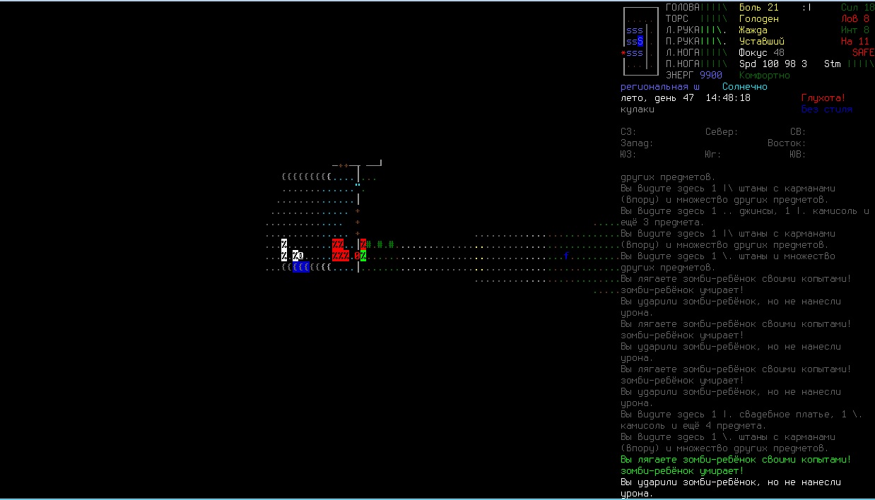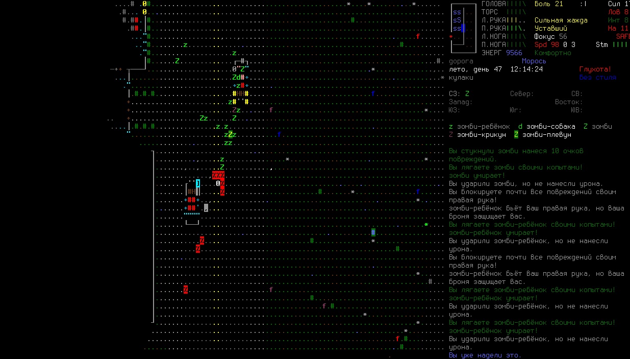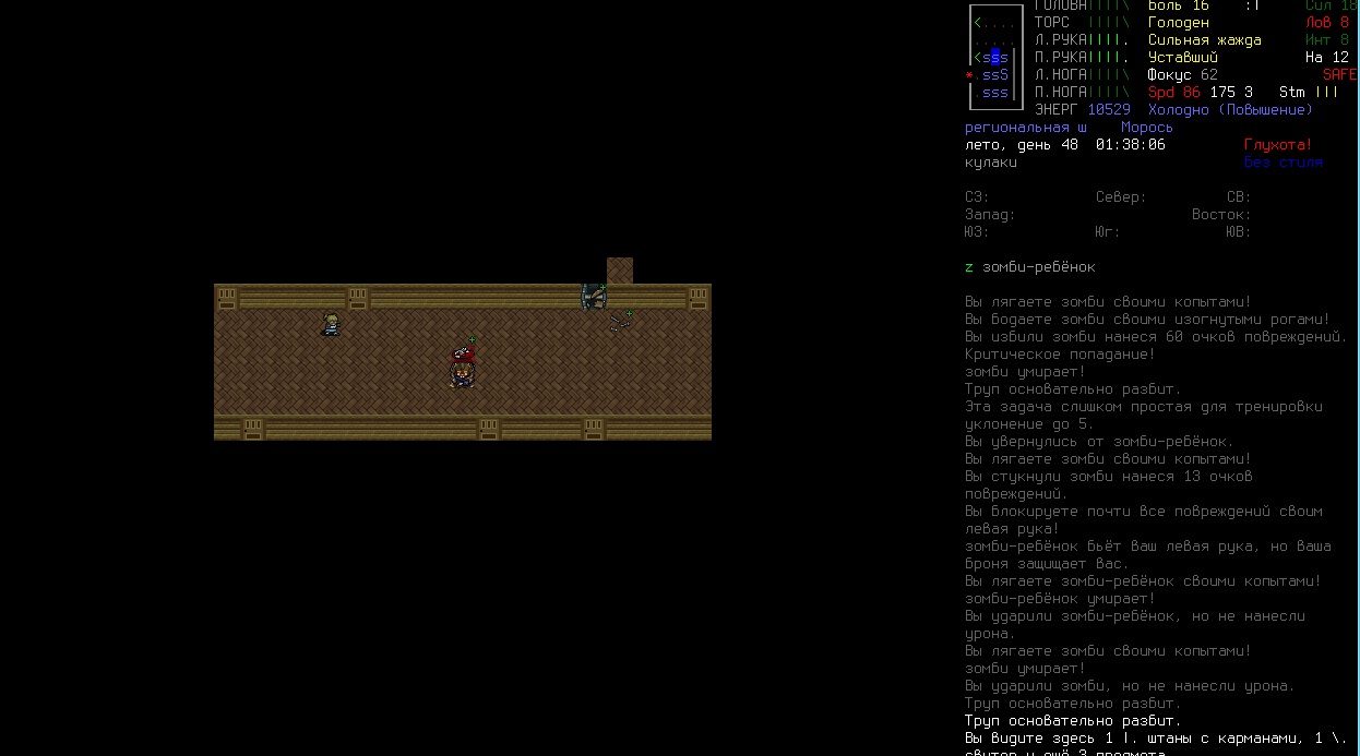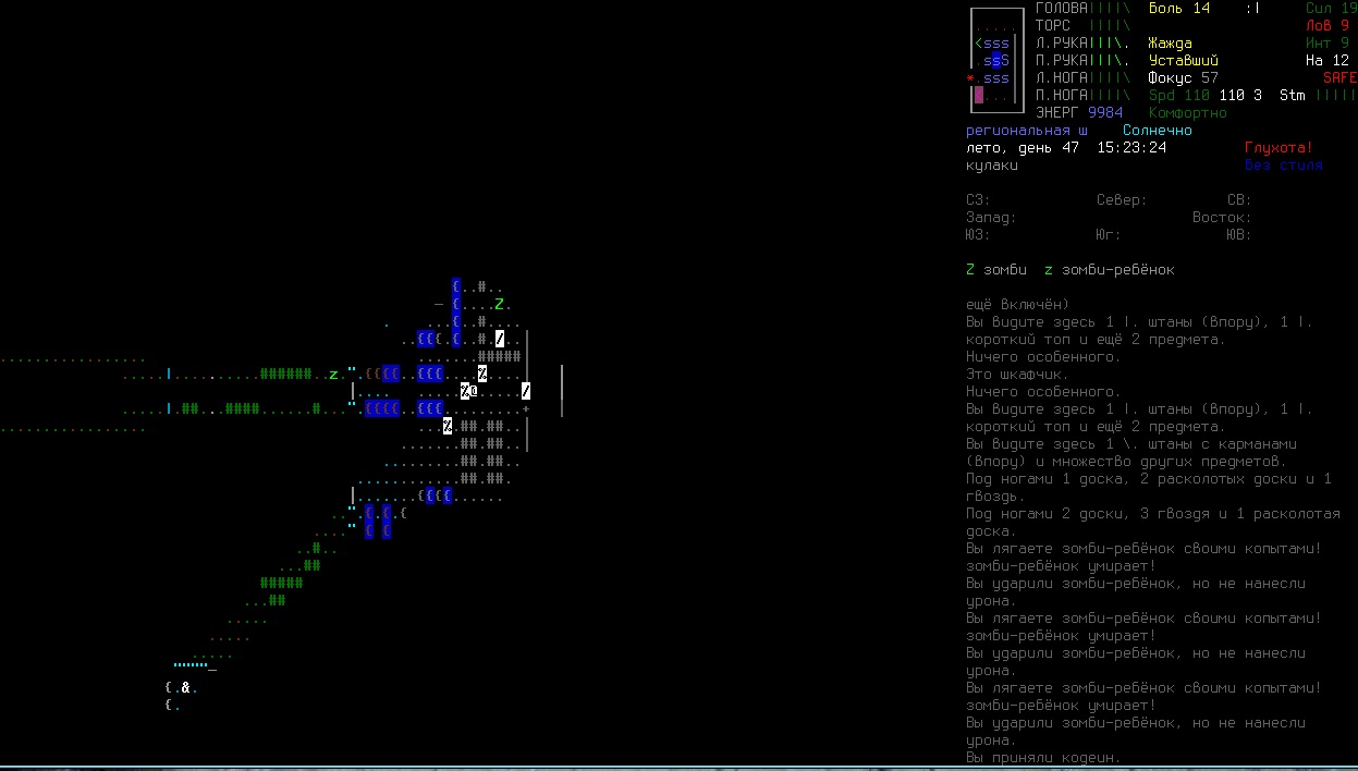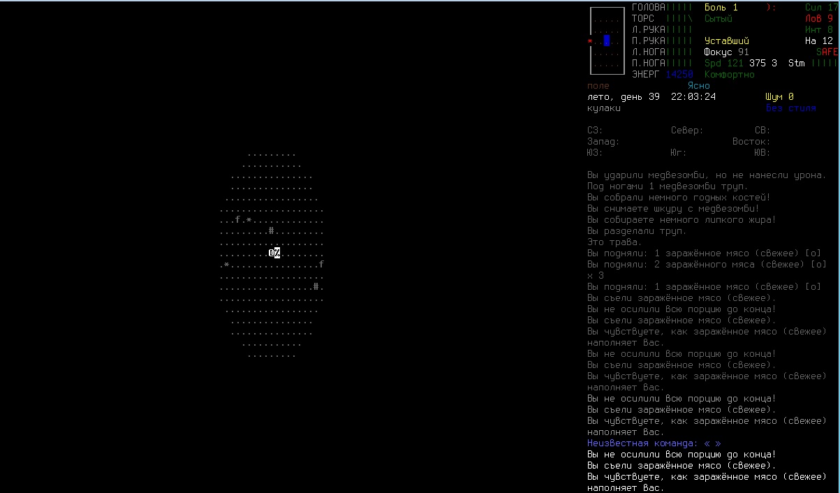 Сataclysm DDA -- это уникальный рогалик включающий в себя нестандартный сеттинг, полностью открытый мир, широкую систему крафта, строительства и конструирования автомобилей. Окапываемся ямами с точёными пиками в лесном домике, коллекционируем музыкальные инструменты в своём особняке, строим слизедвигатели, приручаем котиков, бреемся и стрижёмся. Отыгрываем фуррей, слизней, жрём странные ягоды, варим динамит из мыла, пытаемся убежать от предаторов. Теперь со вкусом фунгицидного газа, васянотанков и необучаемости!