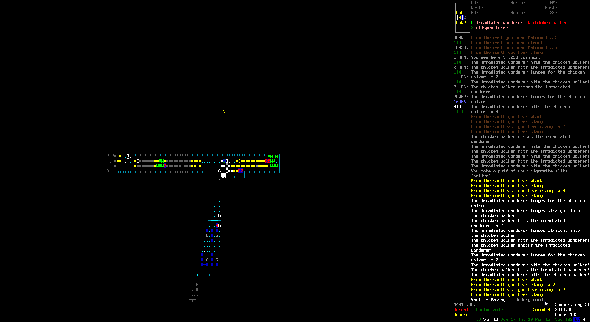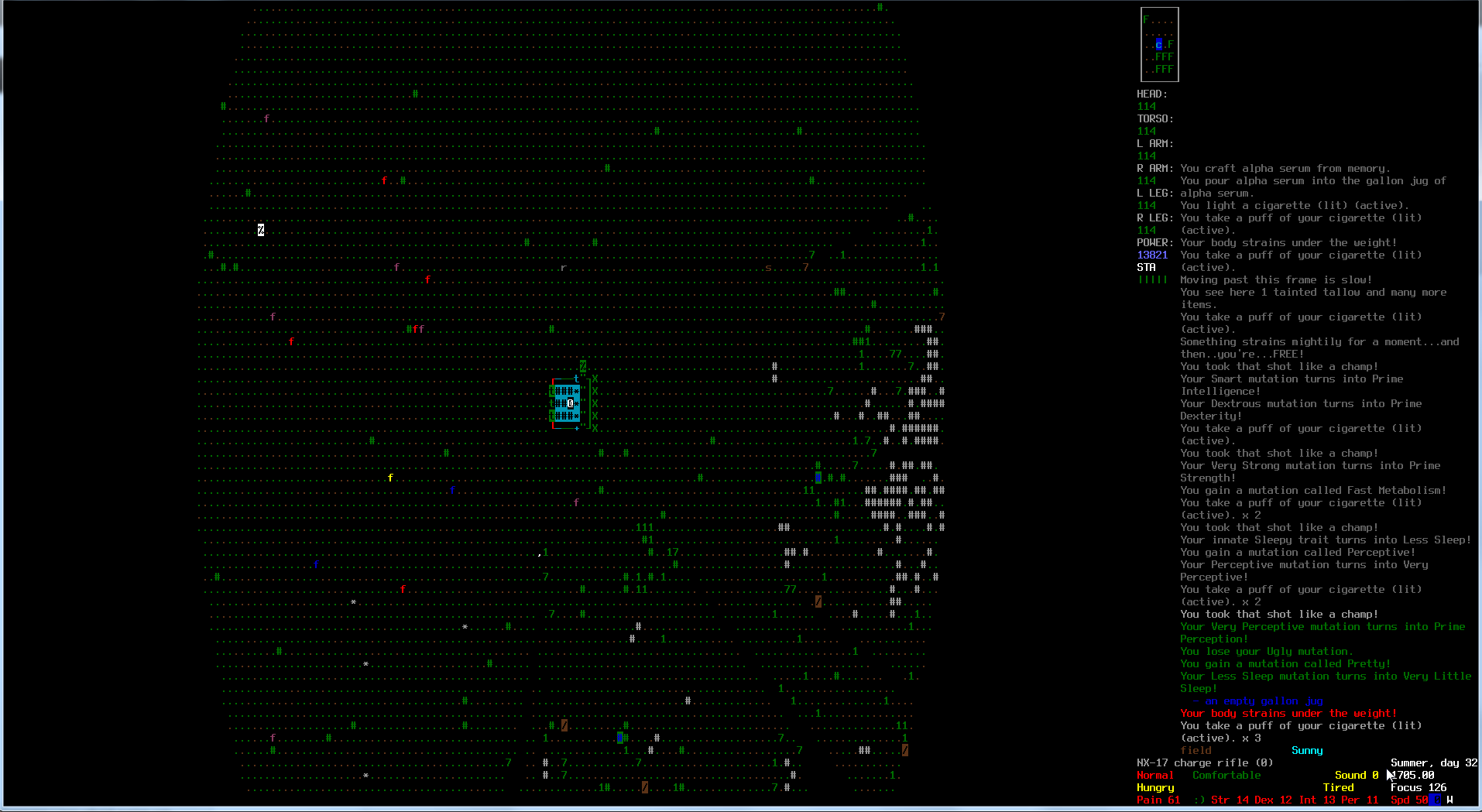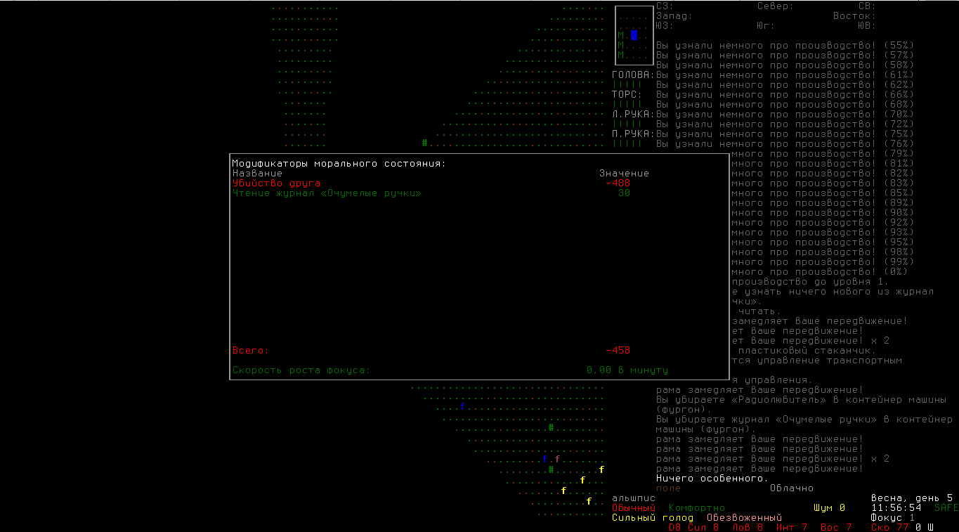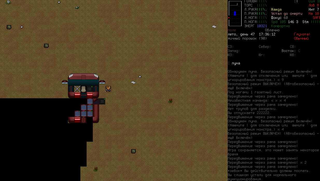 Пока не было ни двачей ни интернетов, я значительно продвинулся в игре т.к. больше у меня игор нет. Первое - доделал таки уберменша. В вики написано что статы до 18 - предел человеческих возможностей так что заранее надо ставить нужный стат до 15 чтобы грейднуться до 18. ANFO charge превращает фунгусошпиль в нисто, даже подстраховочные мининюки не понадобились. 120mm пушка гарантированно превратит в труху любого. Запилил таки вортекс двигло и вортекс генератор, охуел делать цепи и педали для них почти неделю. Вечный двигатель создан, послабее дизельного, но зато какой!. Нашел некрополис. Хорошо что враги сразу превращаются в радиоактивный пепел, иначе пришлось бы оставить эту затею из-за критического количества butchering - а в игре. Последнее что приходит на ум из лейтгейм стаффа - запилить cargo dimension, но т.к. спаун трупчинских учёных так занерфали и разбавили хуетой вроде трупов зожовцев\туристов, поиски портального генератора могут занять вечность.