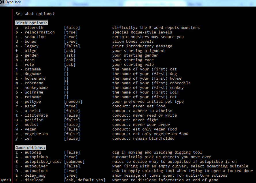 >>13423 Да, DynaHack немного отошел от Основ, от Истины, от Хардкора, от Труъ. Но я могу так сказать по опциям: настоящие нетхакеры не входят в опции, так то вот, настоящие харкорные игроки проходят с дефолтовыми опциями. Можно только подправить немного внешний вид, отображение, кодировку, цвета, тип меню, размер экрана и т.п. И к счастью даже в DynaHack все опции по умолчанию соответствуют исконному нетхакерскому труъ хардкору. Что еще добавить чтобы эпичность моего текста зашкаливала?