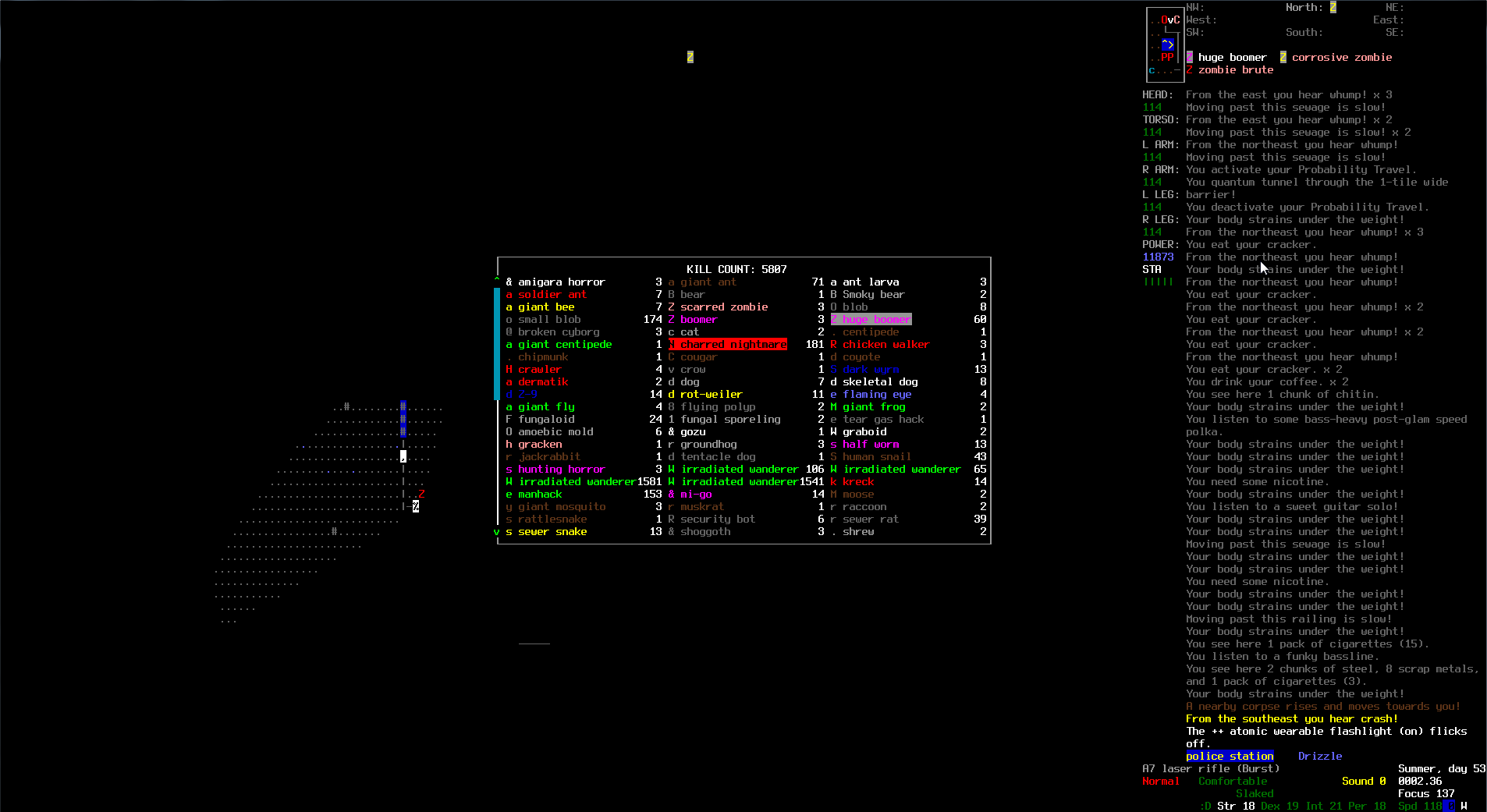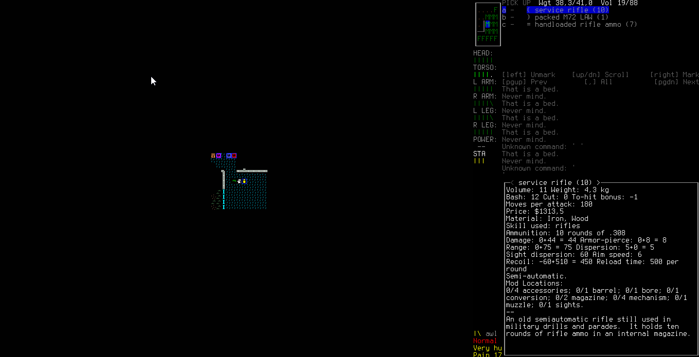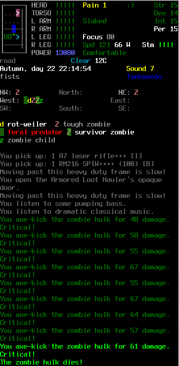 >>13403 Если говорить про атмосферу, то тут скорее влияние того, что это проект с открытым исходным кодом и поэтому нет единого видения каким он должен быть, много не доделано, а многое может быть лишнее, вот и приходится выкручивать настройки и моды для себя. Ну и стандартные настройки тут немного странные: 1. Разделка трупов чтобы не вставали - в оригинальном катаклизме такого, емнип, не было, и непонятно зачем добавили. 2. Падение навыков - опять же в оригинале оно особо не раздражало, а в dda, ну спасибо тому анону который запилил intcap, хоть какой-то реализм. 3. Огромное количество всякой ерунды, вроде огненных имба-катан и шмоток выживальщика. Которые по-идее должны подключаться отдельным модом, а не наоборот. 4. Убрали динамический спавн - но так и не доделали орды, или еще какой-нибудь внешний фактор, заставляющий выживальщика не превраться в плюшкина окончательно. 5. Добавили кучу монстров, разновидностей зомби, оружия. Но как-то разнообразия от этого особо не прибавилось. Заходишь в город, а там не толпа зомби, а какой-то разноцветный Z-парад. Ну и в оружейках теперь по нескольку разновидностей патронов пачками по 10 штук(насколько я вижу недавно добавили ЕЩЕ несколько вариантов 9mm/.223 ну и пистолет под .22), и ни одного под твою винтовку. Хотя предаторы, коррозивные и гренадеры доставляют, это да. 6. Огромный перекос баланса в плане получения большинства небоевых навыков/рецептов - библиотеки наше все (компьютеры и электронные книги наверно к этому времени просто "ВСЕ"). Обучать еще умеют нпс, но зачастую они совершенно неадекватные и вот это вот "тут в диалоге должен бы быть ответ, но кто-то его забыл запилить" кругом.