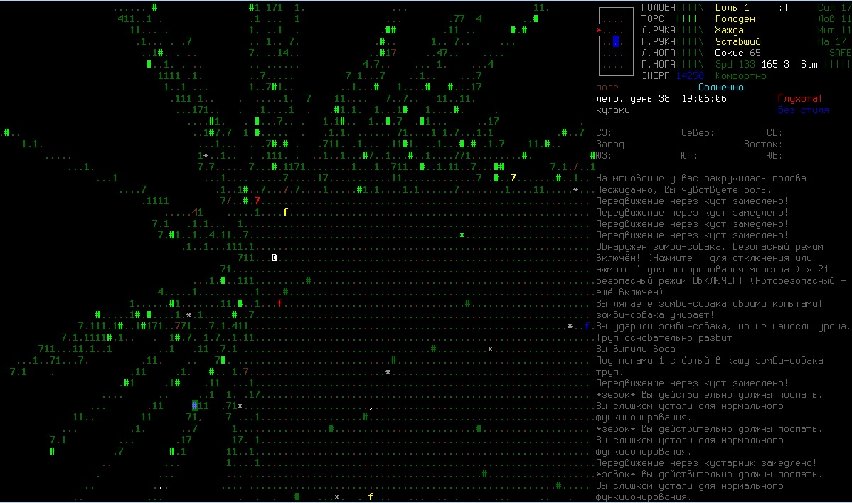 >>13463 Ну бля, ни одного города нет вокруг, карта вообще закрыта. Пока бегу в рандомном направлении. Уже рассвет. По пути сожрал зомби-собаку, набросился на лося, набрал свежего мяса. Ем сырым потому как нет поблизости даже палки чтобы пожарить да и разлагаться начал опять. Надо хоть куда-нибудь, хоть до машины любой дотянуть чтобы отоспаться.