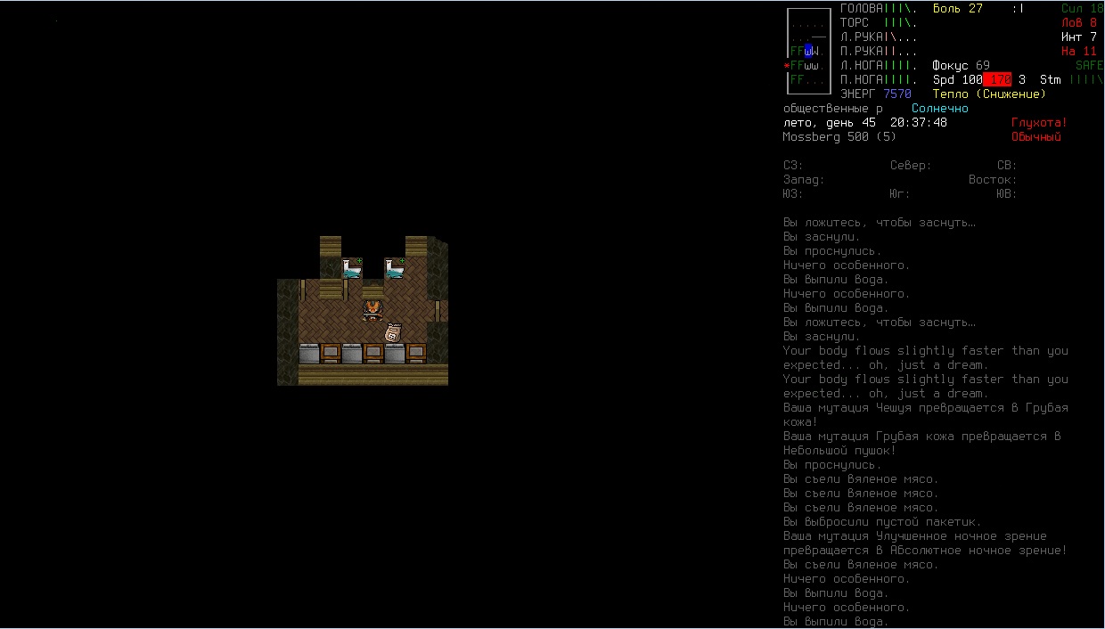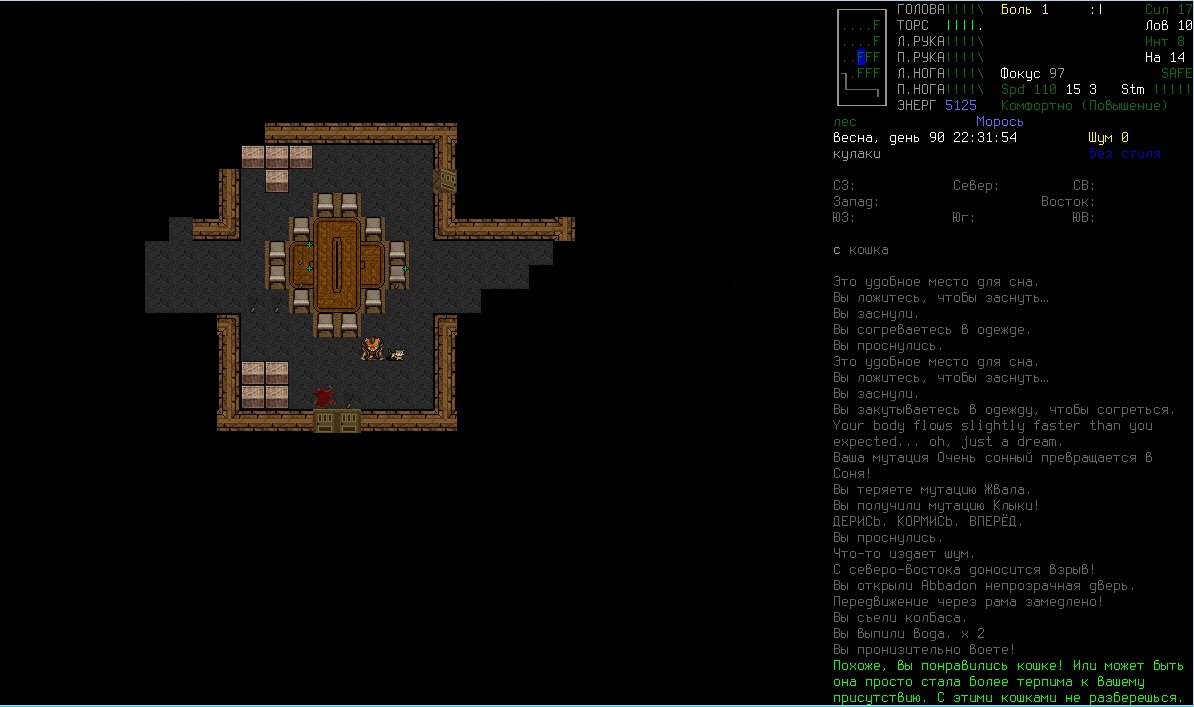 У паукана, если мутировал, снятся ламповые сны про перемаз паутинкой и выслеживание добычи. У зверя охота в лесу. Как классно. У химеры- ужас простой, БЕГИ, БЕГИ, ЕШЬ, НЕ УМИРАЙ, СТРЕМИСЬ, ПИТАЙСЯ, БЕГИ. Короче, режим паники. Вскакиваю с кровати и бегу есть, пить, по пути мутирую еще.
