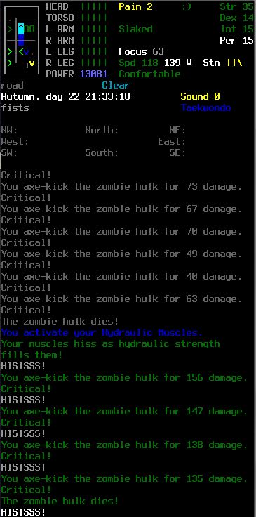 >>13484 А домики так и остались одноэтажными? Вообще - охуенно сделали, надо будет попросить добавить прыжки через пару-тройку клеток, чтобы можно было съёбывать от зомби прыгая по машинам/домам и преодолевать рвы и всякие обломки. И новую бионику - ножные протезы, которые позволяют прыгать на десяток клеток через зомби и препятствия.