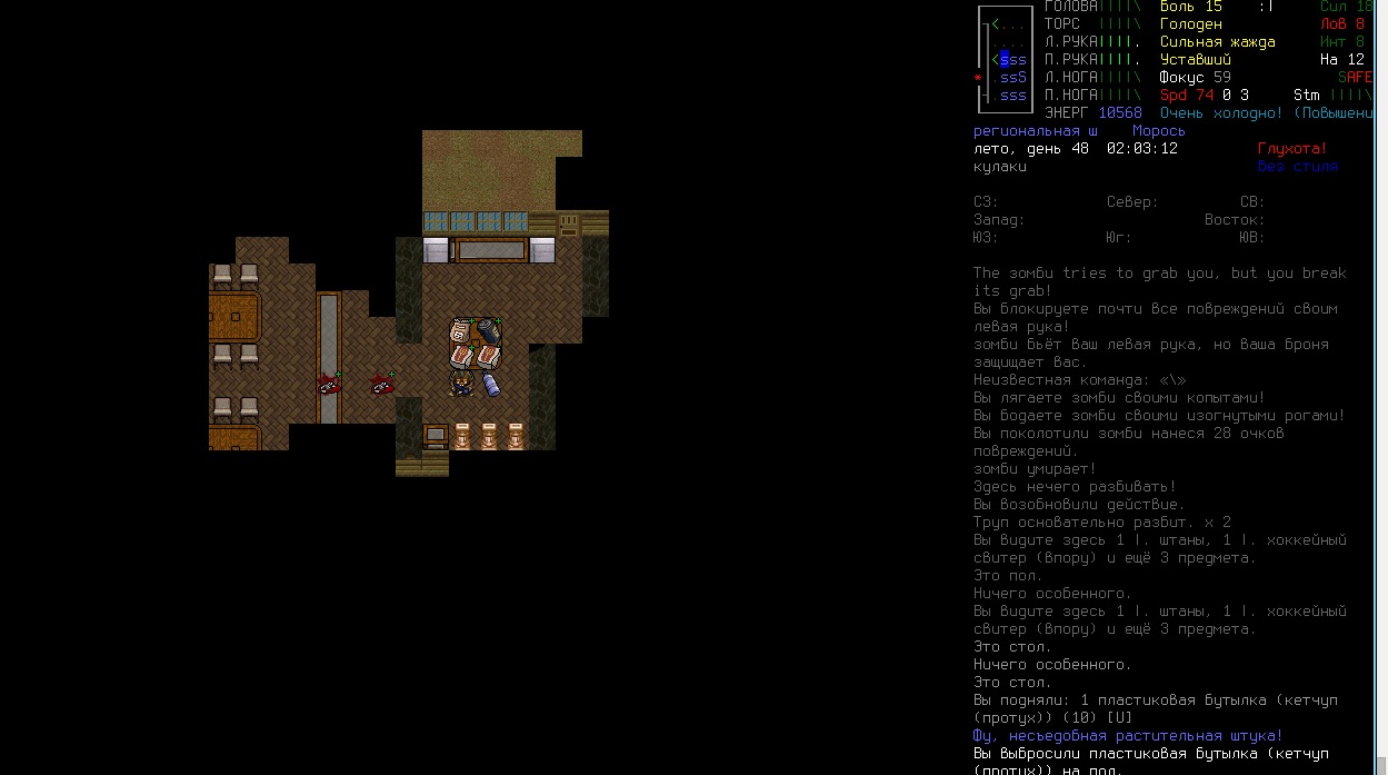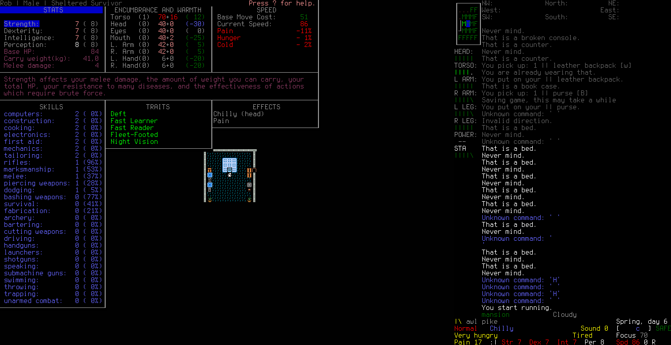 Бежал на восток, т. к. север заминирован. Ночью, измученный жаждой и голодом, добрался до особняка, который успешно зачистил с помощью средневековой пики, найденной там же: она позволяет бить на расстоянии нескольких клеток, что, в сочетании с медлительностью зомби, позволило сделать это почти без потерь. В доме огромная библиотка, и рядом лес -- источник еды. Думаю, остаться в нём сычевать какое-то время...