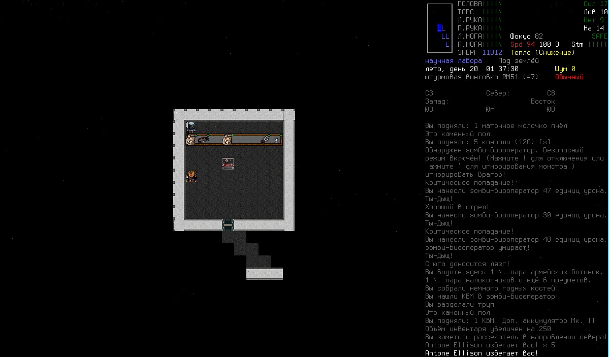 >>13455 Там пиздец кромешный, когда энергия для А7 (лазерной винтовки) кончилась, вместе с едой и местом в рюкзаке, я схватил беретту с моба и начал чистить дальше в надежде на пожрать, в столовой пустота была, почти, много чипсов и всякого фастфуда но мне это есть нельзя, бежал, нашел гараж а там второй рюкзак, на бугурте добежал до спуска вниз а там пикрилейтед, бомбануло сильно, в итоге прокопал потом туда проход (гнался за мной бот) но не дожил, думал буду там трупы лутать не смотря на однообразие хабара. Ну на лабораторию еще набежал внутри за мутагенами, просто из жадности скорее всего, уже были не нужны. Вот на скринах проход. Правда мои жители в подвали пизданулись, пришлось их сожрать.
