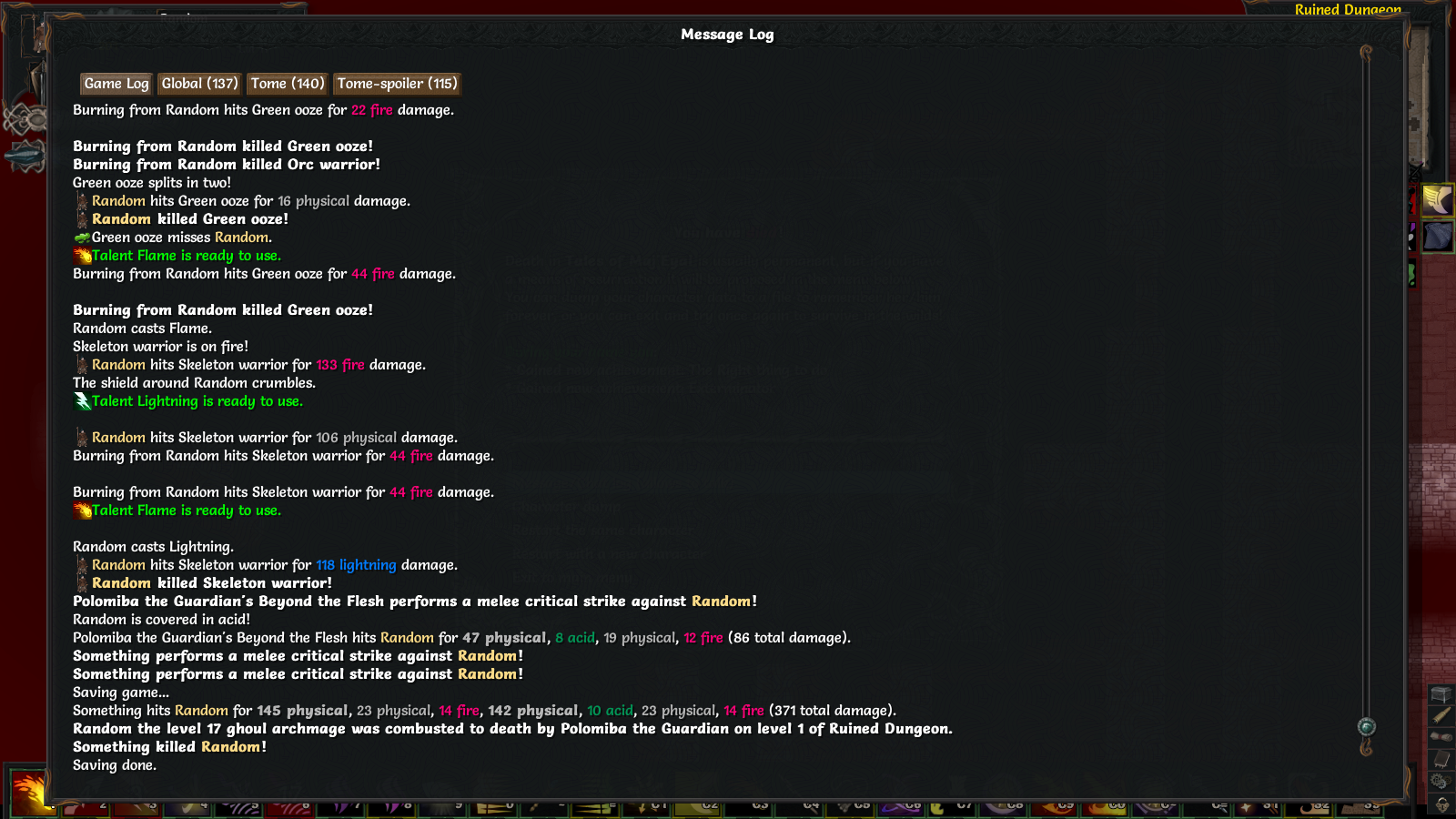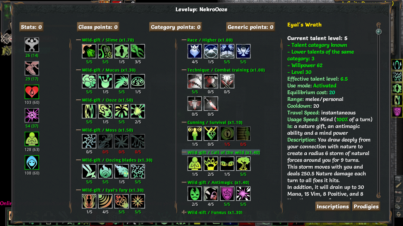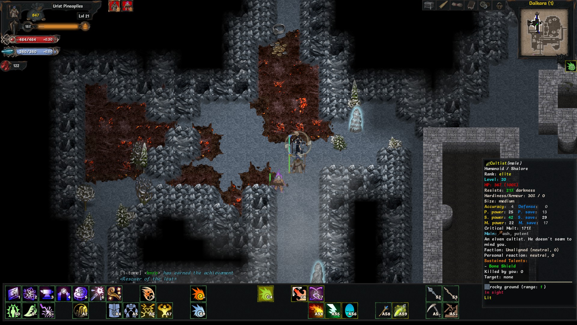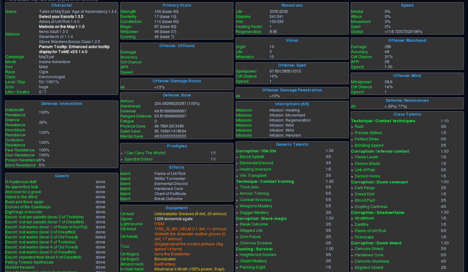 Misc New quests popup visuals, varying depending on the type and status of quest Rewrote Survival tree Altered other warrior & rogue subclasses to match new categories New Light Armour Training talent When the player enters a level (the first time only), any nearby hostiles in radius 5 are scattered around the level, to prevent entering deathtraps When unlocking poisons the Lord unlocks un already learnt Adventurers start with a cloak in inventory Antimagic now scales with either Mindpower of Physical power Resolve now works even while Antimagic Shield is up when at level 5 Mana Clash now also adds a timed effect that adds manaburn to all damage dealt Antimagic Shield max absorb buffed and now does a manaburn backlask against the attacker Aura of Silence now also restores equilibrium for each foes silenced Talent descriptions automatically note talents that won't break stealth. Rares/Uniques/Bosses/Elite Bosses/Gods now have distinctive markers on them to easily notice them Increased Epoch's Curve range by 1 Nerfed cooldown and healing on Bathe in Light Staves accuracy bonus is now halved for short staves Brittle Clear Oozes are much rarer Nigthmare has slightly increased chance of rare spanws Stairs can not be used for some turns after a kill (0 on Easy, 2 on Normal, 3 on Nightmare, 5 on Insane, 9 on Madness) Ogres's Writ Large lets them get a 6th inscription slot as before, but they have to use a category point to actually unlock it Buffed Highers (Gift also gives healing mod%, Overseer grants telepathy on hit, Born into Magic has better numbers) Dwarf Stoneskin fully ignores the triggering attack, and correctly states it has no cooldown and can re-proc while active Nerfed infravision on the experiments in the Blighted Ruins Buffed Ghouls (Ghoul provides more stats, Ghoulish Leap provides a global speed boost on landing, reduced Retch cooldown a little, increased Gnaw stats reduction and ghoul spawned is fully controllable) All summons affected by Blighted Summoning get max vim on spawn Buffed Skeletons (Skeleton gives more str/dex, reduced cooldown of both Bone Armour and Re-assemble) Buffed Dwarves (Resiliense gives hardiness, Stoneskin and Power is Money give higher numbers) Dark Empathy now also transfers the caster's resists cap Cornacs start with one more generic point and gain additional class and generic points while leveling Nerfed Ogres a little (and buffed a little) Some slight Shalore nerfs (and a buff) Augmentation updates with each stats change and has a small cooldown New "Detach Tinker" command in the item's menu to remove a tinker from an object, worn or otherwise Tinkered objects show the tinker they use in their names Dwarven Adventurers can use stone wardens talents All zones now update their base level each time the player enters All liches NPCs have 50% chance to ignore crits, archliches and bloodliches have 100% Lichform grants 100% stun & disease immunity Lichform now has a new rank 7, which is much more powerful than puny level 6 liches ! Skeleton's Re-Assemble can not be cheesed anymore Healing modifier scales (0.5 power) with constitution. When disarmed, some traps give the player a chance to learn (unlock) a related trap talent. Revised (nerfed) Gesture of Guarding's deflection value (similar to parry). Talents whose descriptions contain a damage will now also base it on the stunned/dazed/number/.. state to reflect the actual damage that can be done more accurately Player AOE targeting with stop block will not block on unseen actors. Player AOE targeting highlights with stop block will not be blocked by unseen actors. Darkest Light will not appear on randbosses/elites anymore Infinite Dungeon levels sometimes get zone-wide auras Backup guardians can now drop tier 5 items Levelup dialog has a checkbox to hide unknown categories, should help a lot Adventurers New game option in Misc section to show or hide cloak hoods (off by default) Added a Font Scaling option to the video menu, from 50% to 300% Capslock to scroll is now rebindable like any other keybinds, under the name "Scroll map mode" Corrections/clarifications to the descriptions and log messages for a few artifacts. Short staves will appear smaller than normal ones on the player's doll Unique tiles for all artifacts, including every possible versions of the Crystal Heart and Crystal Focus Bone Shield displays current and max charges on the icon Buffed quick, supercharged, and overpowered charm egos a bit (better cooldowns) Reworked Hornet Stingers to be useful. Now 20 damage per turn up from 15 and 20% talent failure rate up from 5%. Added unarmed on-hit Cursed talents for Ruthless Grip so brawlers won't be so sad. Lowered the healing mod malus from -20% to -10% so it will be a safer choice. Slight increase in price and slight decrease in base power and on-hits to balance it out with its new talents. Revamped Spellblade. Changed level range from 40-45 to 35-50 to hopefully see it drop more often. Black Mesh now has a 100% chance to pull in the attacker to reinforce its identity (only once per turn), clarified the on-block tooltip to let people know what it really does. Filled in missing proc chance for Coral Spray, changed wording slightly. Fire Dragon Shield now has a 30% chance to cast level 2 Fire Breath on your foes in radius 6, possibly stunning them. Added 15% fire affinity for flavor and usefulness. Changed Scale Mail of Kroltar's activable from Lv 3 Inferno (Archmage skill) to Lv 3 Devouring Flames (Wyrmic skill) for flavor, slight increase in utility! Dragon Helm of Kroltar now has +5 wil, +10% phys/fire damage, 0.2 Fire drake aspect mastery. Changed activable to level 3 bellowing roar for flavor and usefulness. Changed to properly use armor training 1 instead of 3 as all other helms do for consistency, it pairs with mail armor anyways. Set bonus gives an additional +14 luck for a total of 10. New tileset for the Heart of the Gloom, with a different one for the dream version of it and an other