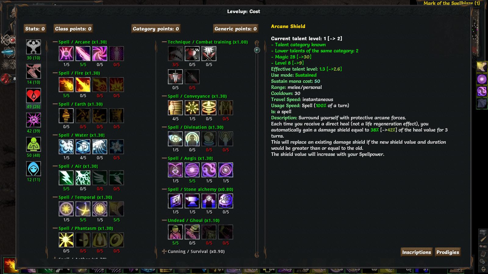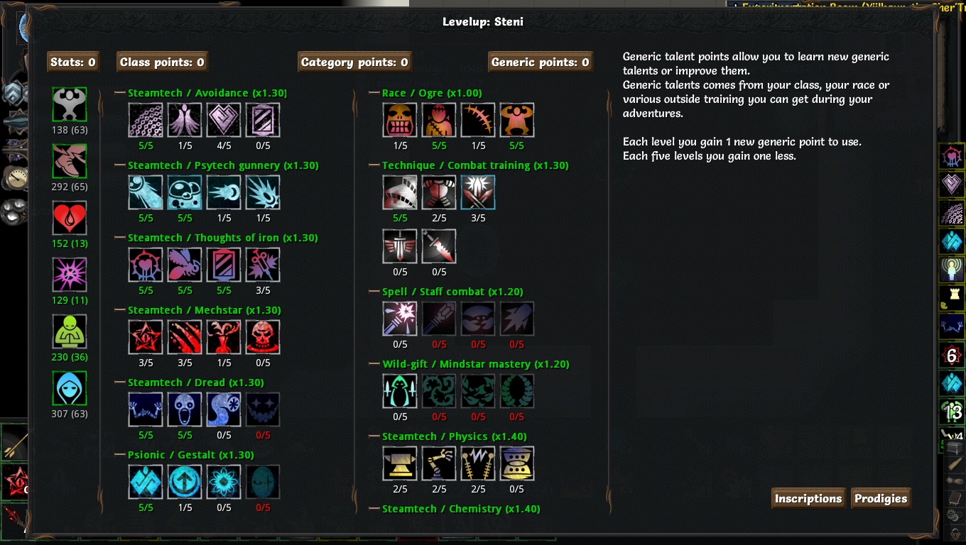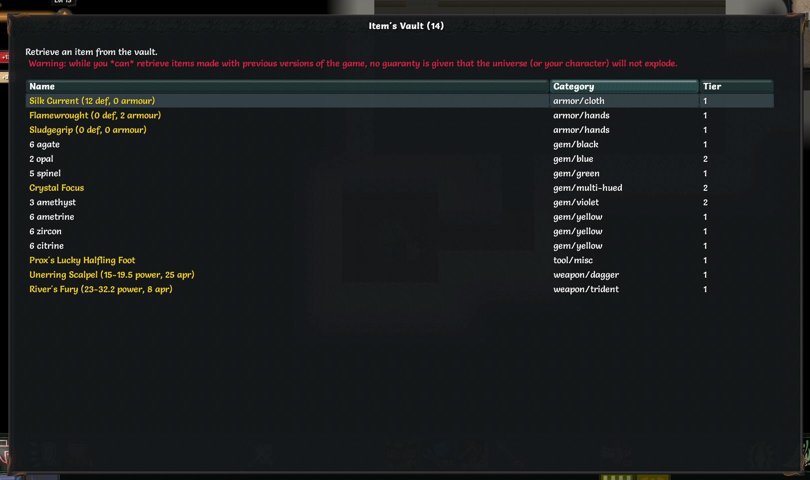 Misc New quests popup visuals, varying depending on the type and status of quest Rewrote Survival tree Altered other warrior & rogue subclasses to match new categories New Light Armour Training talent When the player enters a level (the first time only), any nearby hostiles in radius 5 are scattered around the level, to prevent entering deathtraps When unlocking poisons the Lord unlocks un already learnt Adventurers start with a cloak in inventory Antimagic now scales with either Mindpower of Physical power Resolve now works even while Antimagic Shield is up when at level 5 Mana Clash now also adds a timed effect that adds manaburn to all damage dealt Antimagic Shield max absorb buffed and now does a manaburn backlask against the attacker Aura of Silence now also restores equilibrium for each foes silenced Talent descriptions automatically note talents that won't break stealth. Rares/Uniques/Bosses/Elite Bosses/Gods now have distinctive markers on them to easily notice them Increased Epoch's Curve range by 1 Nerfed cooldown and healing on Bathe in Light Staves accuracy bonus is now halved for short staves Brittle Clear Oozes are much rarer Nigthmare has slightly increased chance of rare spanws Stairs can not be used for some turns after a kill (0 on Easy, 2 on Normal, 3 on Nightmare, 5 on Insane, 9 on Madness) Ogres's Writ Large lets them get a 6th inscription slot as before, but they have to use a category point to actually unlock it Buffed Highers (Gift also gives healing mod%, Overseer grants telepathy on hit, Born into Magic has better numbers) Dwarf Stoneskin fully ignores the triggering attack, and correctly states it has no cooldown and can re-proc while active Nerfed infravision on the experiments in the Blighted Ruins Buffed Ghouls (Ghoul provides more stats, Ghoulish Leap provides a global speed boost on landing, reduced Retch cooldown a little, increased Gnaw stats reduction and ghoul spawned is fully controllable) All summons affected by Blighted Summoning get max vim on spawn Buffed Skeletons (Skeleton gives more str/dex, reduced cooldown of both Bone Armour and Re-assemble) Buffed Dwarves (Resiliense gives hardiness, Stoneskin and Power is Money give higher numbers) Dark Empathy now also transfers the caster's resists cap Cornacs start with one more generic point and gain additional class and generic points while leveling Nerfed Ogres a little (and buffed a little) Some slight Shalore nerfs (and a buff) Augmentation updates with each stats change and has a small cooldown New "Detach Tinker" command in the item's menu to remove a tinker from an object, worn or otherwise Tinkered objects show the tinker they use in their names Dwarven Adventurers can use stone wardens talents All zones now update their base level each time the player enters All liches NPCs have 50% chance to ignore crits, archliches and bloodliches have 100% Lichform grants 100% stun & disease immunity Lichform now has a new rank 7, which is much more powerful than puny level 6 liches ! Skeleton's Re-Assemble can not be cheesed anymore Healing modifier scales (0.5 power) with constitution. When disarmed, some traps give the player a chance to learn (unlock) a related trap talent. Revised (nerfed) Gesture of Guarding's deflection value (similar to parry). Talents whose descriptions contain a damage will now also base it on the stunned/dazed/number/.. state to reflect the actual damage that can be done more accurately Player AOE targeting with stop block will not block on unseen actors. Player AOE targeting highlights with stop block will not be blocked by unseen actors. Darkest Light will not appear on randbosses/elites anymore Infinite Dungeon levels sometimes get zone-wide auras Backup guardians can now drop tier 5 items Levelup dialog has a checkbox to hide unknown categories, should help a lot Adventurers New game option in Misc section to show or hide cloak hoods (off by default) Added a Font Scaling option to the video menu, from 50% to 300% Capslock to scroll is now rebindable like any other keybinds, under the name "Scroll map mode" Corrections/clarifications to the descriptions and log messages for a few artifacts. Short staves will appear smaller than normal ones on the player's doll Unique tiles for all artifacts, including every possible versions of the Crystal Heart and Crystal Focus Bone Shield displays current and max charges on the icon Buffed quick, supercharged, and overpowered charm egos a bit (better cooldowns) Reworked Hornet Stingers to be useful. Now 20 damage per turn up from 15 and 20% talent failure rate up from 5%. Added unarmed on-hit Cursed talents for Ruthless Grip so brawlers won't be so sad. Lowered the healing mod malus from -20% to -10% so it will be a safer choice. Slight increase in price and slight decrease in base power and on-hits to balance it out with its new talents. Revamped Spellblade. Changed level range from 40-45 to 35-50 to hopefully see it drop more often. Black Mesh now has a 100% chance to pull in the attacker to reinforce its identity (only once per turn), clarified the on-block tooltip to let people know what it really does. Filled in missing proc chance for Coral Spray, changed wording slightly. Fire Dragon Shield now has a 30% chance to cast level 2 Fire Breath on your foes in radius 6, possibly stunning them. Added 15% fire affinity for flavor and usefulness. Changed Scale Mail of Kroltar's activable from Lv 3 Inferno (Archmage skill) to Lv 3 Devouring Flames (Wyrmic skill) for flavor, slight increase in utility! Dragon Helm of Kroltar now has +5 wil, +10% phys/fire damage, 0.2 Fire drake aspect mastery. Changed activable to level 3 bellowing roar for flavor and usefulness. Changed to properly use armor training 1 instead of 3 as all other helms do for consistency, it pairs with mail armor anyways. Set bonus gives an additional +14 luck for a total of 10. New tileset for the Heart of the Gloom, with a different one for the dream version of it and an other
