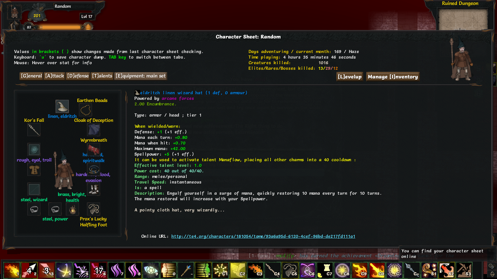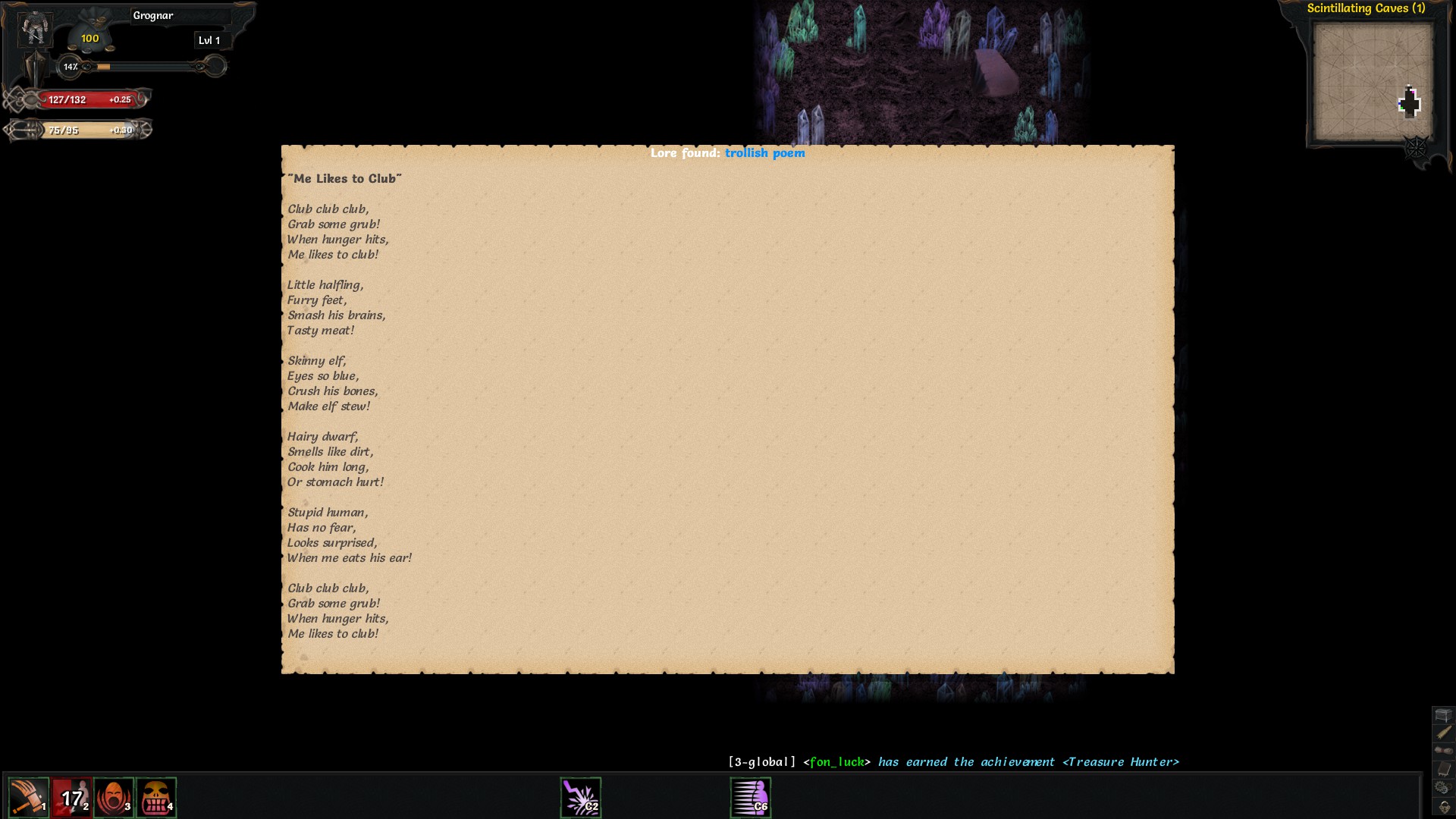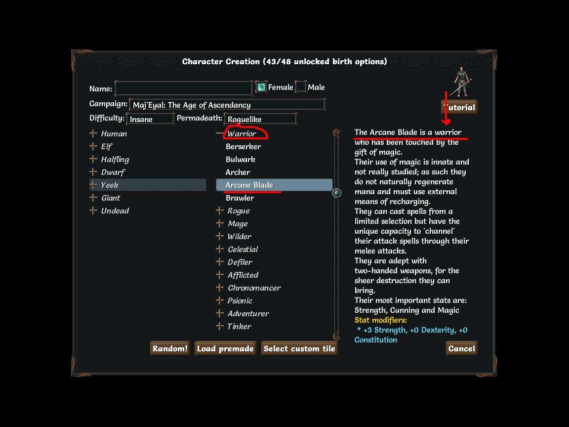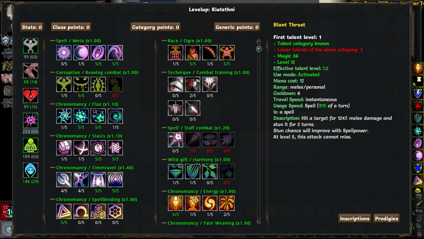 Misc New quests popup visuals, varying depending on the type and status of quest Rewrote Survival tree Altered other warrior & rogue subclasses to match new categories New Light Armour Training talent When the player enters a level (the first time only), any nearby hostiles in radius 5 are scattered around the level, to prevent entering deathtraps When unlocking poisons the Lord unlocks un already learnt Adventurers start with a cloak in inventory Antimagic now scales with either Mindpower of Physical power Resolve now works even while Antimagic Shield is up when at level 5 Mana Clash now also adds a timed effect that adds manaburn to all damage dealt Antimagic Shield max absorb buffed and now does a manaburn backlask against the attacker Aura of Silence now also restores equilibrium for each foes silenced Talent descriptions automatically note talents that won't break stealth. Rares/Uniques/Bosses/Elite Bosses/Gods now have distinctive markers on them to easily notice them Increased Epoch's Curve range by 1 Nerfed cooldown and healing on Bathe in Light Staves accuracy bonus is now halved for short staves Brittle Clear Oozes are much rarer Nigthmare has slightly increased chance of rare spanws Stairs can not be used for some turns after a kill (0 on Easy, 2 on Normal, 3 on Nightmare, 5 on Insane, 9 on Madness) Ogres's Writ Large lets them get a 6th inscription slot as before, but they have to use a category point to actually unlock it Buffed Highers (Gift also gives healing mod%, Overseer grants telepathy on hit, Born into Magic has better numbers) Dwarf Stoneskin fully ignores the triggering attack, and correctly states it has no cooldown and can re-proc while active Nerfed infravision on the experiments in the Blighted Ruins Buffed Ghouls (Ghoul provides more stats, Ghoulish Leap provides a global speed boost on landing, reduced Retch cooldown a little, increased Gnaw stats reduction and ghoul spawned is fully controllable) All summons affected by Blighted Summoning get max vim on spawn Buffed Skeletons (Skeleton gives more str/dex, reduced cooldown of both Bone Armour and Re-assemble) Buffed Dwarves (Resiliense gives hardiness, Stoneskin and Power is Money give higher numbers) Dark Empathy now also transfers the caster's resists cap Cornacs start with one more generic point and gain additional class and generic points while leveling Nerfed Ogres a little (and buffed a little) Some slight Shalore nerfs (and a buff) Augmentation updates with each stats change and has a small cooldown New "Detach Tinker" command in the item's menu to remove a tinker from an object, worn or otherwise Tinkered objects show the tinker they use in their names Dwarven Adventurers can use stone wardens talents All zones now update their base level each time the player enters All liches NPCs have 50% chance to ignore crits, archliches and bloodliches have 100% Lichform grants 100% stun & disease immunity Lichform now has a new rank 7, which is much more powerful than puny level 6 liches ! Skeleton's Re-Assemble can not be cheesed anymore Healing modifier scales (0.5 power) with constitution. When disarmed, some traps give the player a chance to learn (unlock) a related trap talent. Revised (nerfed) Gesture of Guarding's deflection value (similar to parry). Talents whose descriptions contain a damage will now also base it on the stunned/dazed/number/.. state to reflect the actual damage that can be done more accurately Player AOE targeting with stop block will not block on unseen actors. Player AOE targeting highlights with stop block will not be blocked by unseen actors. Darkest Light will not appear on randbosses/elites anymore Infinite Dungeon levels sometimes get zone-wide auras Backup guardians can now drop tier 5 items Levelup dialog has a checkbox to hide unknown categories, should help a lot Adventurers New game option in Misc section to show or hide cloak hoods (off by default) Added a Font Scaling option to the video menu, from 50% to 300% Capslock to scroll is now rebindable like any other keybinds, under the name "Scroll map mode" Corrections/clarifications to the descriptions and log messages for a few artifacts. Short staves will appear smaller than normal ones on the player's doll Unique tiles for all artifacts, including every possible versions of the Crystal Heart and Crystal Focus Bone Shield displays current and max charges on the icon Buffed quick, supercharged, and overpowered charm egos a bit (better cooldowns) Reworked Hornet Stingers to be useful. Now 20 damage per turn up from 15 and 20% talent failure rate up from 5%. Added unarmed on-hit Cursed talents for Ruthless Grip so brawlers won't be so sad. Lowered the healing mod malus from -20% to -10% so it will be a safer choice. Slight increase in price and slight decrease in base power and on-hits to balance it out with its new talents. Revamped Spellblade. Changed level range from 40-45 to 35-50 to hopefully see it drop more often. Black Mesh now has a 100% chance to pull in the attacker to reinforce its identity (only once per turn), clarified the on-block tooltip to let people know what it really does. Filled in missing proc chance for Coral Spray, changed wording slightly. Fire Dragon Shield now has a 30% chance to cast level 2 Fire Breath on your foes in radius 6, possibly stunning them. Added 15% fire affinity for flavor and usefulness. Changed Scale Mail of Kroltar's activable from Lv 3 Inferno (Archmage skill) to Lv 3 Devouring Flames (Wyrmic skill) for flavor, slight increase in utility! Dragon Helm of Kroltar now has +5 wil, +10% phys/fire damage, 0.2 Fire drake aspect mastery. Changed activable to level 3 bellowing roar for flavor and usefulness. Changed to properly use armor training 1 instead of 3 as all other helms do for consistency, it pairs with mail armor anyways. Set bonus gives an additional +14 luck for a total of 10. New tileset for the Heart of the Gloom, with a different one for the dream version of it and an other
