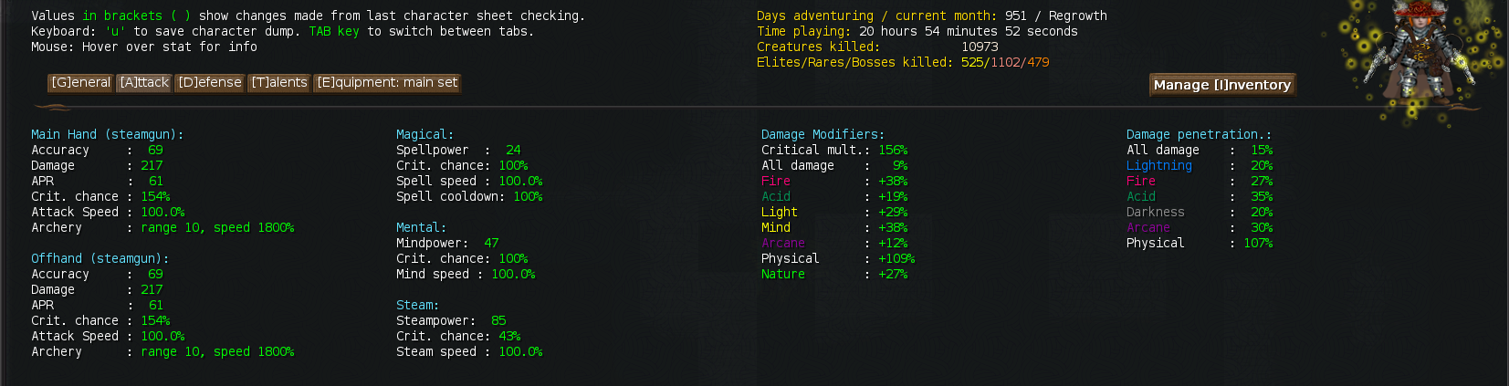 Marked multiple achievements as "huge", there were none! Oh! Range Amplification Device fatigue penalty reduced to 20% Arcane Amplification Drone does not damage the caster Reduced Automated Reflex System cooldown to 4 Fixed powering the Ring of Lost Love Eye of the Tiger now affects steamtech talents Molten Points can not be removed anymore Gunslingers start with a unique cloak, no special powers but a unique and cool looking skin! New player doll tiles to match ToME 1.5 system Reduced Sawrd procs power Added support for Possessors Explosive Steam Engine and Tremor Engine now correctly work even outside of sight Reduced some salves power a little Increased Pain Enhancement System cooldown All weapons tiers now have a doll tile per tier. No more will that awesome voratun sword look like a boring iron sword! Fixed (nerfed) poison water damage in Dominion sewers. Fixed some issues with AAA and weissi-machine (could learn forbidden arcane/antimagic talents) chats. Clarified steamsaw weapon description. Krimbul glowing moss grids allow water breathing. Fixed Nektosh's AI. Removed incorrect tiles lists loaded for Krimbul and Lost City final maps. Add new tileset variation to the Infinite Dungeon of 1.5: corrupted cave, psi cave, mana cave, mechstone and full mech Fixed digging in Krimbul Civilians can pop in insane/nightmare/madness modes too in the vaporous imporium