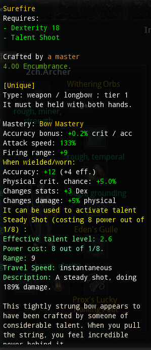>>21370 Урон луков зависит от силы и декса, поэтому прибавка к урону пойдёт только от декса через ПЕС. Если не брать ВШ, то не переживёшь вот это http://te4.org/wiki/Steady_shot_(talent) а если переживёшь(на высоком лвле), то у тебя низкий дамаг, с таким только нормал проходить.