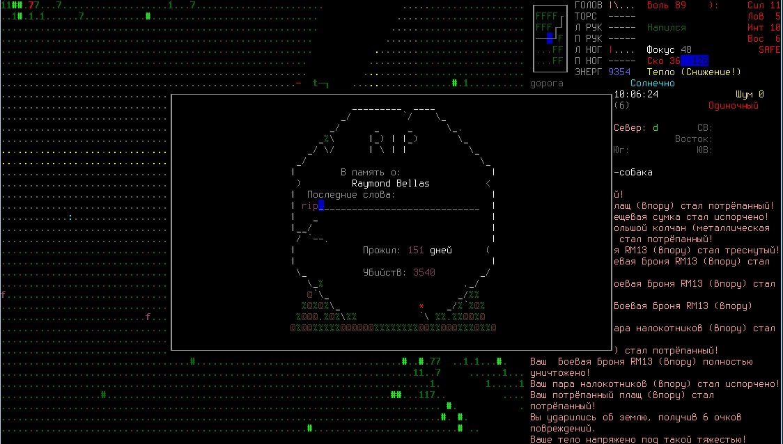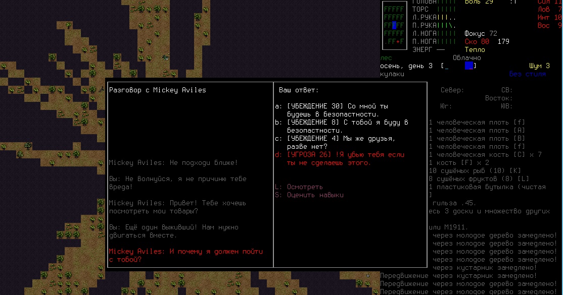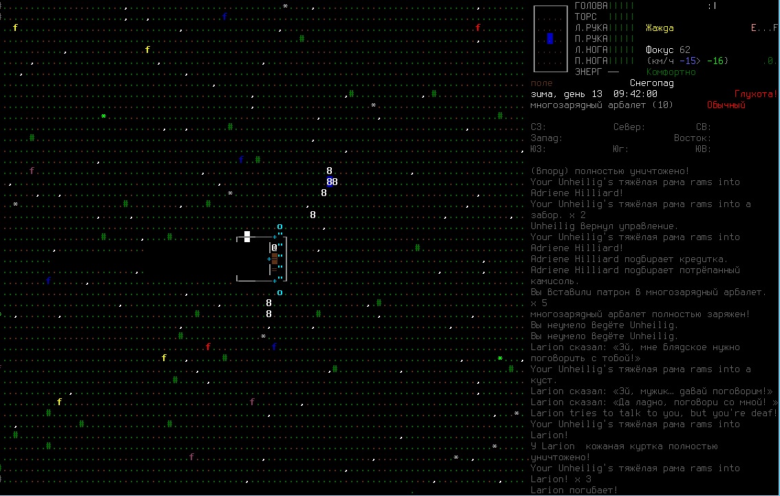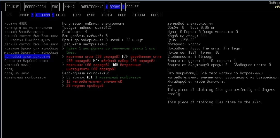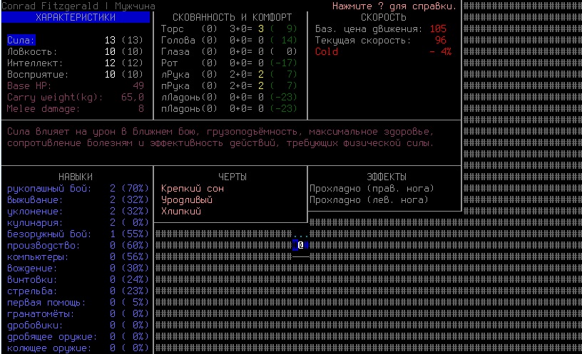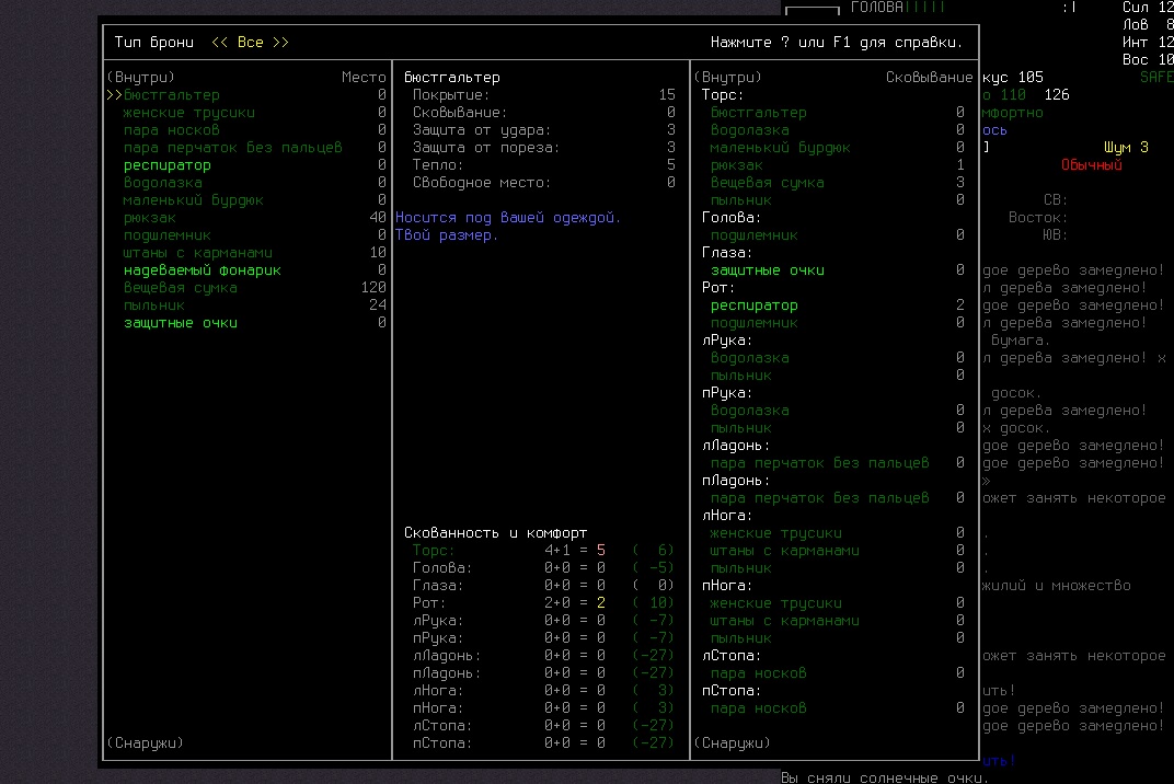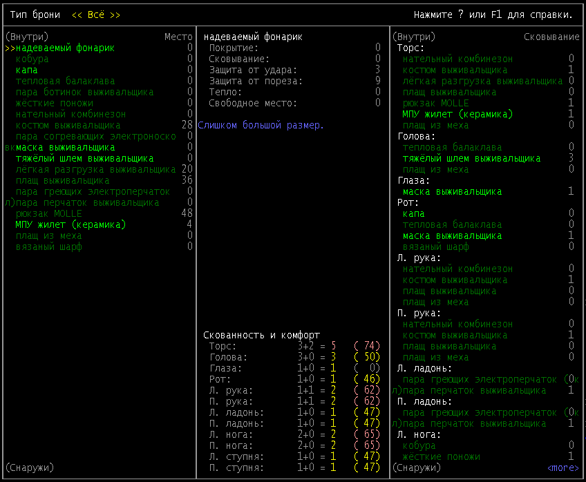 >>2004 В начале игры это самый вместительный предмет одежды, если рюкзака нету. Ну и я из лука стрелял, но все равно он меня за 2 хода отпиздил. Не знаю как быть с одеждой, нужно утеплять каждую часть тела, иначе персонаж мерзнет и получает штрафы к скорости, а когда приоденешься, то сковывает сильно, да.