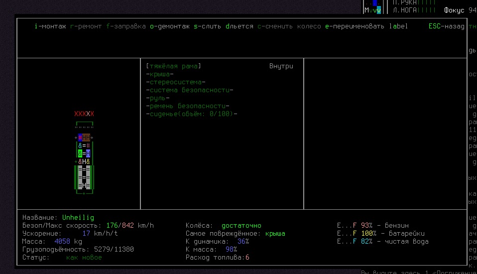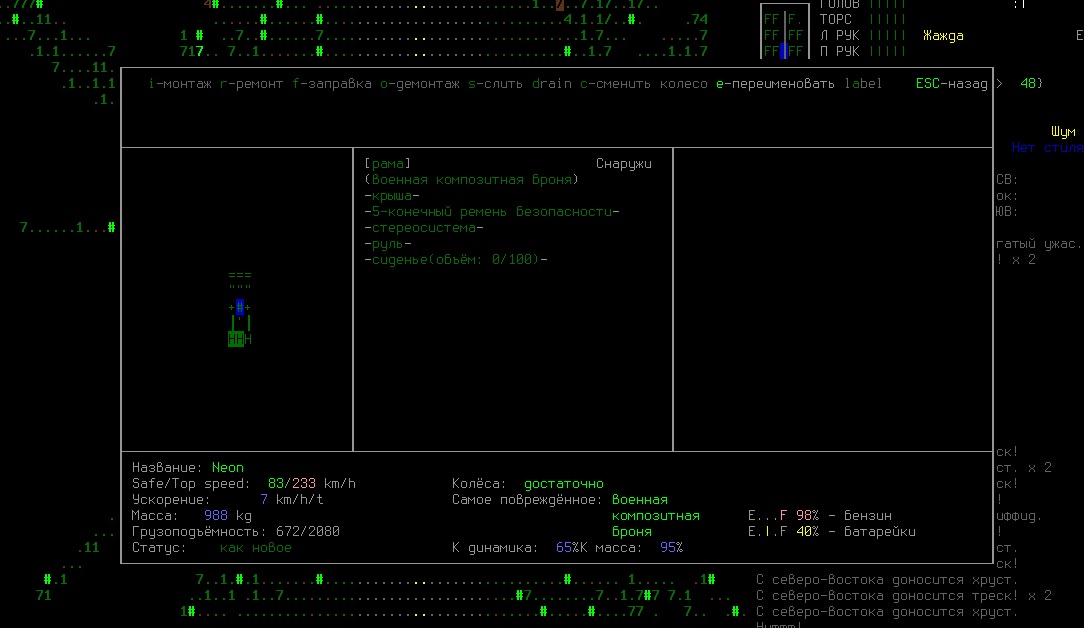 и да, 3 сиденья потому что это машина. А вообще я не хочу ставить панели на крышу и электромотор, потому что весь интерес тогда убьётся вообще. Так хоть по городам рыщешь в поисках бенза, накатываешь километры. Мне сычевальни огородные вообще не по нраву. Я приключения люблю :3. Кстати вопрос: периодически пропадает из одежды тепловой энерго костюм (outfit чтото там). Уже 3 пропало, я заебался их каждый раз крафтить.