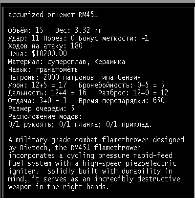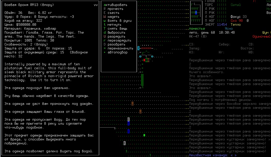 >>1935 А это формально не силовая броня, у них некоторые различия есть: силовая броня надевается на голое тело и питается либо от УБП, либо от твоей бионики. А это не силовая :). Её можно заряжать только плутониевыми батарейками. 10 батареек дадут в ней 3000 единиц энергии. Когда она не активирована, у неё скованность равна двум и низкая защита. Когда включишь -- скованность пропадёт и включится куча защит: от радиации, от окружающей среды, ещё какие-то, показатель брони увеличится. Энергия довольно быстро тратится, но ты можешь спокойной бегать с вырубленной бронёй и включать во время драк. Крутая штука. Мне попадалась не впору, со скованностью 3 и во включенном режиме с 1, но она всё равно того стоит.