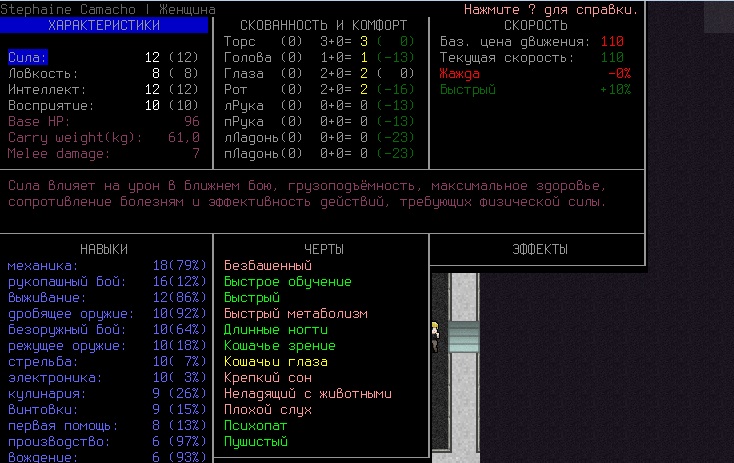 >>2633 Ну, что я могу посоветовать (полтора года не играл, снова начал, но большинство вещей осталось в силе). Бери стандартного перса, без выпендрежей начинай в убежище. Очень жирные перки (суровое имхо) - Fleet-footed и Quick - помогают с самого начала игры закидывать зомбей говном с безопасного расстояния. Жирные антиперки - Truth teller (врать нужно ОЧЕНЬ редко, либо вообще никогда, если неписи отключены), Ugly (по той же причине). Еще норм долгий сон (не помню как по англу) и Mood swings.