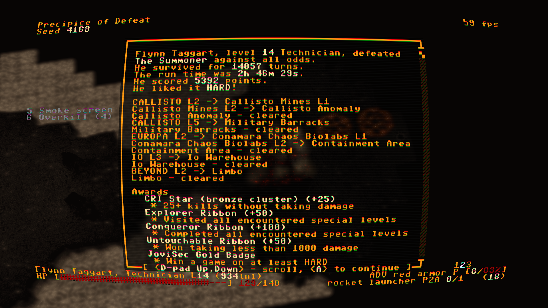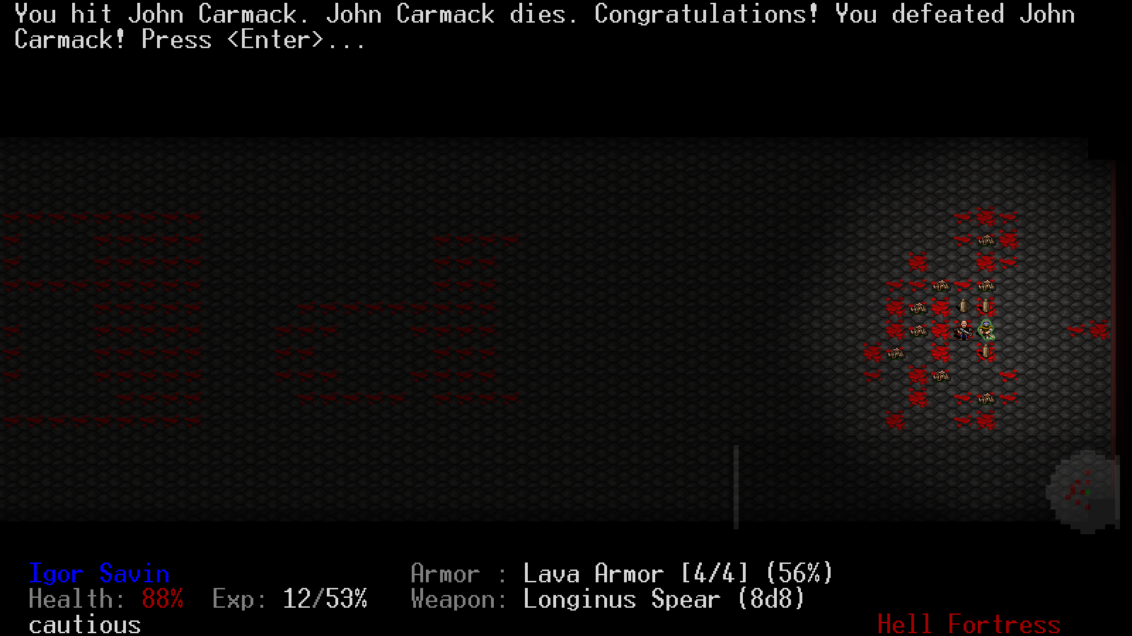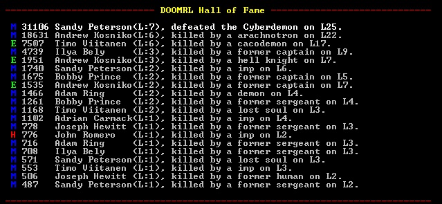 DoomRL - лучший кофебрейк рогалик в мире, или, по крайней мере, один из лучших. Сделан по одному из известнейших FPS в мире - по Doom'у. Если хочется сыграть в рогалик, но не хочется [/s]переустанавливать шиндовс[/s] баттхертить от проёбанного персонажа, за которого гамали 5/10/15/9000 часов, то этот рогалик - отличный выбор, так как максимальная длительность этого рогалика составляет 2-3 часа.