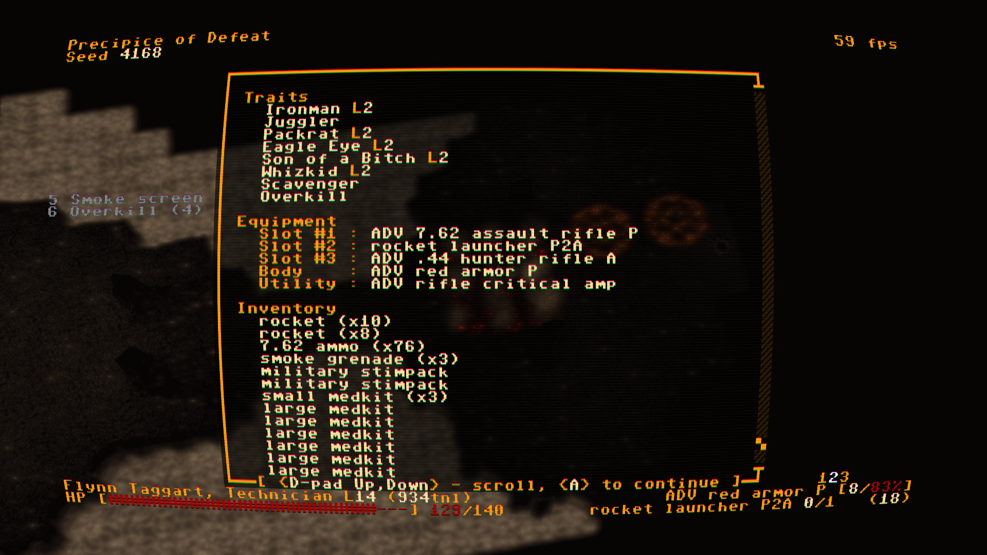 >>34892 Игра ещё развивается и довольно активно - возможно, с релизом 1.0 отставание от DmRL не таким сильным будет. Полгода назад и половины того, что сейчас есть не было. Диагонального движения не хватает, да, особенно в плане дверей. Бензопила есть, но даётся довольно поздно и редко. Претензия к T/F непонятная - T сейчас себя ведёт ровно так же, как F в DRL, а F - выстрел по ближайшему врагу, можно и не пользоваться в принципе. Последнего врага искать заёбывает, но как и в DRL примерное местоположения можно по звуку определить. Вот чего хотелось бы - возможности камеру крутить и отдалять-приближать свободно, пока только в менюшке енастройка есть. И о "кинематографичных" добиваний, как в XCom, можно помечтать - но такого скорее всего не будет.