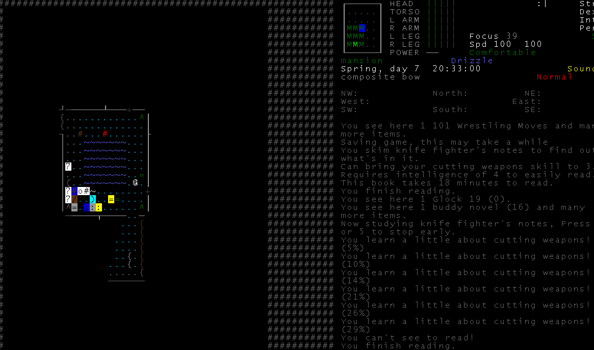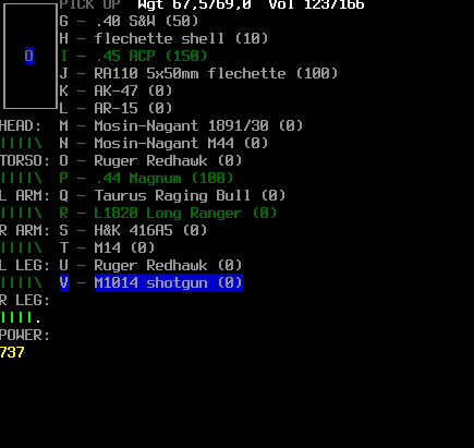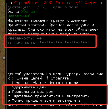 >>1171 >Hit 'f', this brings up the targeting/aiming menu. Said menu has instructions, but a quick rundown: Hit '.' to spend a small amount of time (a second or so) aiming, the "confidence" and "steadiness" bars should advance a bit. "Confidence" is your character's evaluation of how likely they are to hit, the '|'s indicate chances of an ordinary hit, the '+'s indicate chance of a "good" hit, and the ''s are the chances of a headshot. "Steadiness" is how close you are to having the best aim you can for the weapon you're using. Once it's full, it's not going to get any better no matter how long you keep aiming, though confidence will tend to go up as monsters get closer to you. Hit 'f' to fire with your current aim level. Hit 'a', 'c' or 'p' to aim until you reach some level of steadiness and then fire. The level is determined by which one you pick, obviously(?).