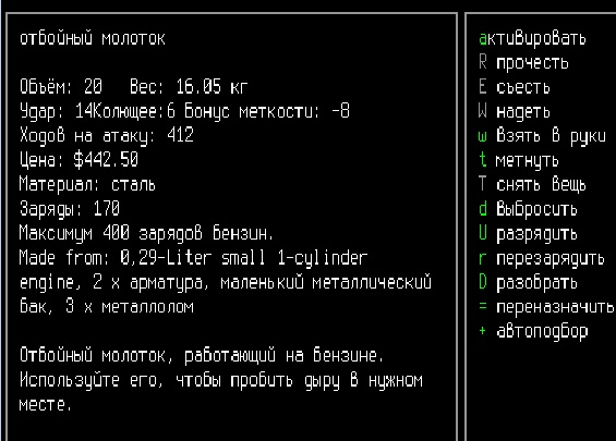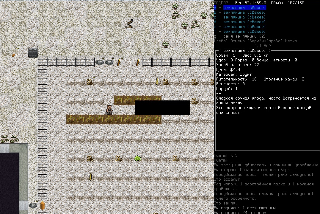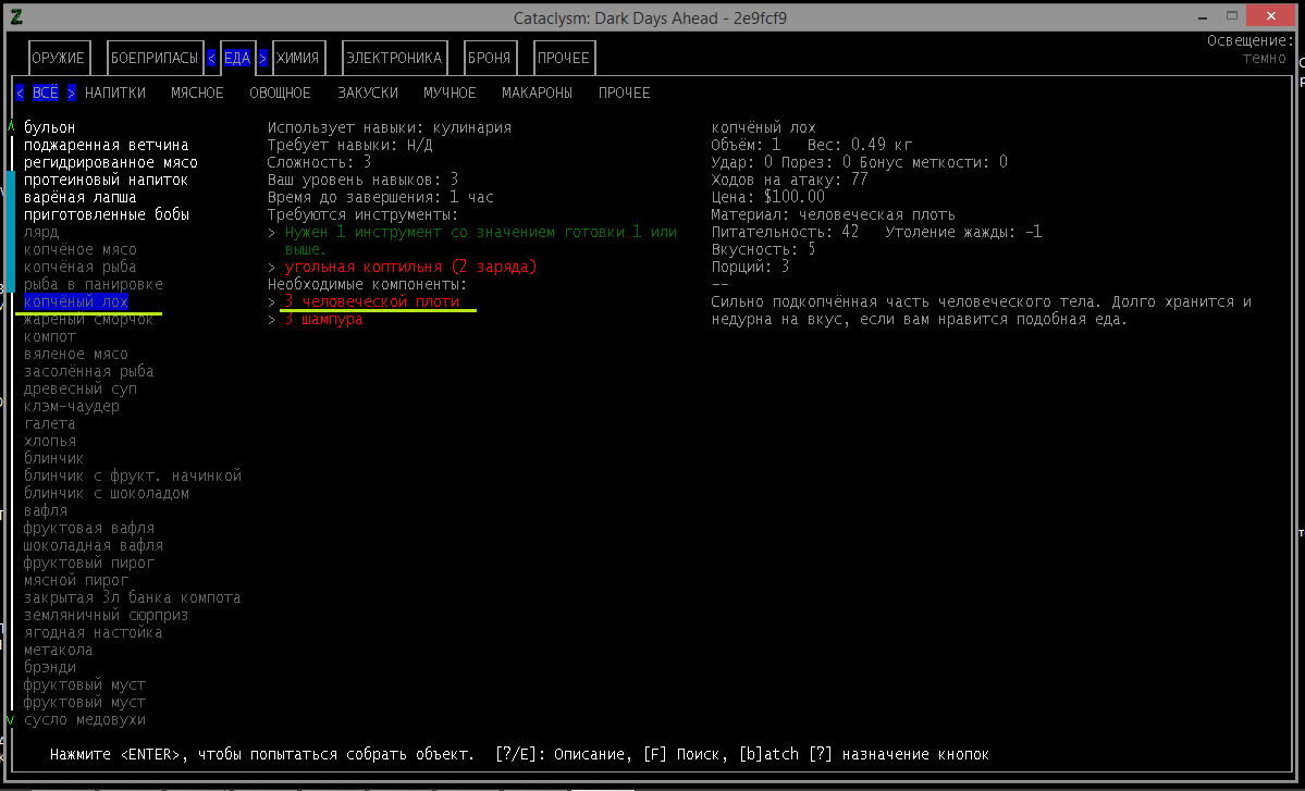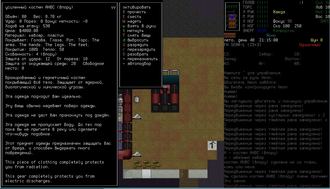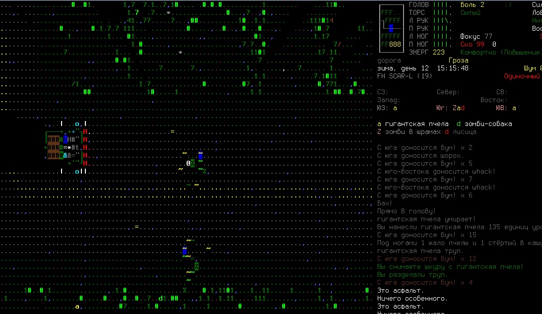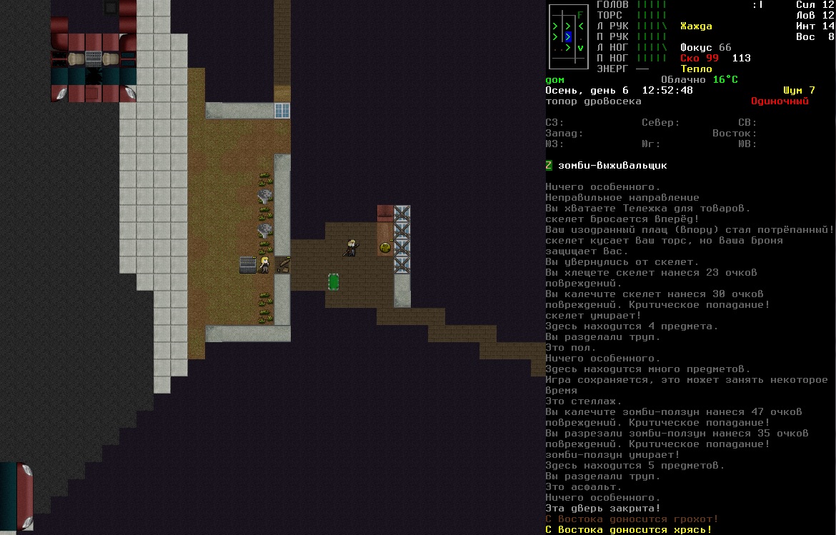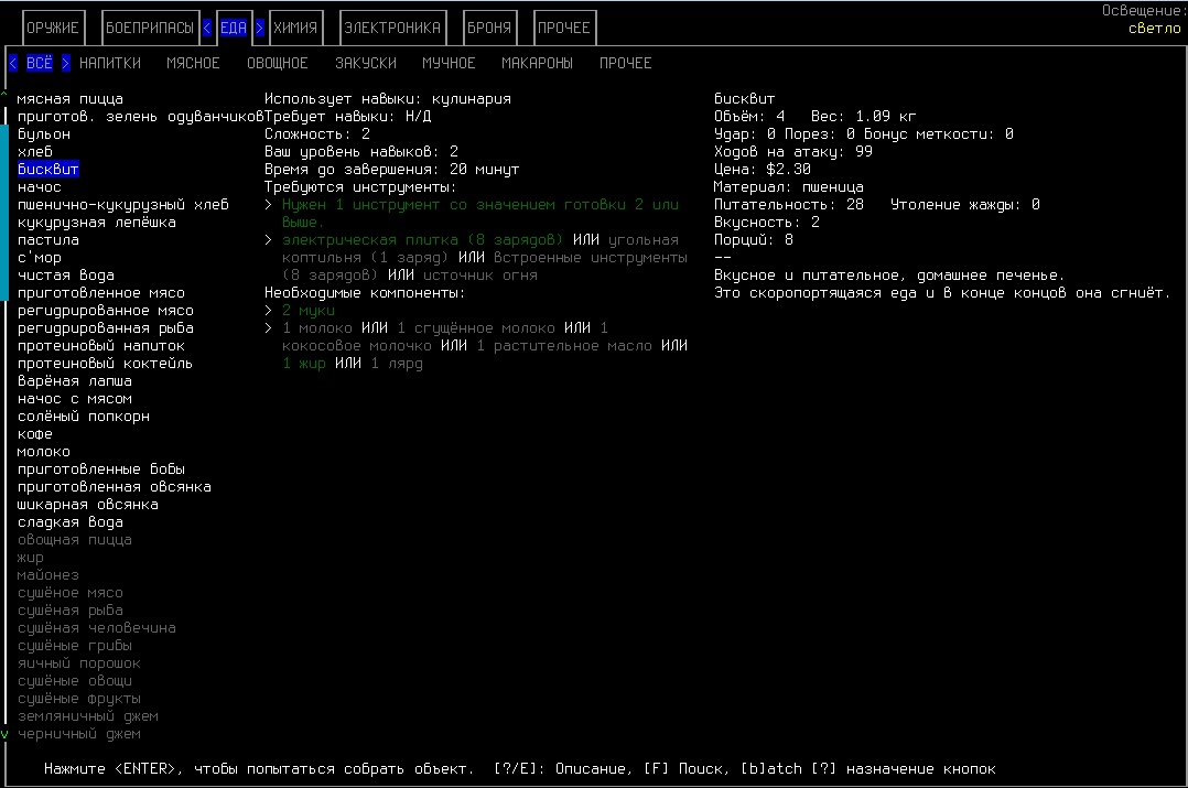 >>1152 >1. Как двигать вещи, например шкафом забаррикадировать дверь? Жмешь "G" и указываешь тайл с предметом, который хочешь двигать, появится сообщение что персонаж ухватил что-то там, например шкаф. И дальше стрелочками уже указываешь, куда его передвинуть с его первоначального тайла. Дверь забаррикадировать не выйдет, по условиями игры двери куда-то в стену задвигаются, лол. Можно заставить всякими шкафами тайлы, прилегающие к дверям, но зомбач, выбив дверь, будет ломать уже эти шкафы. >2. Как готовить и разогревать жратву? Допустим у меня есть мясная нарезка в пакете. Из пакета я ее вытащил, а дальше? Нужно ли класть в инвентарь сковородку, или еще как-нибудь? Короче опишите процесс готовки, если не трудно. Жмешь "&", открывается меню крафта и рецептов, вверху есть категория Food, там все жратва и напитки. Не помню, есть ли рецепты с мясной нарезкой или её полагается жрать как она есть. Необходимые инструменты и ингредиенты для готовки и крафта не обязательно иметь в инвентаре, они могу находится на расстоянии 5 тайлов от тебя. Там, чистую воду можно создавать, не заходя в реку, а разведя костерок на её берегу. >Можно ли завешивать окна одеялами или чем-нибудь подобным? Если да, то как? Обычно окна в жилых домах идут уже с занавесками, задернуть занавеси можно кнопкой "с", которой обычно закрываешь двери. Алсо, можно выглядывать в занавешеное окно: подойди к нему, нажать клавишу "е" и выбрать тайл с окном. Если же ты в офисном здании, банке и т.д., то там окна представляют из себя просто прямоугольник стекла, занавесок там нет и чтобы они появились, окно надо разобрать, и собрать заново, установив занавески и карниз для них. если что, меню строительства открывается по клавише .