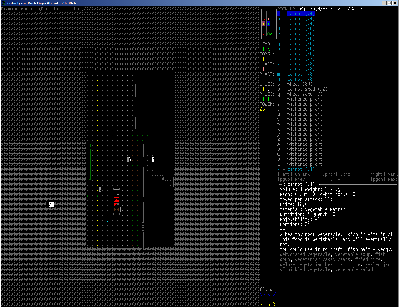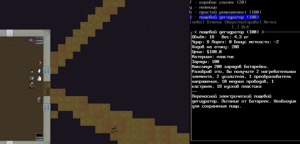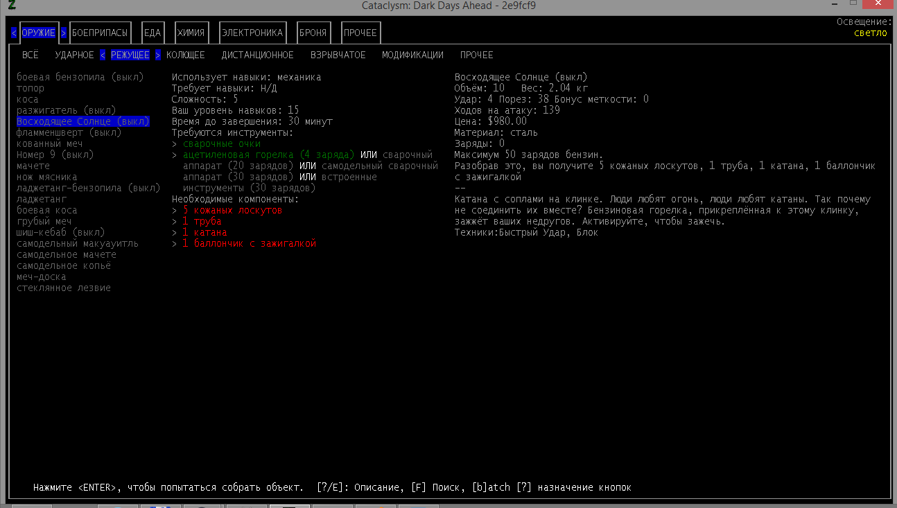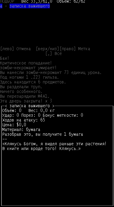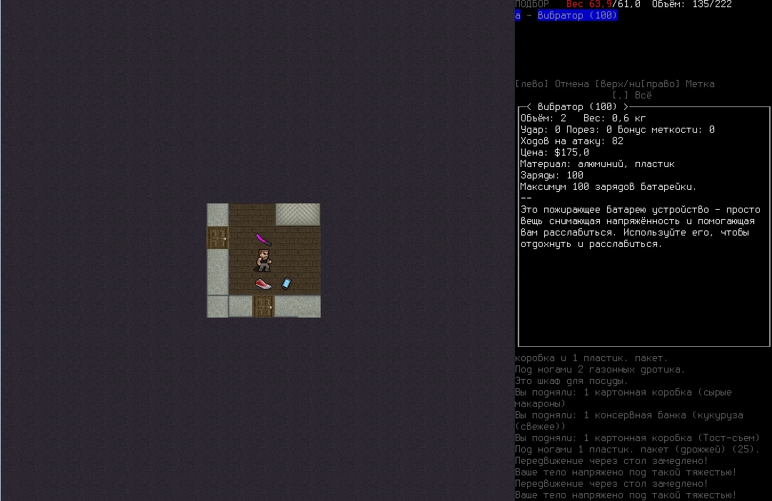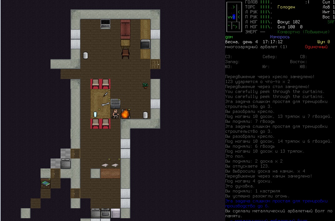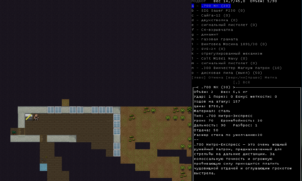 >>1152 >1. Как двигать вещи, например шкафом забаррикадировать дверь? Жмешь "G" и указываешь тайл с предметом, который хочешь двигать, появится сообщение что персонаж ухватил что-то там, например шкаф. И дальше стрелочками уже указываешь, куда его передвинуть с его первоначального тайла. Дверь забаррикадировать не выйдет, по условиями игры двери куда-то в стену задвигаются, лол. Можно заставить всякими шкафами тайлы, прилегающие к дверям, но зомбач, выбив дверь, будет ломать уже эти шкафы. >2. Как готовить и разогревать жратву? Допустим у меня есть мясная нарезка в пакете. Из пакета я ее вытащил, а дальше? Нужно ли класть в инвентарь сковородку, или еще как-нибудь? Короче опишите процесс готовки, если не трудно. Жмешь "&", открывается меню крафта и рецептов, вверху есть категория Food, там все жратва и напитки. Не помню, есть ли рецепты с мясной нарезкой или её полагается жрать как она есть. Необходимые инструменты и ингредиенты для готовки и крафта не обязательно иметь в инвентаре, они могу находится на расстоянии 5 тайлов от тебя. Там, чистую воду можно создавать, не заходя в реку, а разведя костерок на её берегу. >Можно ли завешивать окна одеялами или чем-нибудь подобным? Если да, то как? Обычно окна в жилых домах идут уже с занавесками, задернуть занавеси можно кнопкой "с", которой обычно закрываешь двери. Алсо, можно выглядывать в занавешеное окно: подойди к нему, нажать клавишу "е" и выбрать тайл с окном. Если же ты в офисном здании, банке и т.д., то там окна представляют из себя просто прямоугольник стекла, занавесок там нет и чтобы они появились, окно надо разобрать, и собрать заново, установив занавески и карниз для них. если что, меню строительства открывается по клавише .