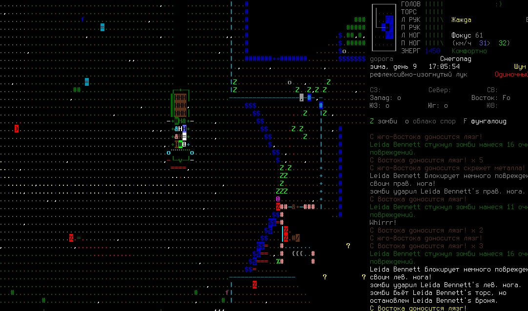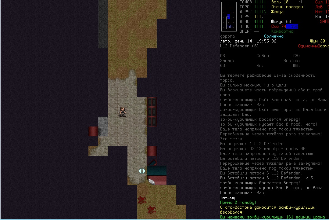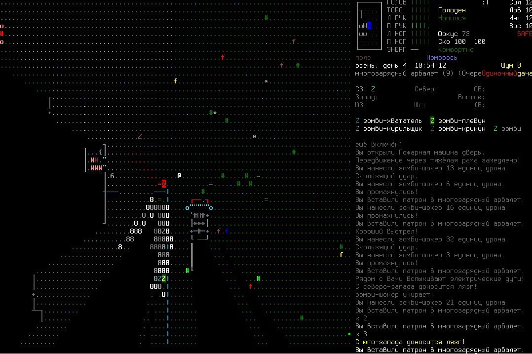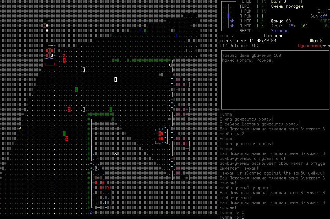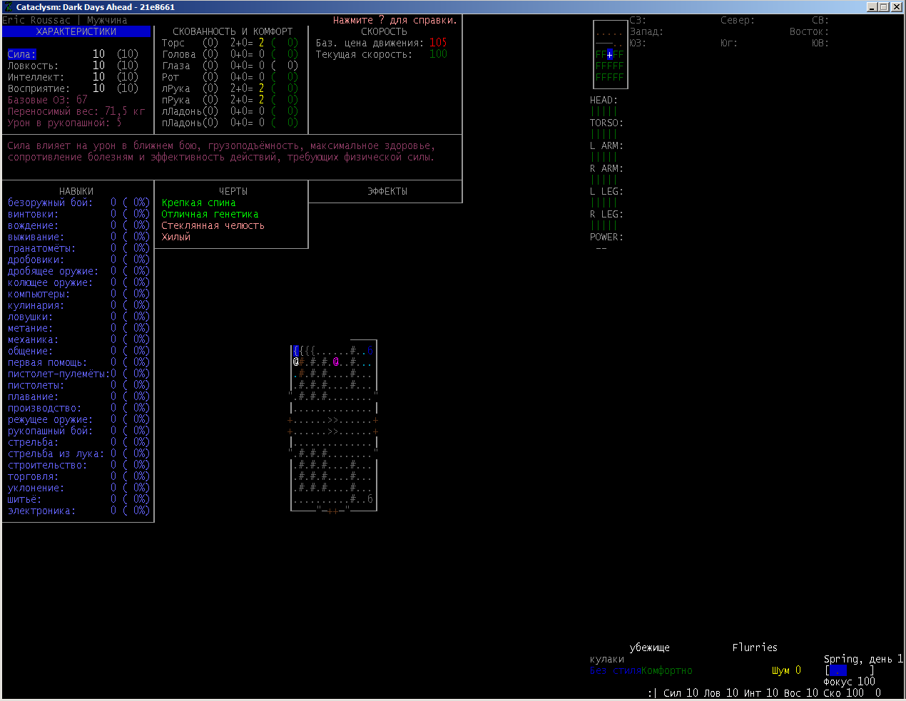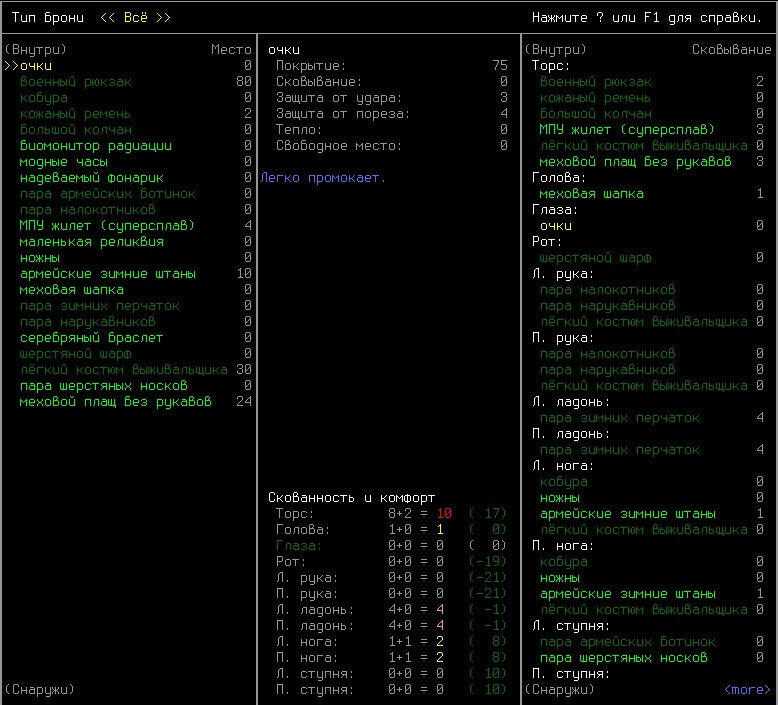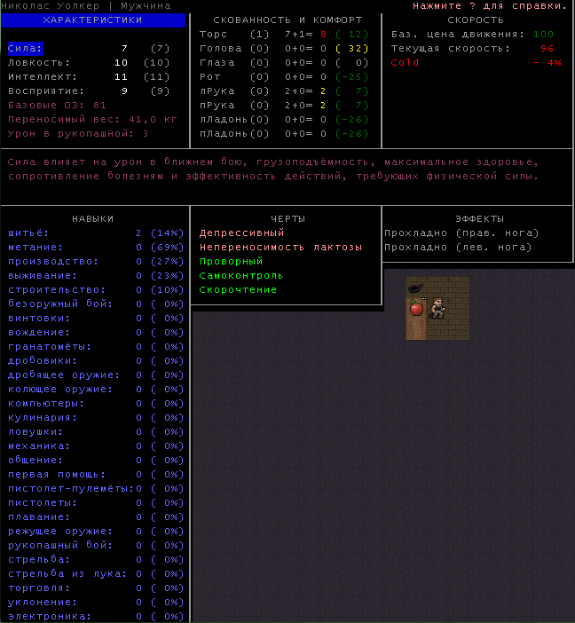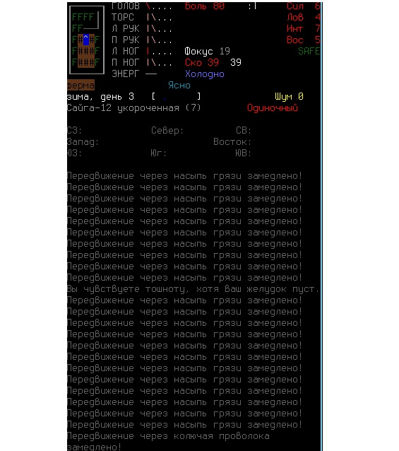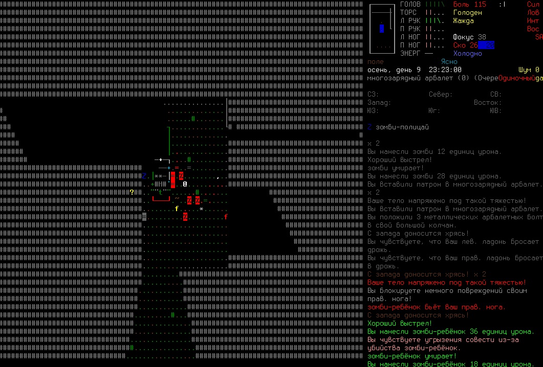 >>1210 >Поясните за скорость и за скованность, А что, в руссковики разве нет описания? Попробую пояснить за скорость, хотя играю на англике и без тайлов Собсна открываешься статы своего персонажа и смотришь в правую верхнюю колонку. Скорость - это количество очков действия, которые тебе выдаются в начале каждого хода. Очки дествия тратятся как на передвижение, так и на разные действия, крафт и т.д. Обычное значение скорости составляет 100 очков, может снижаться от боли, усталости, голода, жажды, и т.д., а повышаться стимуляторами и наркотиками Базовая цена движения - это количество очков, которые ты тратишь на перемещение с тайла на соседний тайл по ровной поверхности. Перемещение по перекопанной земле, заборам, руинам и т.д. удваивает и утраивает цену передвижения. Один ход занимает 6 секунд игрового времени. Если скорость превышает цену движения, то ты можешь передвигаться чуть быстрее - например, пройти 5-6 тайлов за 4 хода, если же цена превышает скорость - то ты тратишь все очки за этот ход и часть очков уже на следующем ходу, таким образом проходишь меньшее число тайлов за большее число ходов. Скованность - показатель затруднения разных частей тела одеждой или прочими факторами. Скованность торса снижает навыки ближнего боя и уворота, скованность глаз снижает восприятие при стрельбе, метании и проверке местности на ловушки и т.д. Касательно цены движения, то на неё воздействует скованность ног, стоп и рта. Тяжелые боты не по размеру, такие же кожаные штаны и противогаз явно не способствуют быстрому бегу. Подробнее эффекты от скованности можно увидеть на верхней средней колонке в окне статов персонажа. Таким образом, если ты сильный милишник, сперший рыцарские доспехи, латные боты и металлические наколенники с мечем из соседнего особняка, то тебе в бою выгодно поменьше двигаться, так как за время, нужное тебе для перемещения, почти любой зомбач тебя догонит и прегонит, не забывая укусить, лучше стоять на одном тайле, проспуская ходы и дожидаясь пока к тебе подойдут по одному. И наоборот, быстрый и верткий милишник под спидами и на кофеине может пользоваться тактикой ударил-убежал, нанося удар и уходя на другой тайл, пока противник тратит свою скорость на передвижение. Также популярно заманивание противника в кусты и оконные проемы, где он тратит несколько ходов на перемещение и в это время его можно безнаказанно бить и унижать. Подробнее эффекты от скованности можно увидеть на верхней средней колонке в окне статов персонажа. Переключаться между колонками можно клавишей ТАВ, выбирать нужные показатели в колонке можно стрелочками.