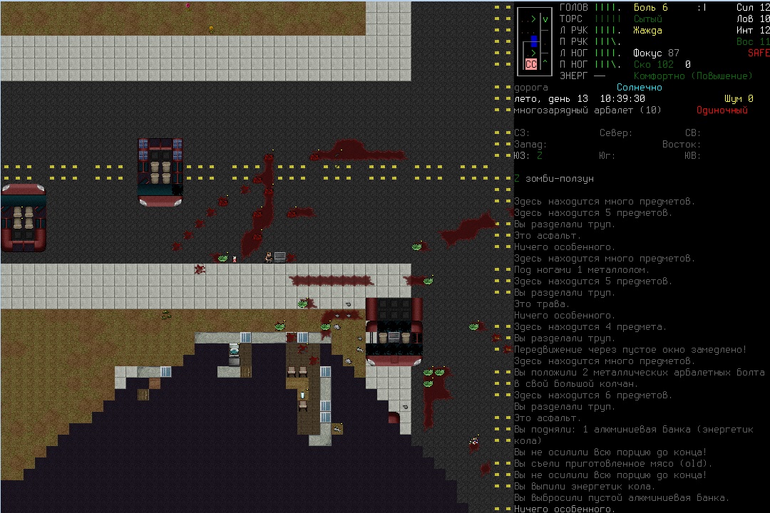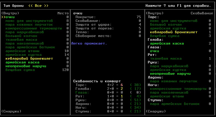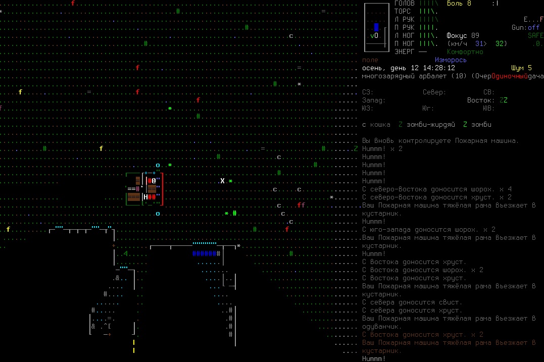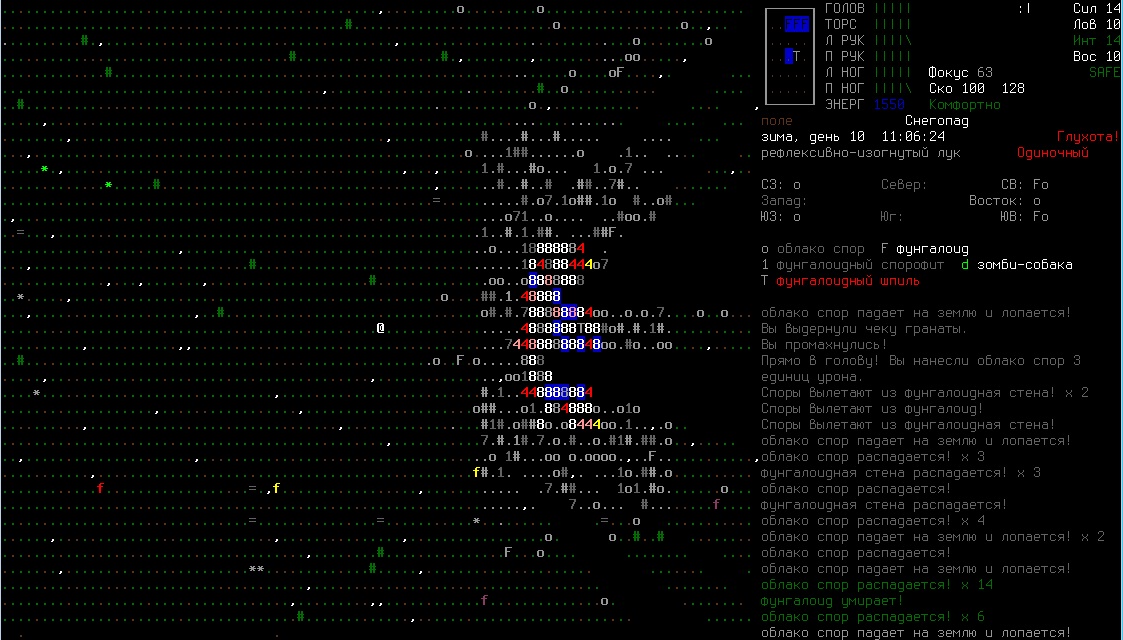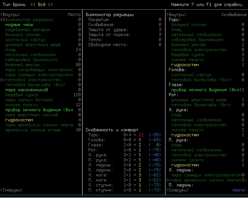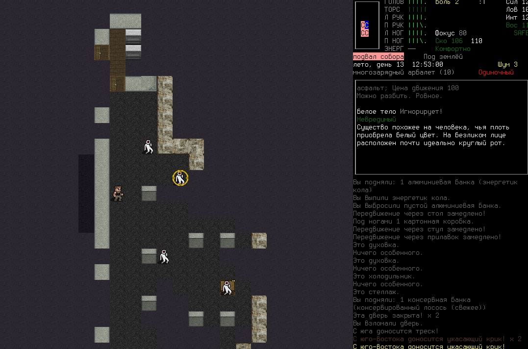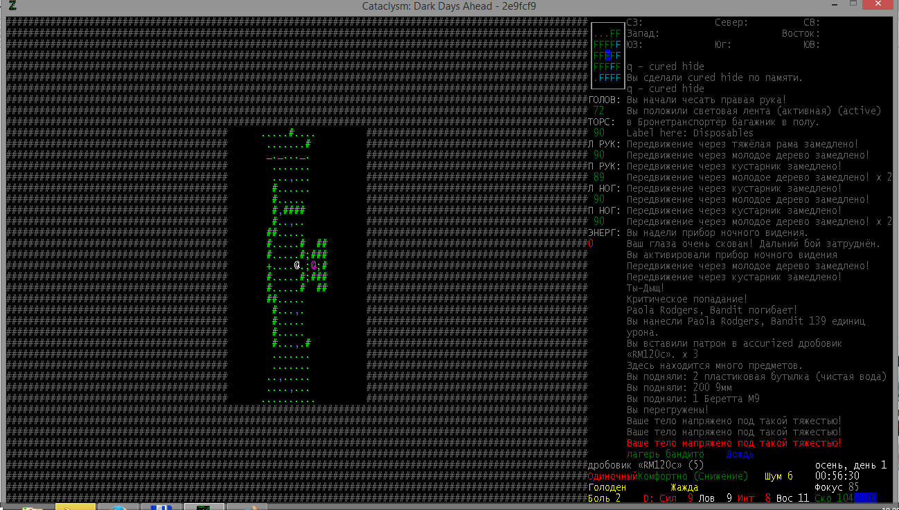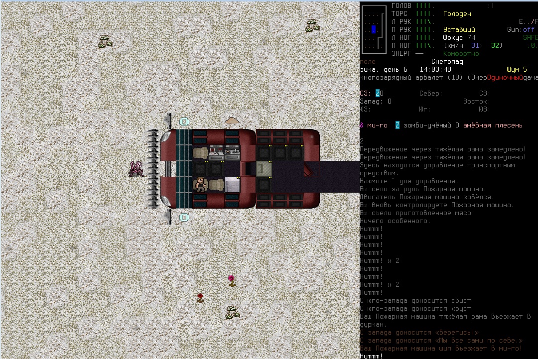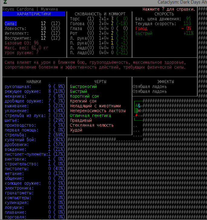 >>1210 >Поясните за скорость и за скованность, А что, в руссковики разве нет описания? Попробую пояснить за скорость, хотя играю на англике и без тайлов Собсна открываешься статы своего персонажа и смотришь в правую верхнюю колонку. Скорость - это количество очков действия, которые тебе выдаются в начале каждого хода. Очки дествия тратятся как на передвижение, так и на разные действия, крафт и т.д. Обычное значение скорости составляет 100 очков, может снижаться от боли, усталости, голода, жажды, и т.д., а повышаться стимуляторами и наркотиками Базовая цена движения - это количество очков, которые ты тратишь на перемещение с тайла на соседний тайл по ровной поверхности. Перемещение по перекопанной земле, заборам, руинам и т.д. удваивает и утраивает цену передвижения. Один ход занимает 6 секунд игрового времени. Если скорость превышает цену движения, то ты можешь передвигаться чуть быстрее - например, пройти 5-6 тайлов за 4 хода, если же цена превышает скорость - то ты тратишь все очки за этот ход и часть очков уже на следующем ходу, таким образом проходишь меньшее число тайлов за большее число ходов. Скованность - показатель затруднения разных частей тела одеждой или прочими факторами. Скованность торса снижает навыки ближнего боя и уворота, скованность глаз снижает восприятие при стрельбе, метании и проверке местности на ловушки и т.д. Касательно цены движения, то на неё воздействует скованность ног, стоп и рта. Тяжелые боты не по размеру, такие же кожаные штаны и противогаз явно не способствуют быстрому бегу. Подробнее эффекты от скованности можно увидеть на верхней средней колонке в окне статов персонажа. Таким образом, если ты сильный милишник, сперший рыцарские доспехи, латные боты и металлические наколенники с мечем из соседнего особняка, то тебе в бою выгодно поменьше двигаться, так как за время, нужное тебе для перемещения, почти любой зомбач тебя догонит и прегонит, не забывая укусить, лучше стоять на одном тайле, проспуская ходы и дожидаясь пока к тебе подойдут по одному. И наоборот, быстрый и верткий милишник под спидами и на кофеине может пользоваться тактикой ударил-убежал, нанося удар и уходя на другой тайл, пока противник тратит свою скорость на передвижение. Также популярно заманивание противника в кусты и оконные проемы, где он тратит несколько ходов на перемещение и в это время его можно безнаказанно бить и унижать. Подробнее эффекты от скованности можно увидеть на верхней средней колонке в окне статов персонажа. Переключаться между колонками можно клавишей ТАВ, выбирать нужные показатели в колонке можно стрелочками.