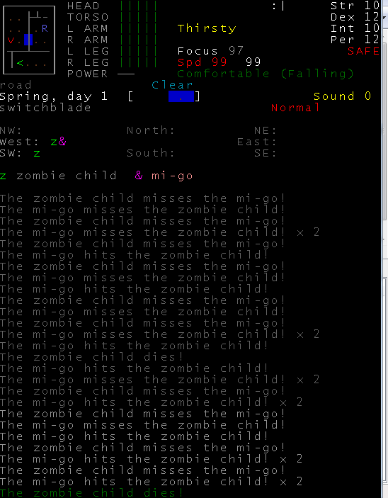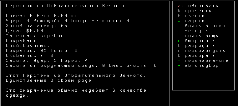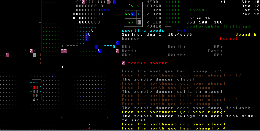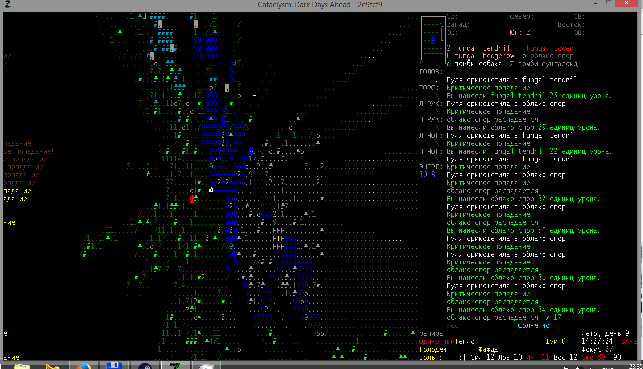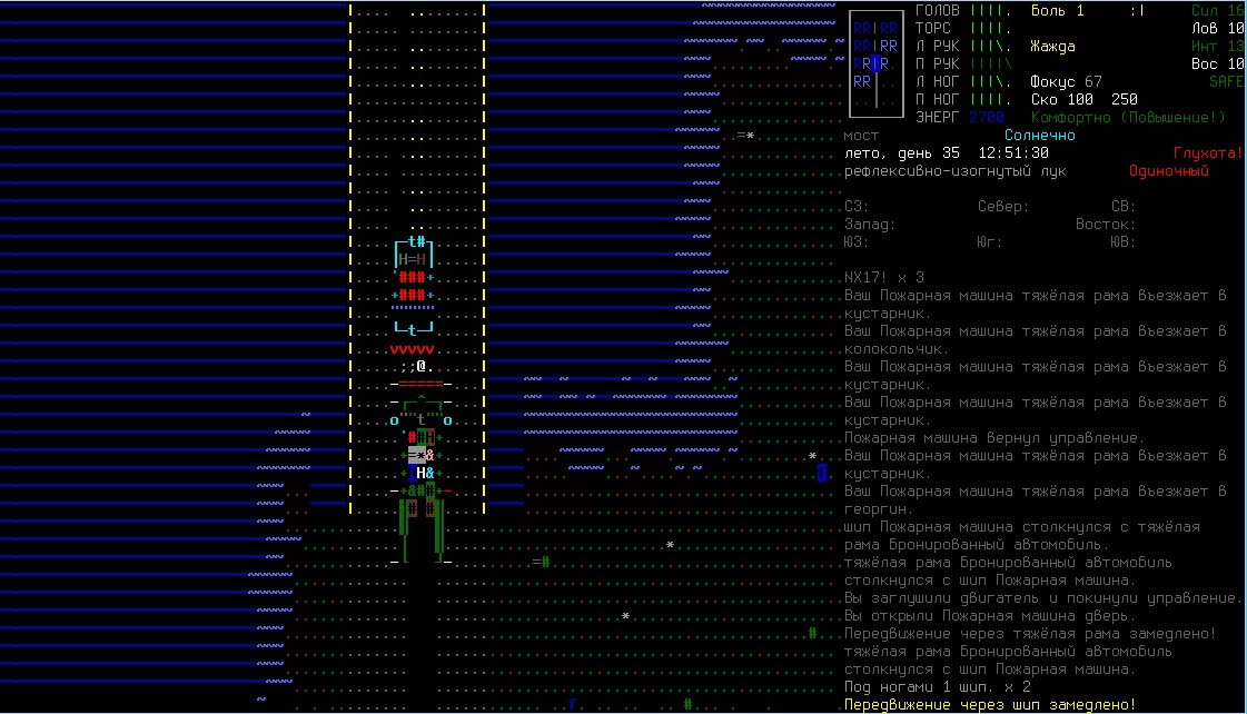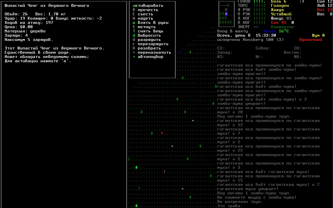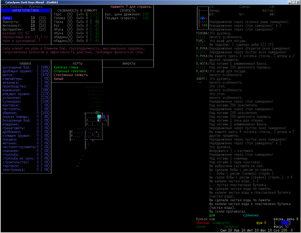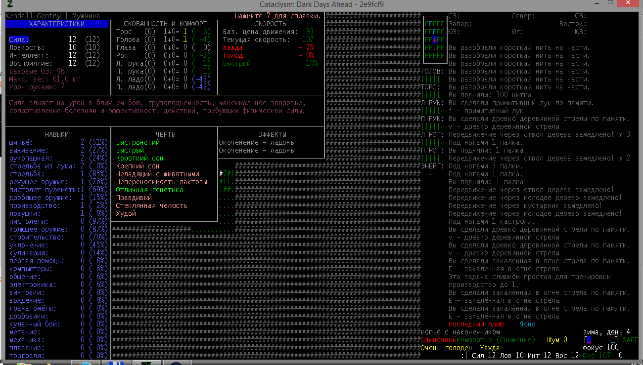>>1210 >Поясните за скорость и за скованность, А что, в руссковики разве нет описания? Попробую пояснить за скорость, хотя играю на англике и без тайлов Собсна открываешься статы своего персонажа и смотришь в правую верхнюю колонку. Скорость - это количество очков действия, которые тебе выдаются в начале каждого хода. Очки дествия тратятся как на передвижение, так и на разные действия, крафт и т.д. Обычное значение скорости составляет 100 очков, может снижаться от боли, усталости, голода, жажды, и т.д., а повышаться стимуляторами и наркотиками Базовая цена движения - это количество очков, которые ты тратишь на перемещение с тайла на соседний тайл по ровной поверхности. Перемещение по перекопанной земле, заборам, руинам и т.д. удваивает и утраивает цену передвижения. Один ход занимает 6 секунд игрового времени. Если скорость превышает цену движения, то ты можешь передвигаться чуть быстрее - например, пройти 5-6 тайлов за 4 хода, если же цена превышает скорость - то ты тратишь все очки за этот ход и часть очков уже на следующем ходу, таким образом проходишь меньшее число тайлов за большее число ходов. Скованность - показатель затруднения разных частей тела одеждой или прочими факторами. Скованность торса снижает навыки ближнего боя и уворота, скованность глаз снижает восприятие при стрельбе, метании и проверке местности на ловушки и т.д. Касательно цены движения, то на неё воздействует скованность ног, стоп и рта. Тяжелые боты не по размеру, такие же кожаные штаны и противогаз явно не способствуют быстрому бегу. Подробнее эффекты от скованности можно увидеть на верхней средней колонке в окне статов персонажа. Таким образом, если ты сильный милишник, сперший рыцарские доспехи, латные боты и металлические наколенники с мечем из соседнего особняка, то тебе в бою выгодно поменьше двигаться, так как за время, нужное тебе для перемещения, почти любой зомбач тебя догонит и прегонит, не забывая укусить, лучше стоять на одном тайле, проспуская ходы и дожидаясь пока к тебе подойдут по одному. И наоборот, быстрый и верткий милишник под спидами и на кофеине может пользоваться тактикой ударил-убежал, нанося удар и уходя на другой тайл, пока противник тратит свою скорость на передвижение. Также популярно заманивание противника в кусты и оконные проемы, где он тратит несколько ходов на перемещение и в это время его можно безнаказанно бить и унижать. Подробнее эффекты от скованности можно увидеть на верхней средней колонке в окне статов персонажа. Переключаться между колонками можно клавишей ТАВ, выбирать нужные показатели в колонке можно стрелочками.