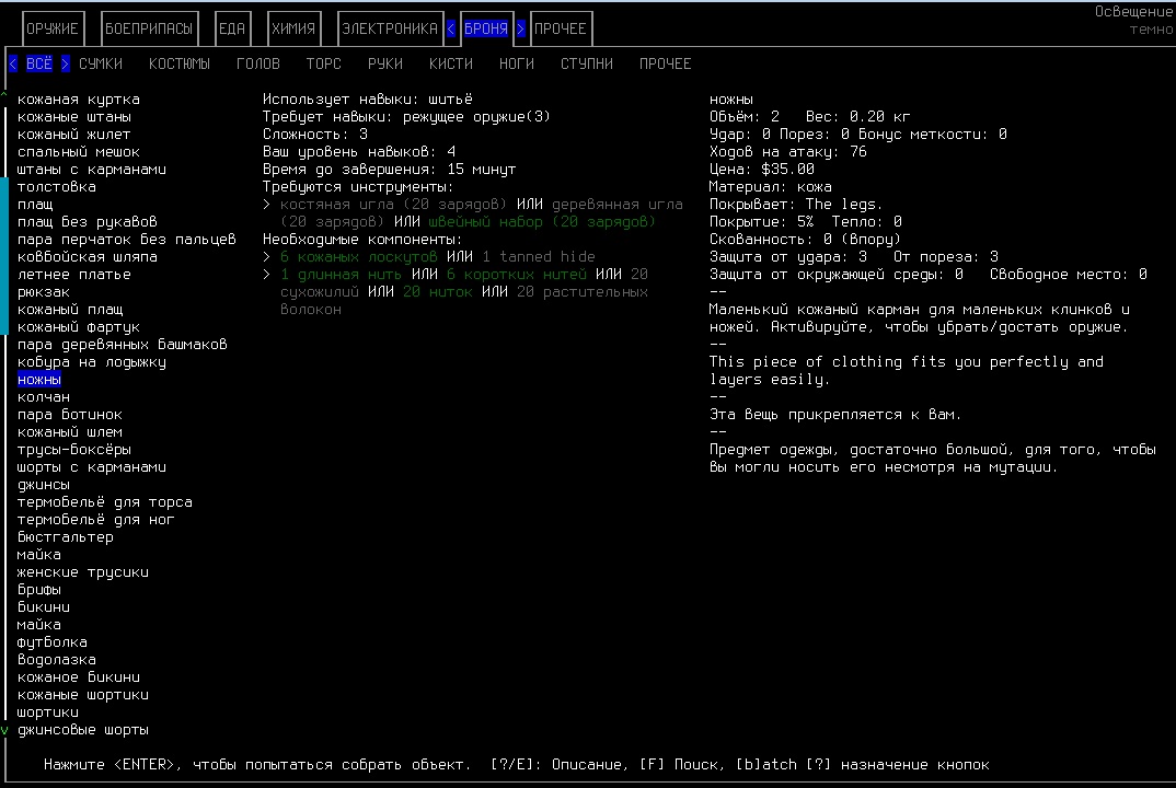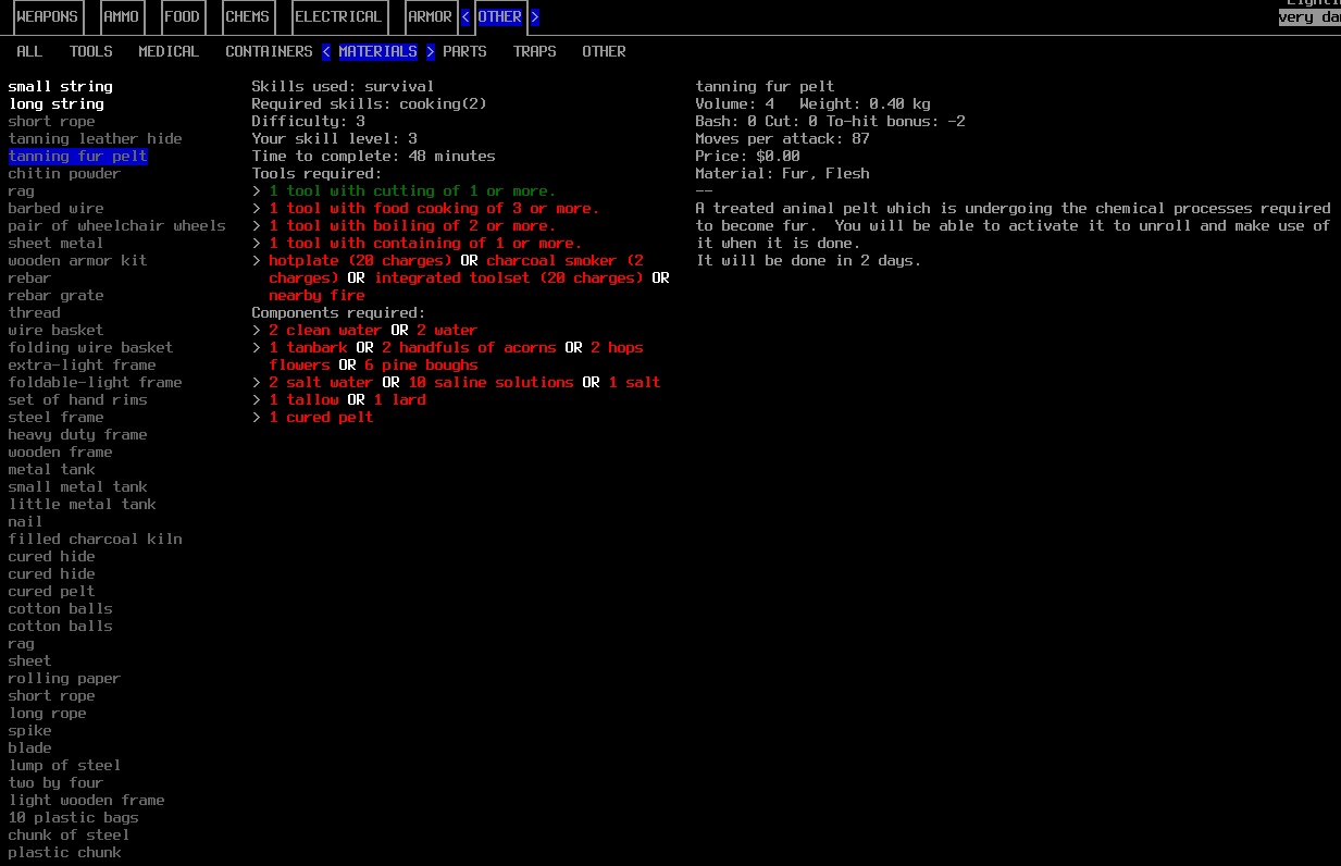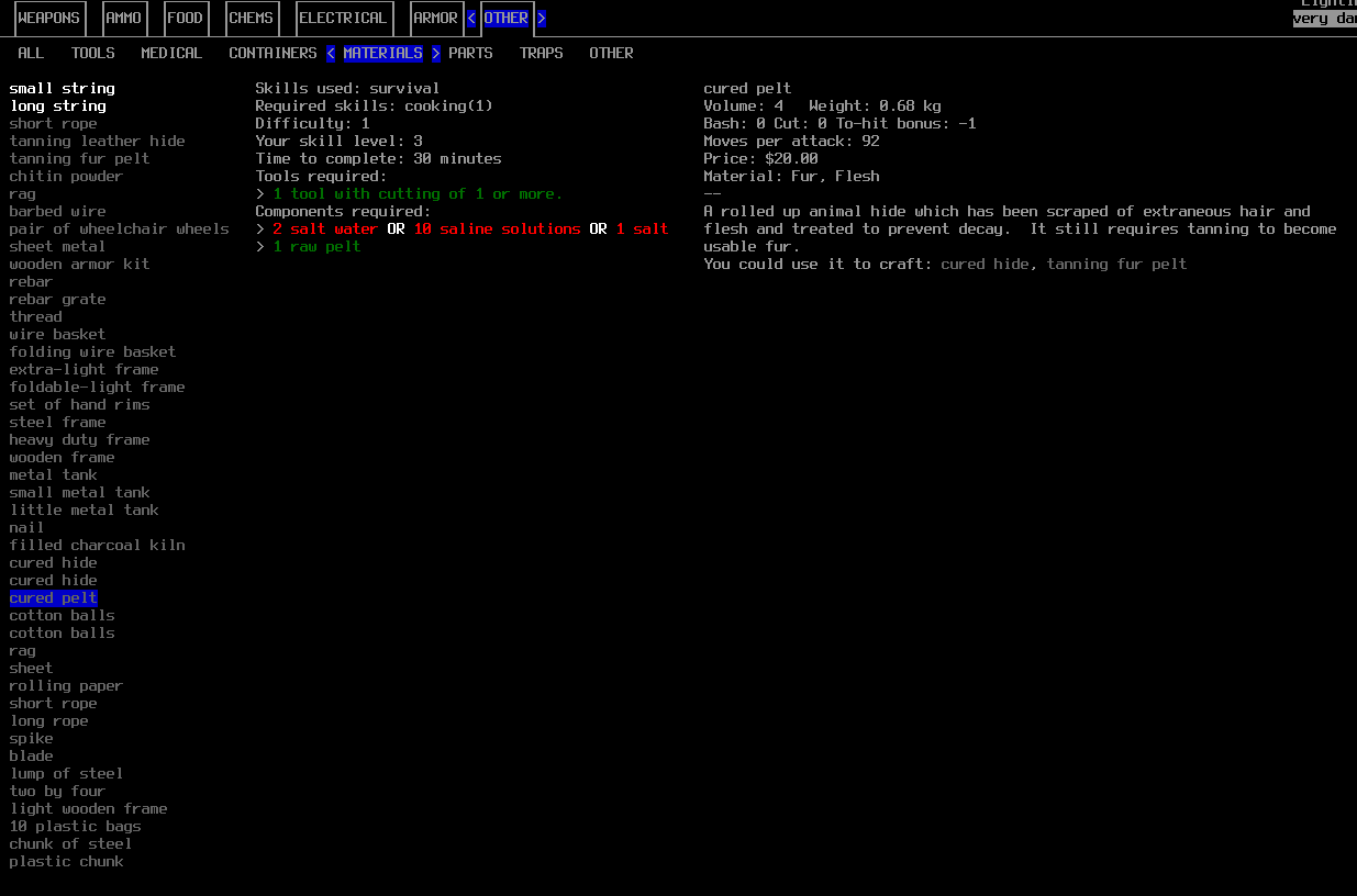 >>1748 В разделе "прочее" нужно искать. Сначала надо сделать из вырезанных шкур cured hide (кожа) или cured pelt (шкура). Потом из них ты делаешь tanning hide или tannig pelt. Последние должны полежать несколько дней, активируешь их и получаешь кожу либо мех. Навык выживания должен быть больше трёх, вроде бы. Из ингредиентов нужны: солёная вода, её на болотах много, жёлуди и сосновые ветки. Сосновные ветки собираешь с деревьев, которые выглядят как "4", а жёлуди валяются на земле обычно. Есть ещё вариант использования аспирина, но я не знаю как выучить тот рецепт.