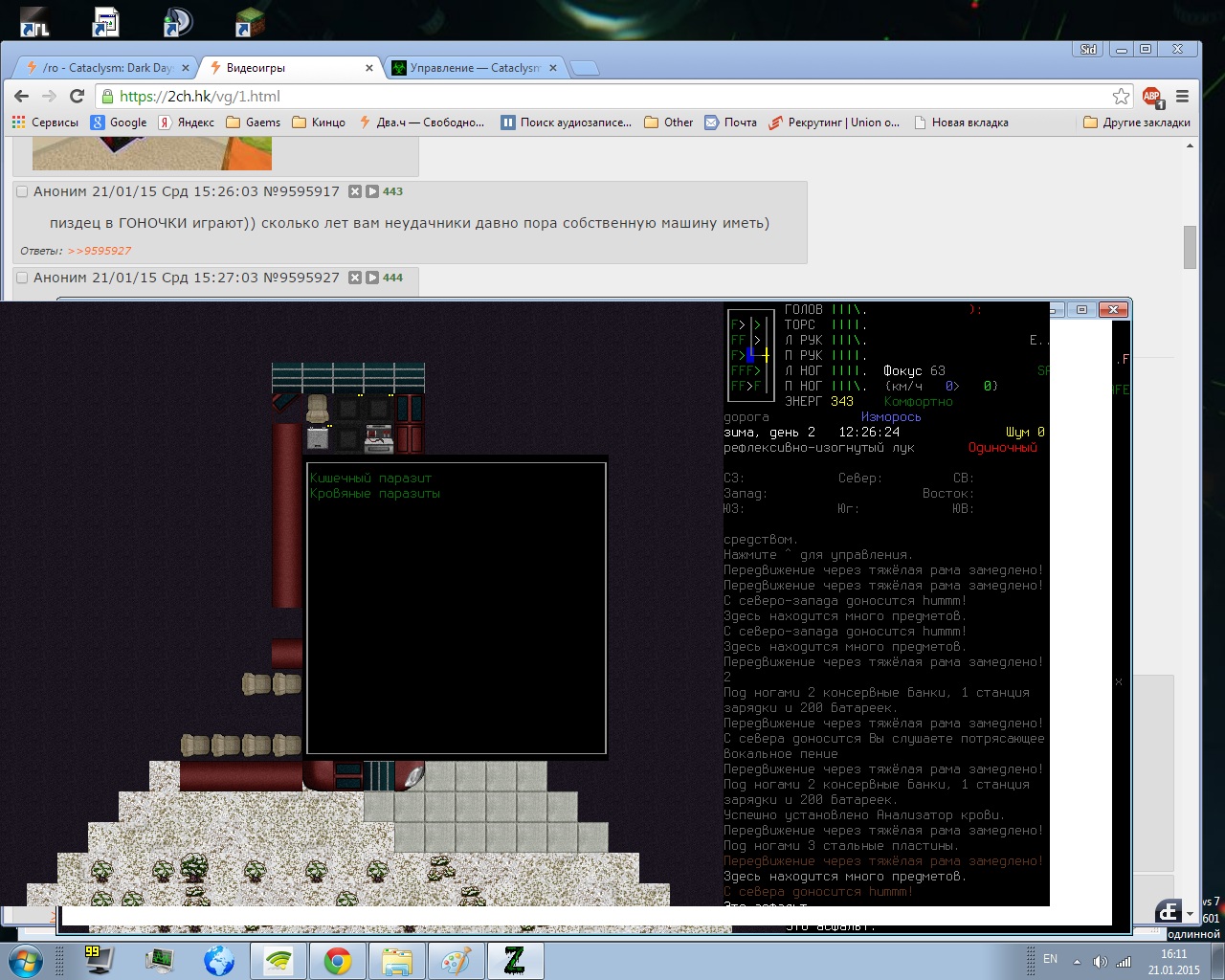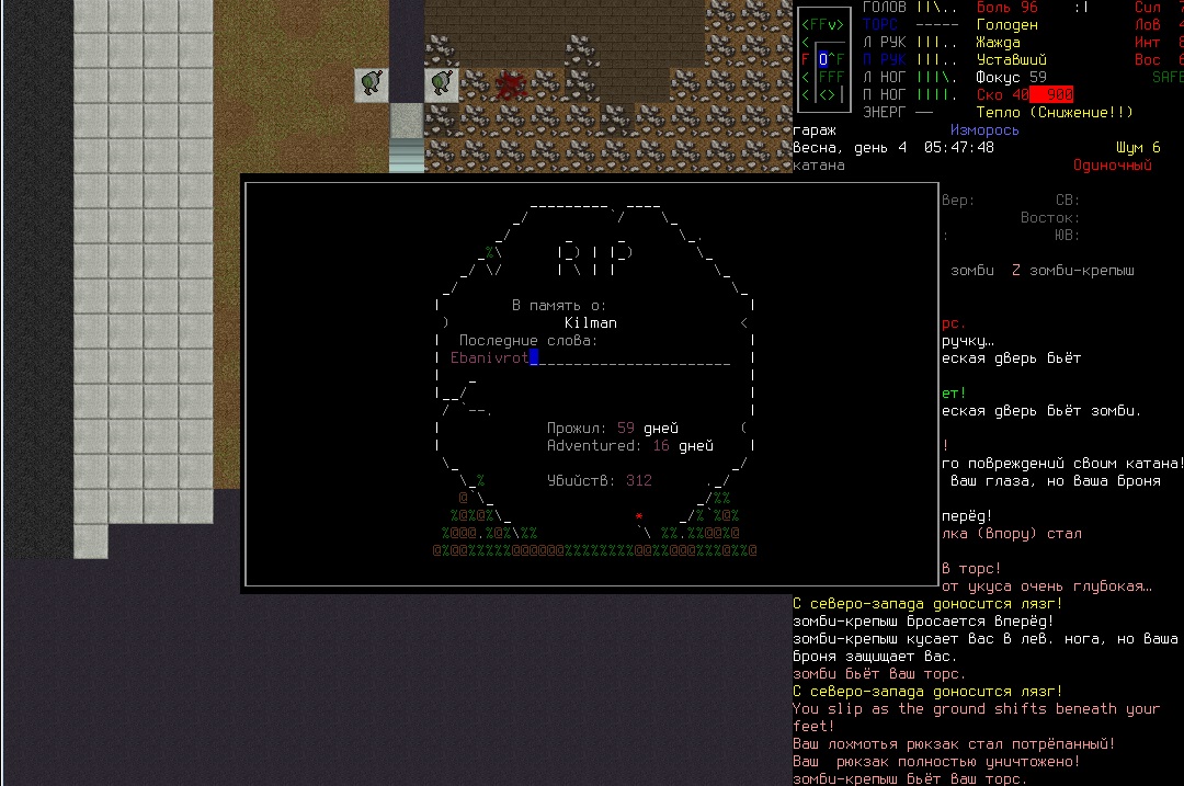 >>1102 Бро, а если бы я зашел на тот злосчастный склад хим. отходов в полном сете пожарника например меня бы колбасило или как? Помню только что одел маску с баллоном воздуха но был в обычном шмоте. вроде вот так обычно ходил, старый скрин. Вообще сейчас то ли сноровку потерял, то ли просто туплю, выжить не получается хоть и играю почти год. То в яму пизданусь, то свора собак откуда не возмись, то волки сраные, то зомбари окружат. Начал в подземном убежище, из припасов немного еды, дня на 2, вроде как полно воды из луж на полу, хз есть там у них ДНО, офигенная печка с дровами, топор и горсть гвоздей. Разобрал часть кровати на тряпки, сшил подшлемник, перчатки какие-никакие, плащь, вещевую сумку, люблю её хоть и дорого. Со мной на локации был бро, который поехавший совсем какой-то, шмалял во все что видел. При попытке с ним перетереть он, со словами "нет времени объяснять!", начинал шатать очередную зомбо-рысь и всяких рогатых ужосов, это обращенные лоси как я понял. Так вот ему не повезло, нарвался на зомбимедведа, который в последствии загнал меня под шконарь в убежище, слава богу нашел какой-то пистолет, ему много не надо было, бро уже большую часть хп снял. Пришлось полутать останки бро на предмет одежды, холодно было люто, только печка спасала. На карте заметил такое же убежище немного на запад через лес, решил пойти ночью. Пока шел- простыл, а это, если мне не изменяет память, та еще головная боль с вечным недосыпом и кашлем, тем более медикаментов не было и город на карте не видать. От безысходности поплёлся в рандомном направлении прихватив припасы, около пятнадцати минут шел на север, нашел какой-то дом, решил заночевать, дурень. То, что меня растолкал халк надеюсь понятно, дом был на краю города и выйти через окно я не смог. Вот по глупости и умирают так, не за хвост собачий.
